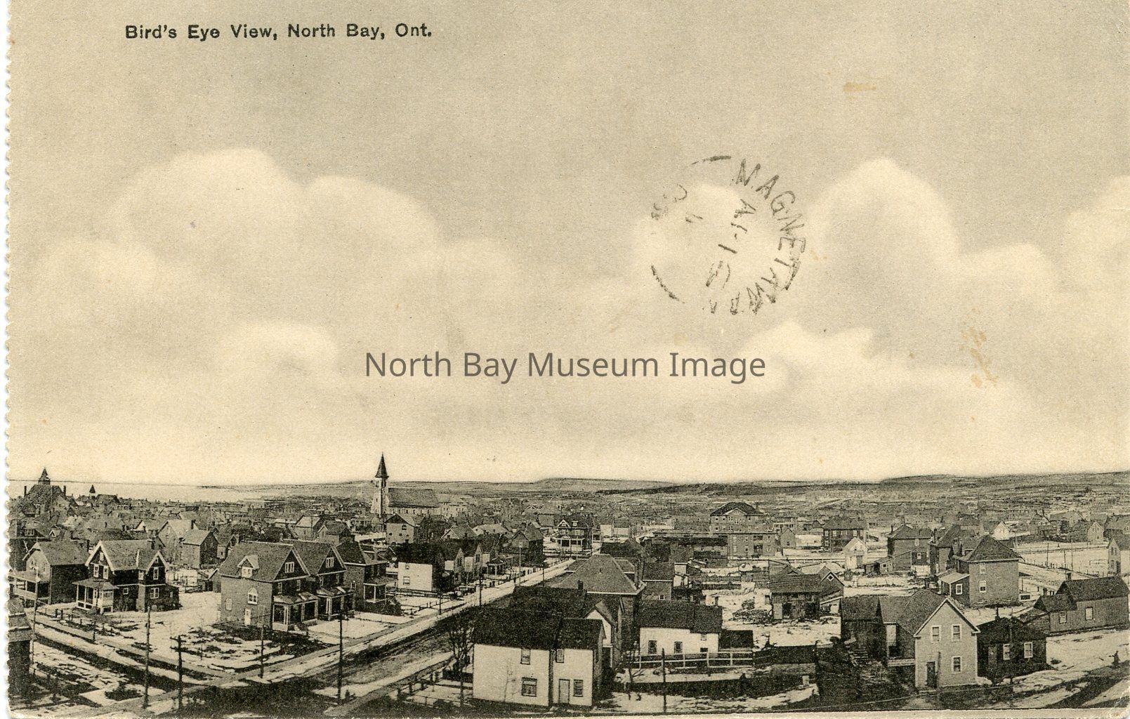 Sepia postcard of North Bay showing bird's eye view. The image is looking over the city. The lake can be seen at the far left of the postcard. A church steeple can also be seen on the left side.