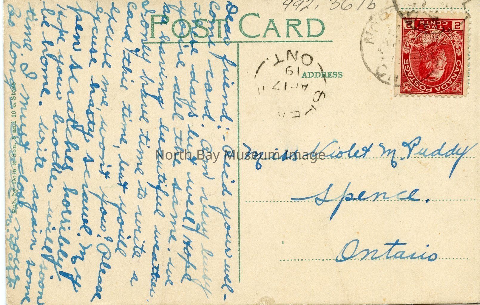 The back of the postcard has the message and correspondance written in blue ink. There is a red 2cent stamp in the corner. The postmark was stamped overtop of the postage stamp.
