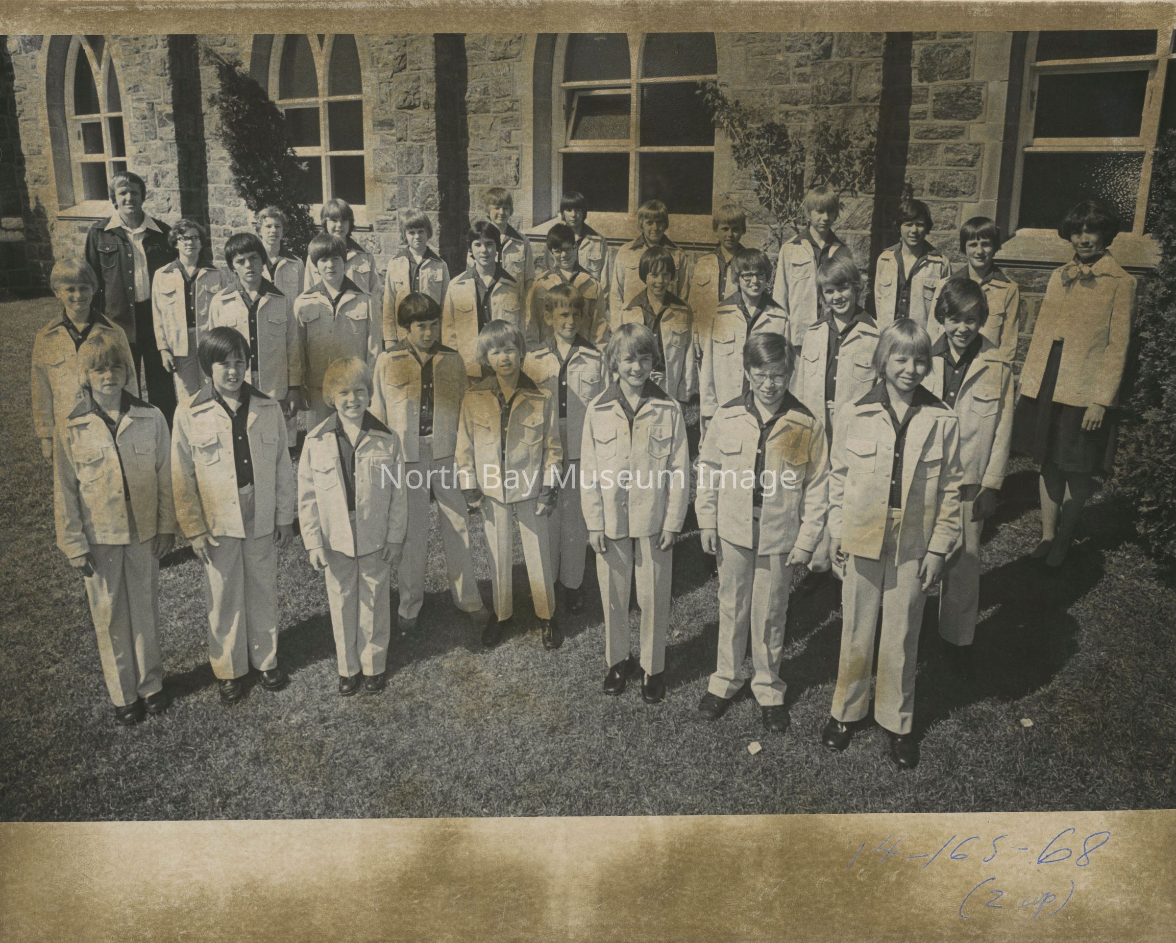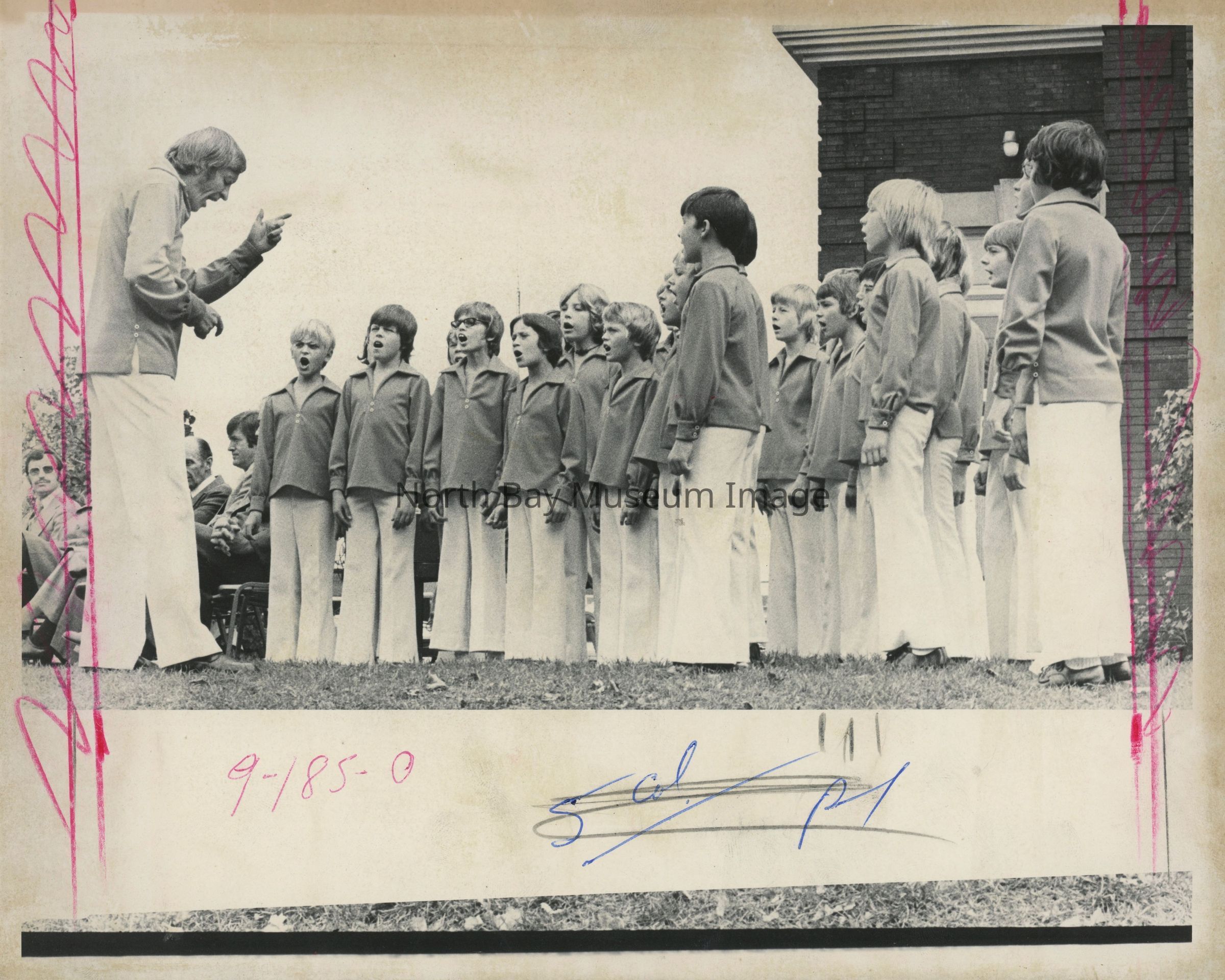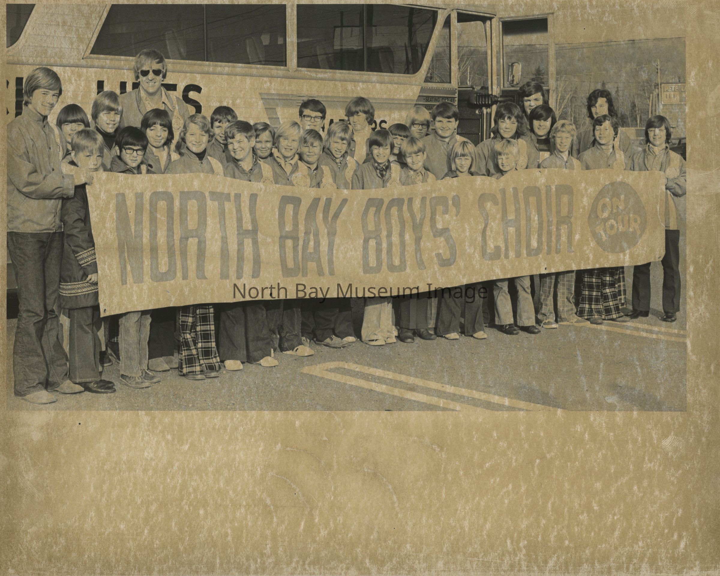 Photos of North Bay boys choir which was later renamed Interlink. 022.01.113i: Brown and white logo of boy singing.
