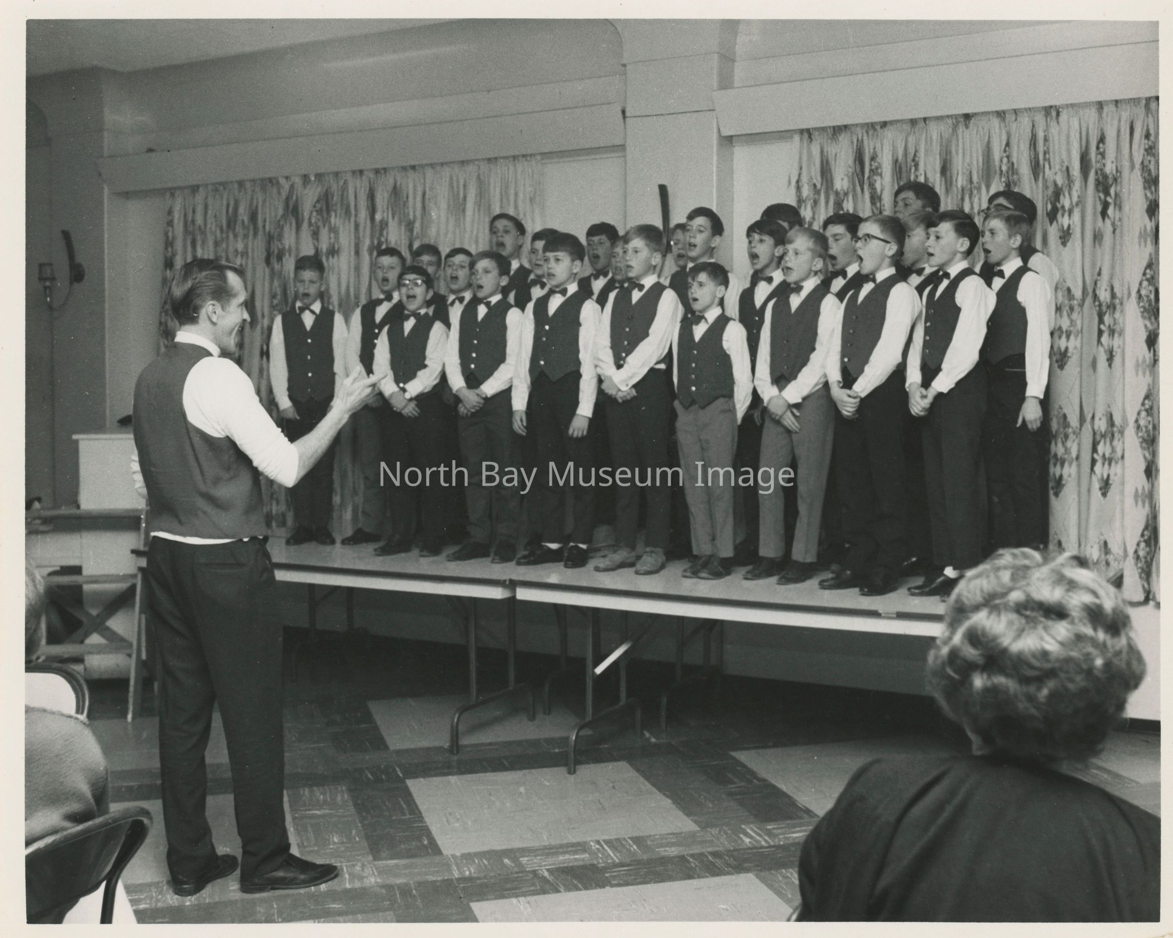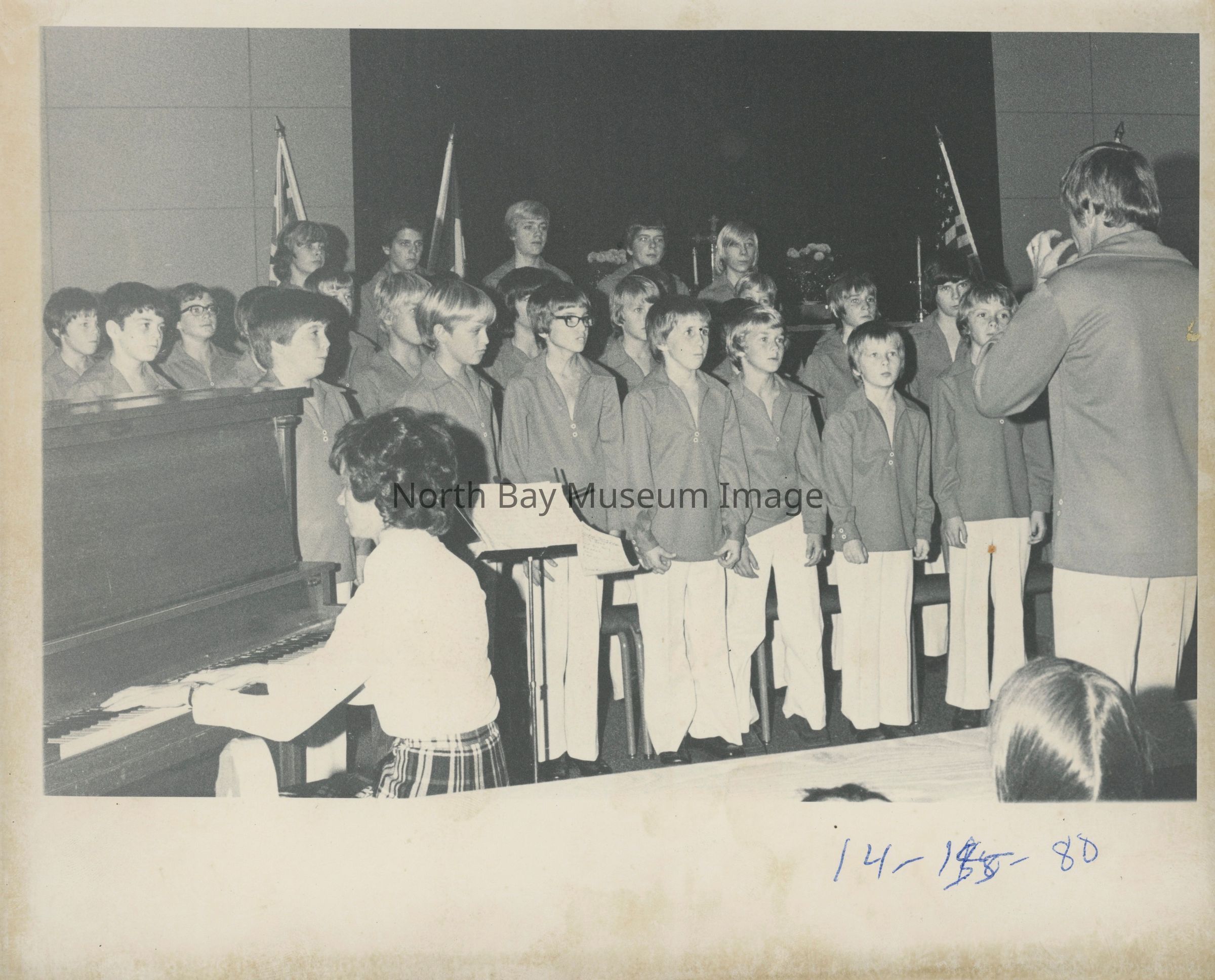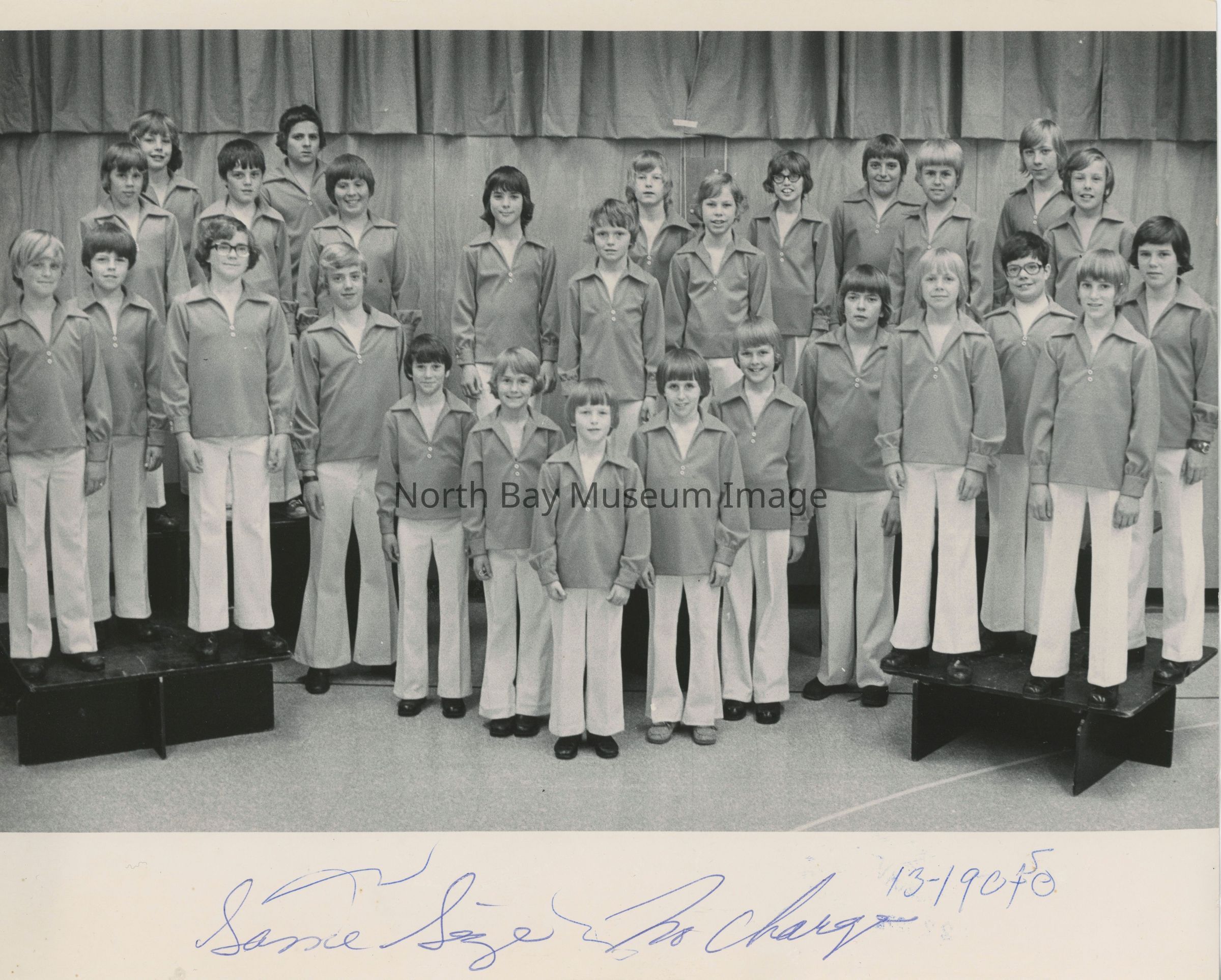 Photos of North Bay boys choir which was later renamed Interlink. 022.01.113i: Brown and white logo of boy singing.