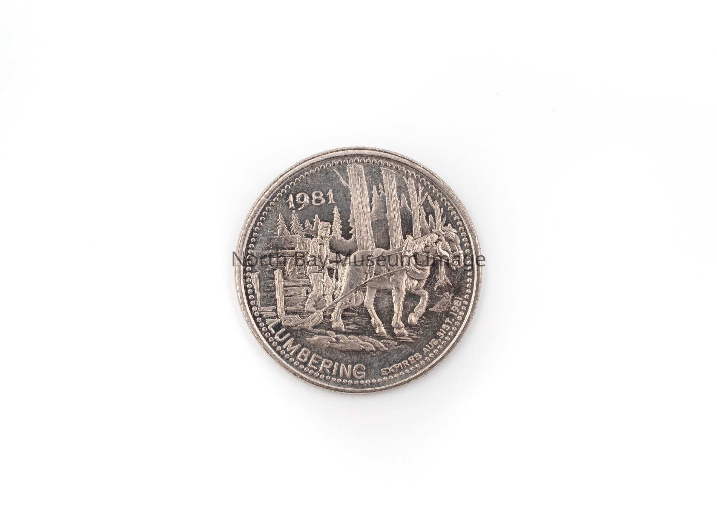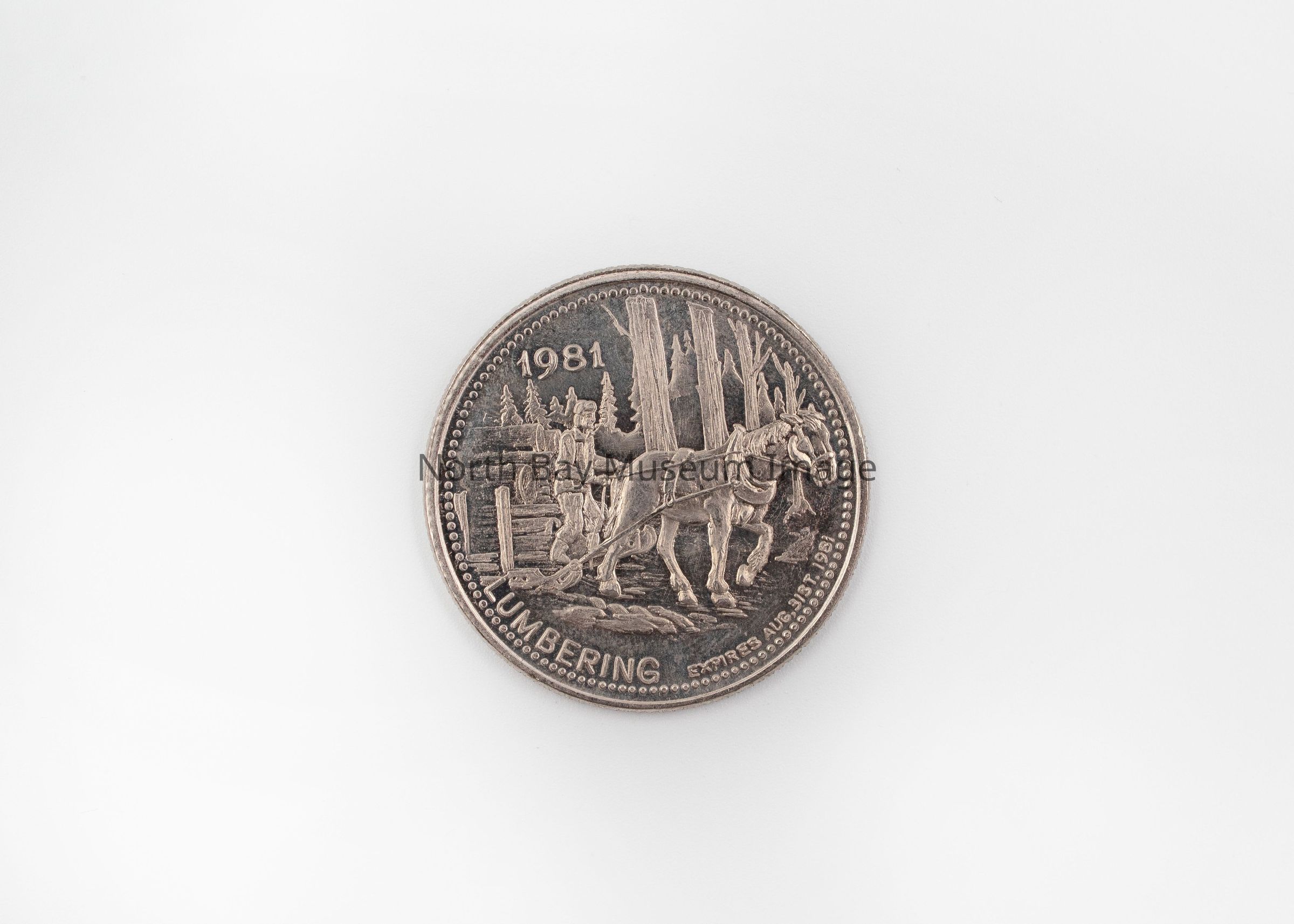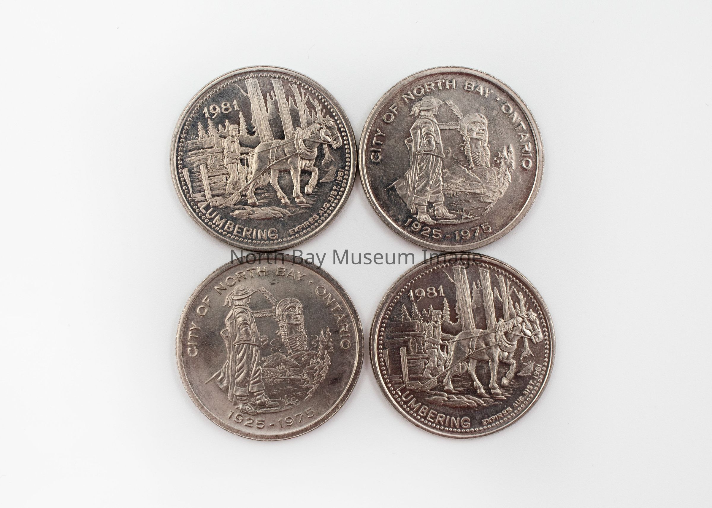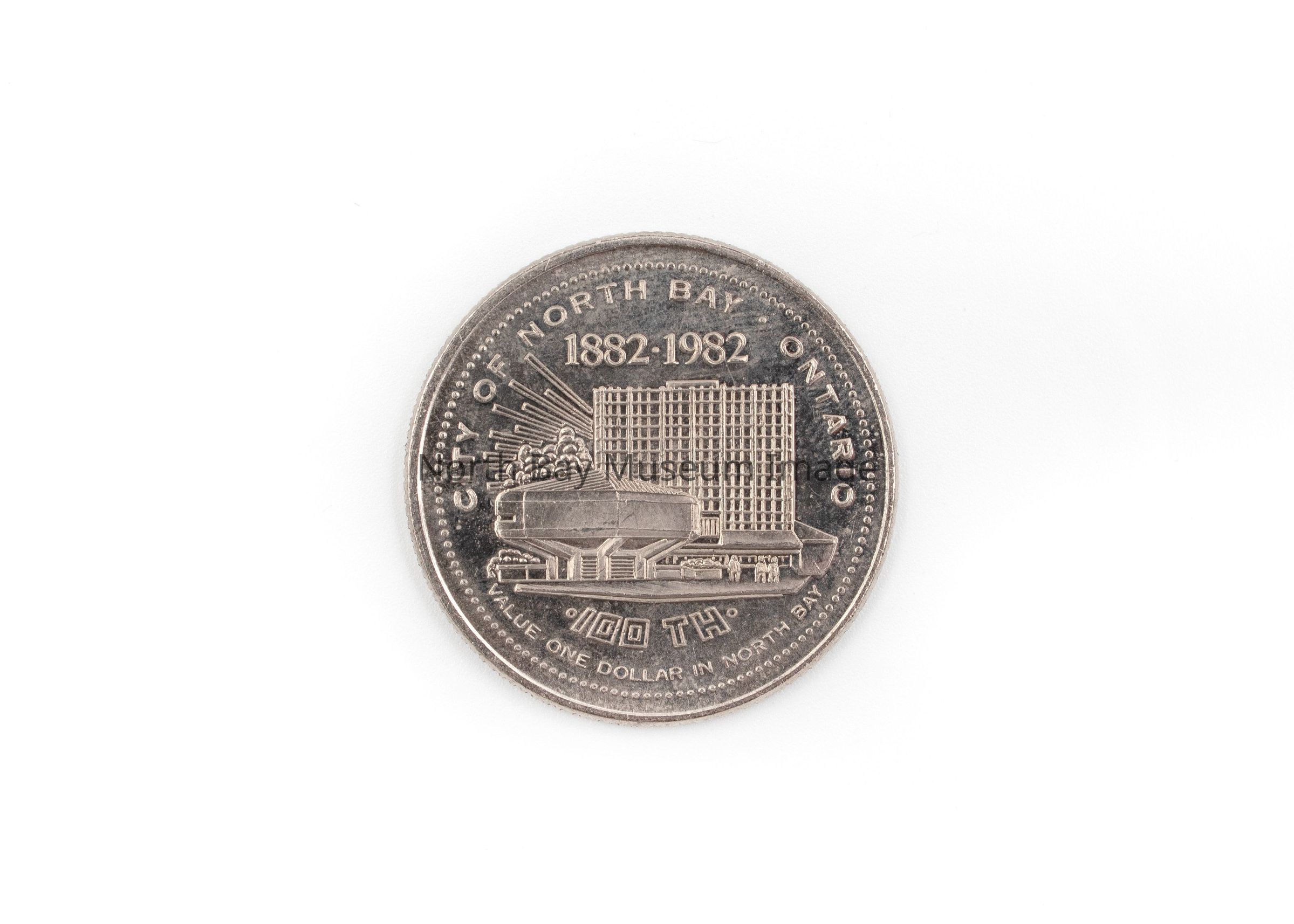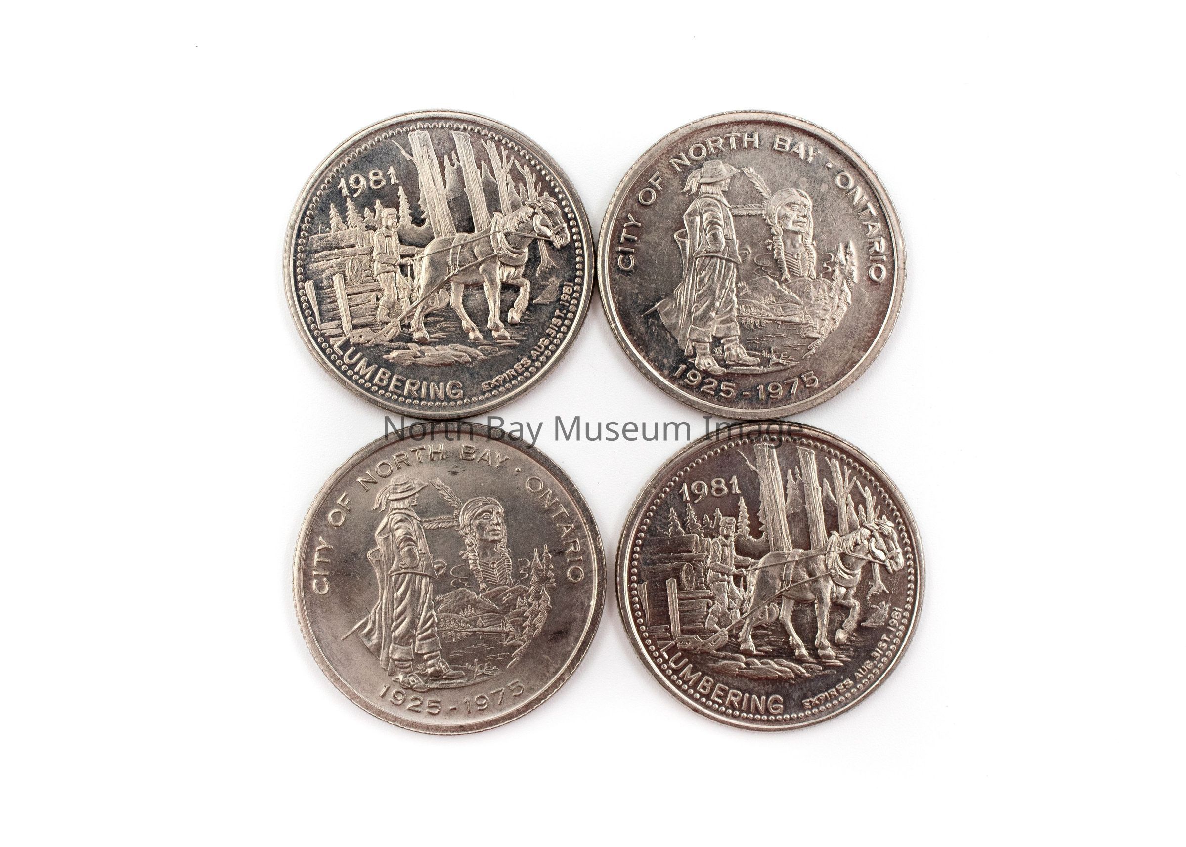 Commemorative coins, 6 copies issued 1975 for the 50th anniversary of North Bay becoming a city. On one side 50th anniversary in engraved across the top with the gateway arch and voyaguer image in middle with Value One Dollar in North Bay engraved across the bottom and Expires August 31, 1975. On reverse is City of North Bay across the top 1925-1975 across the bottom and voyageur image in the middle. 2 copies commemmorative coin issued 1982 100th anniversary of rail/initial settlement.Creator