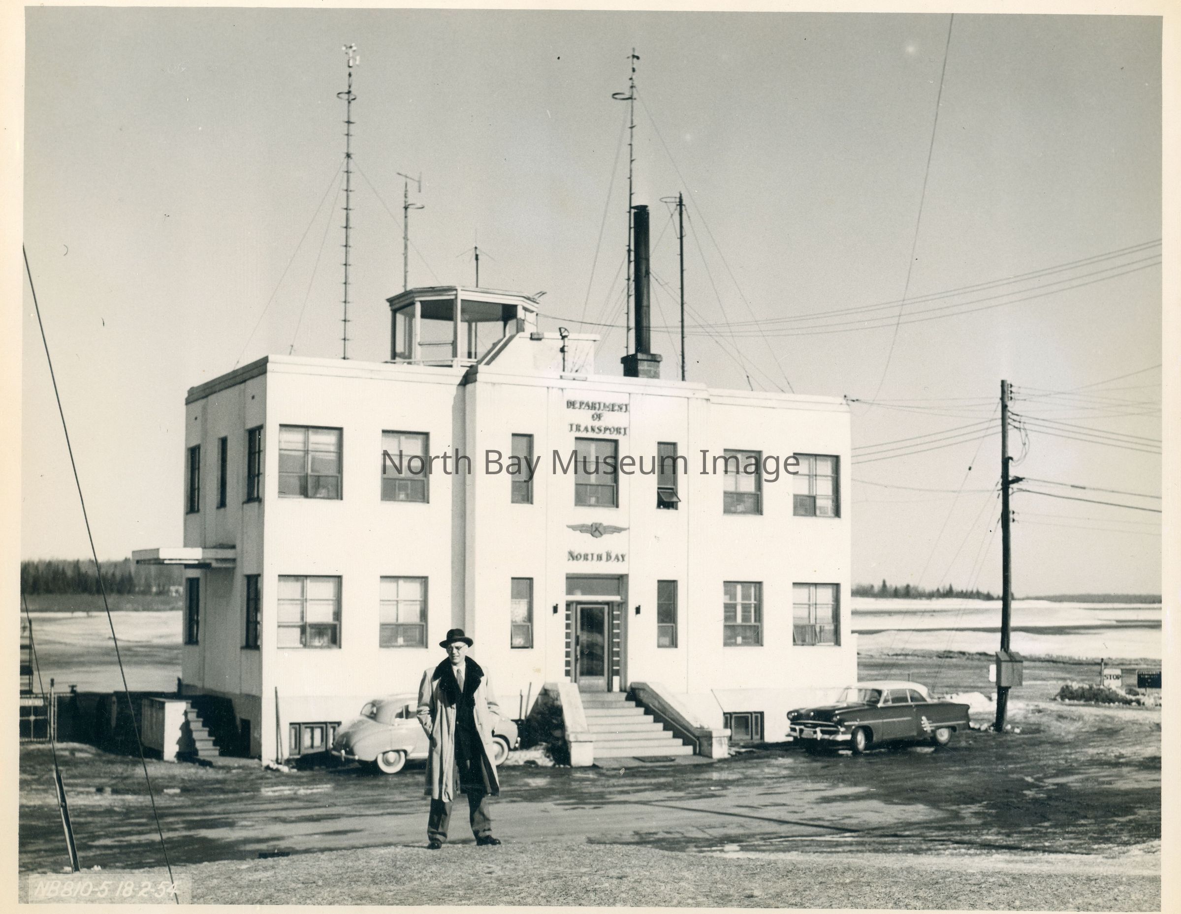 Department of Transport - North Bay is visible in printed letters in middle of the building along with red Dept. of Transport Wings with black anchor. Photo was taken in winter with cars on either side of the building and a man (believed to be airport manager Lorne Hicks) in long coat & dark hat standing in front front of one of the cars.