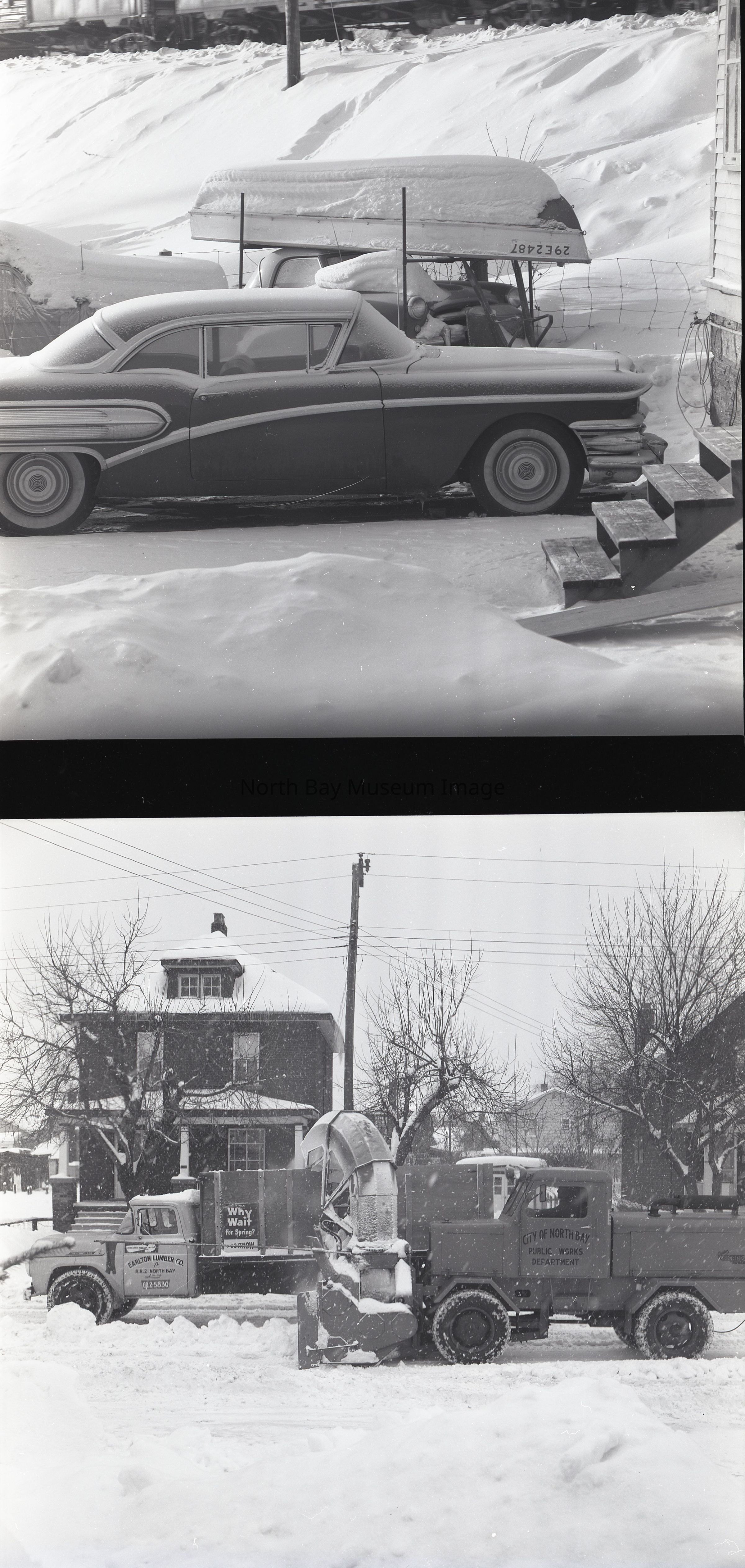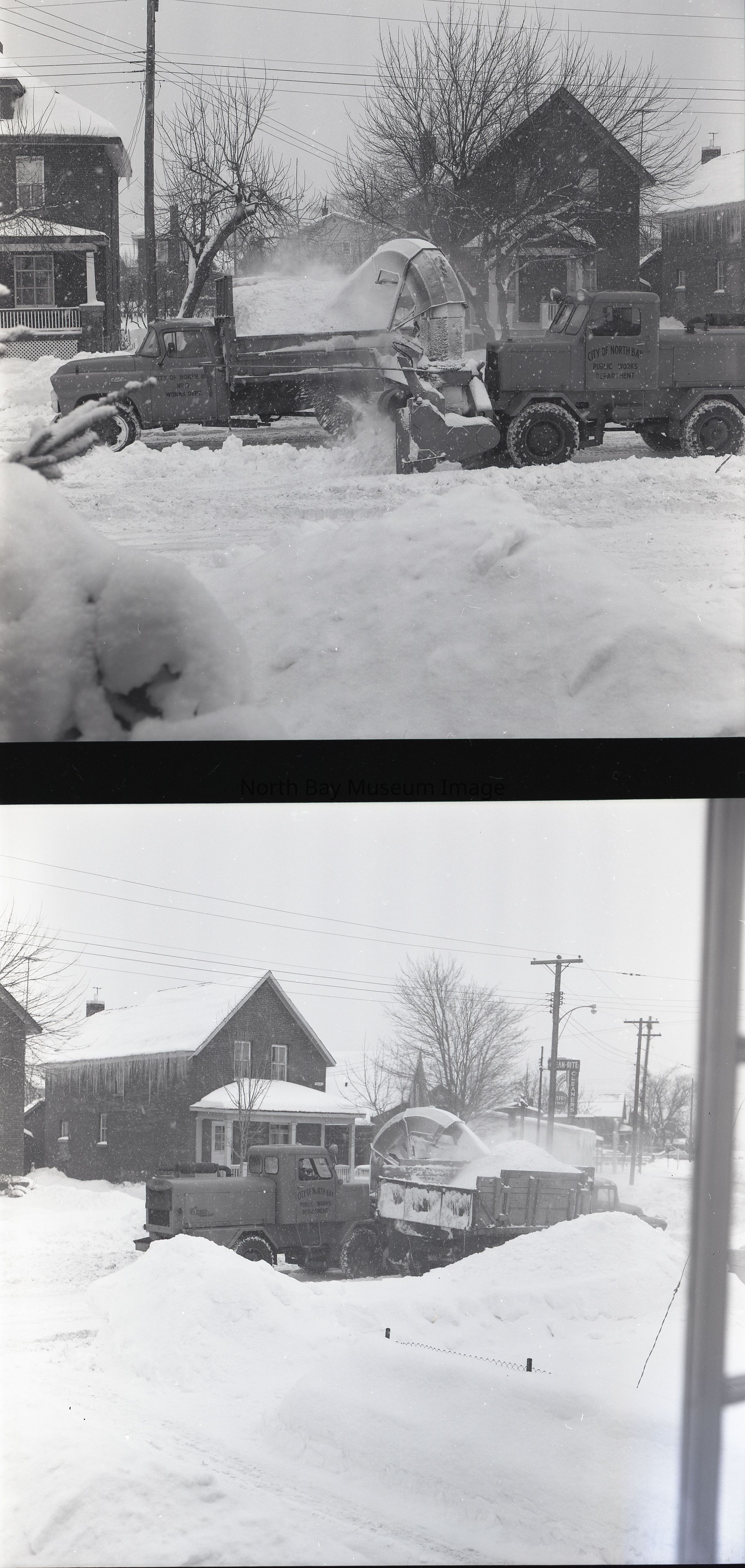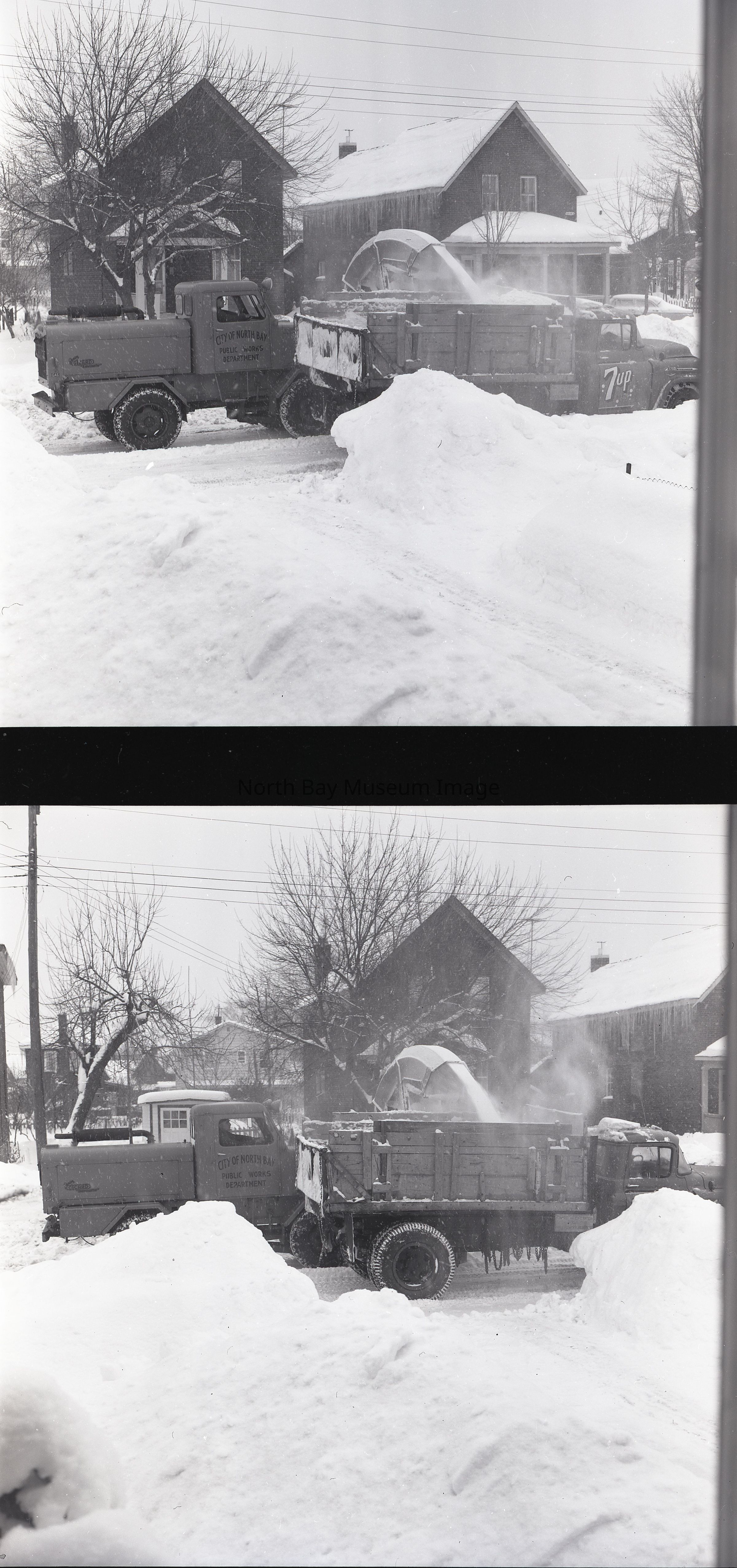 Envelope containing photographs and negative (a-l) of Dowtown North Bay Streets Snow plow and clearing. The photographs show cars driving along the snowy streets and the clearing of the snow. A part of the Forder Collection.Creator