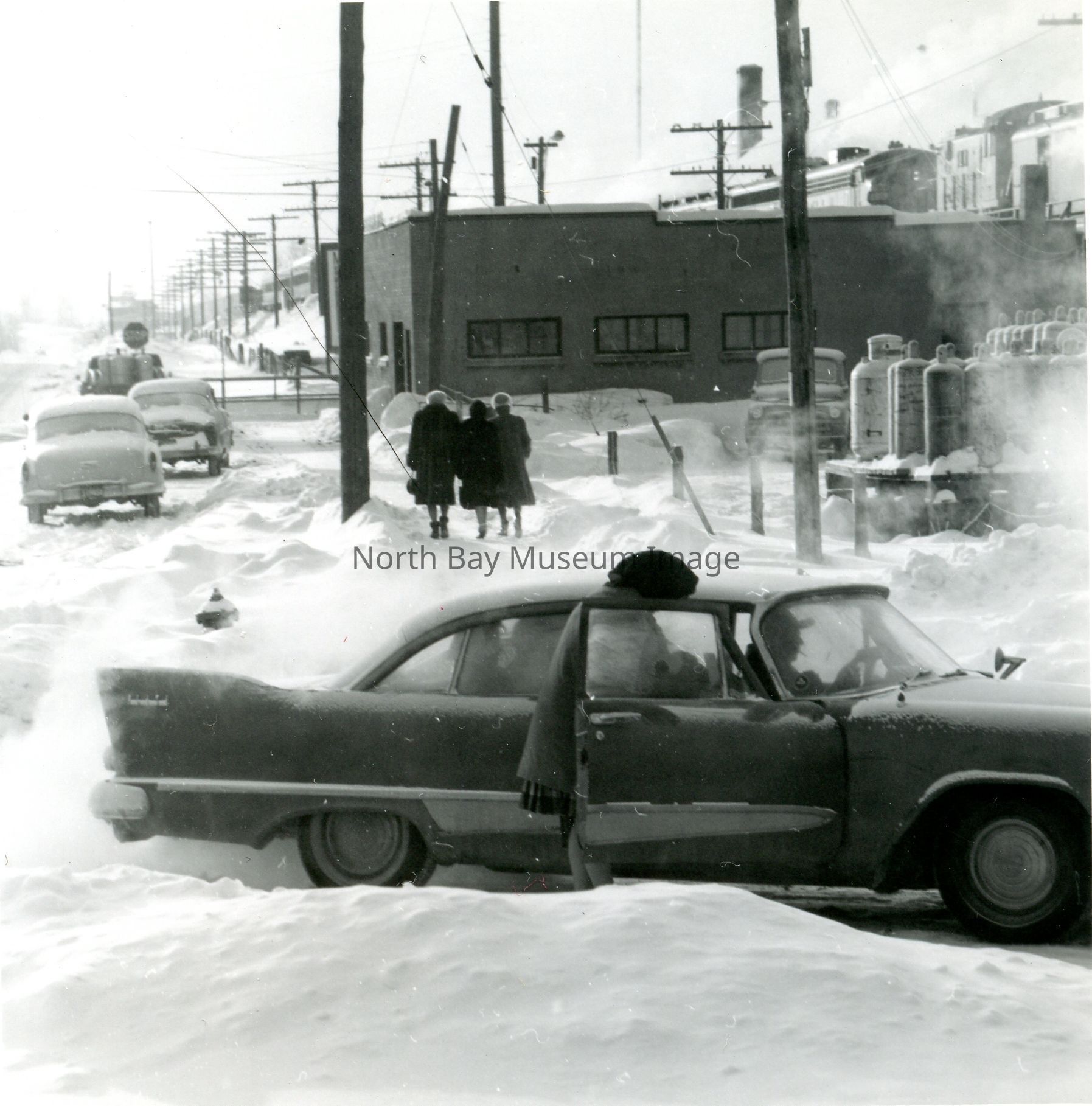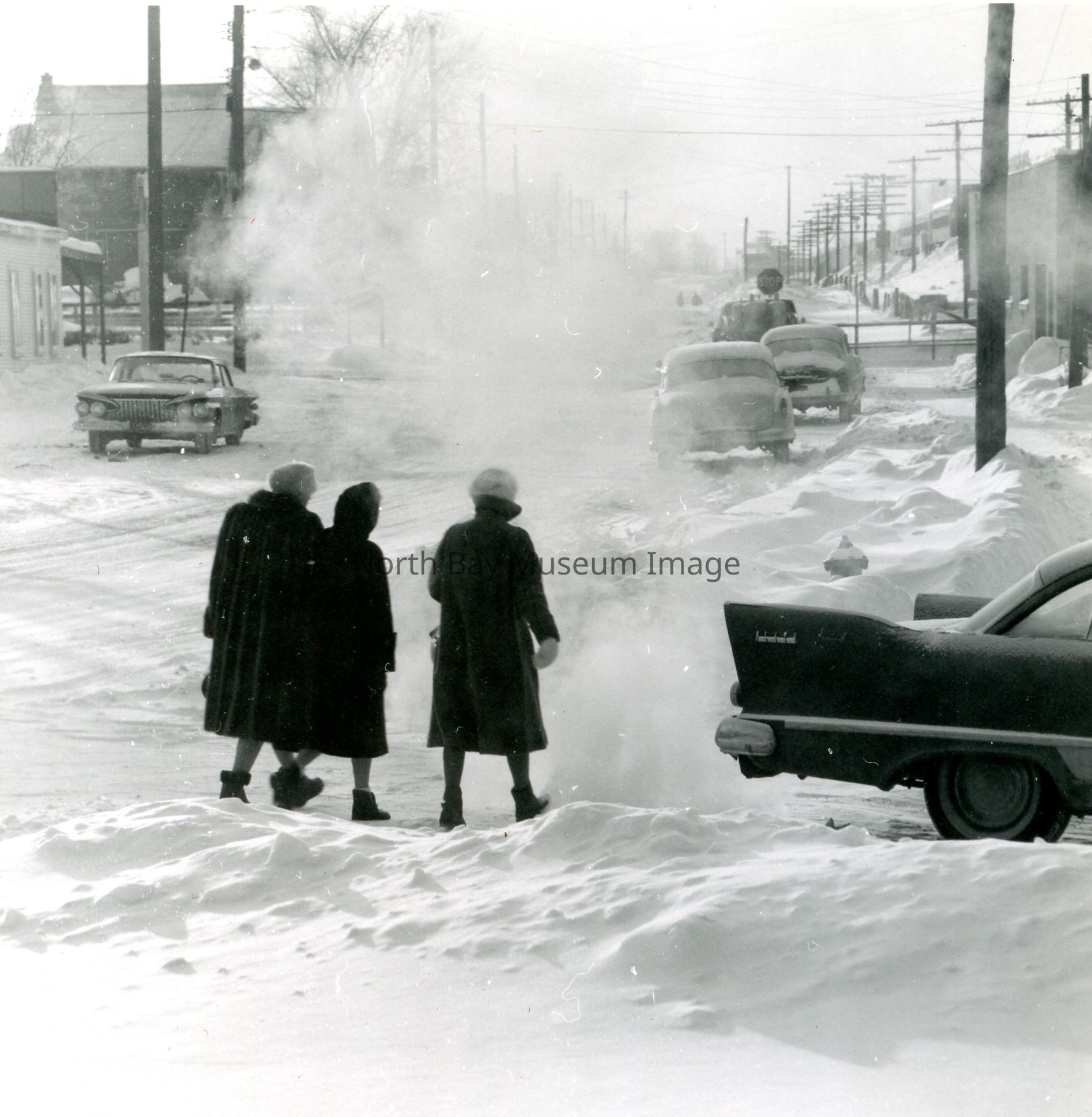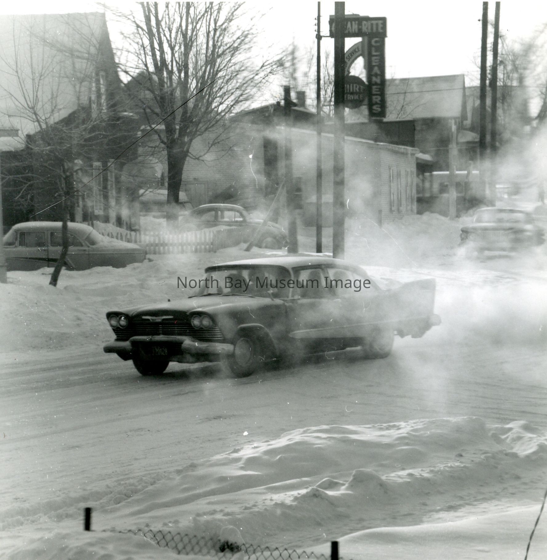 Envelope containing photographs and negative (a-l) of Dowtown North Bay Streets Snow plow and clearing. The photographs show cars driving along the snowy streets and the clearing of the snow. A part of the Forder Collection.Creator