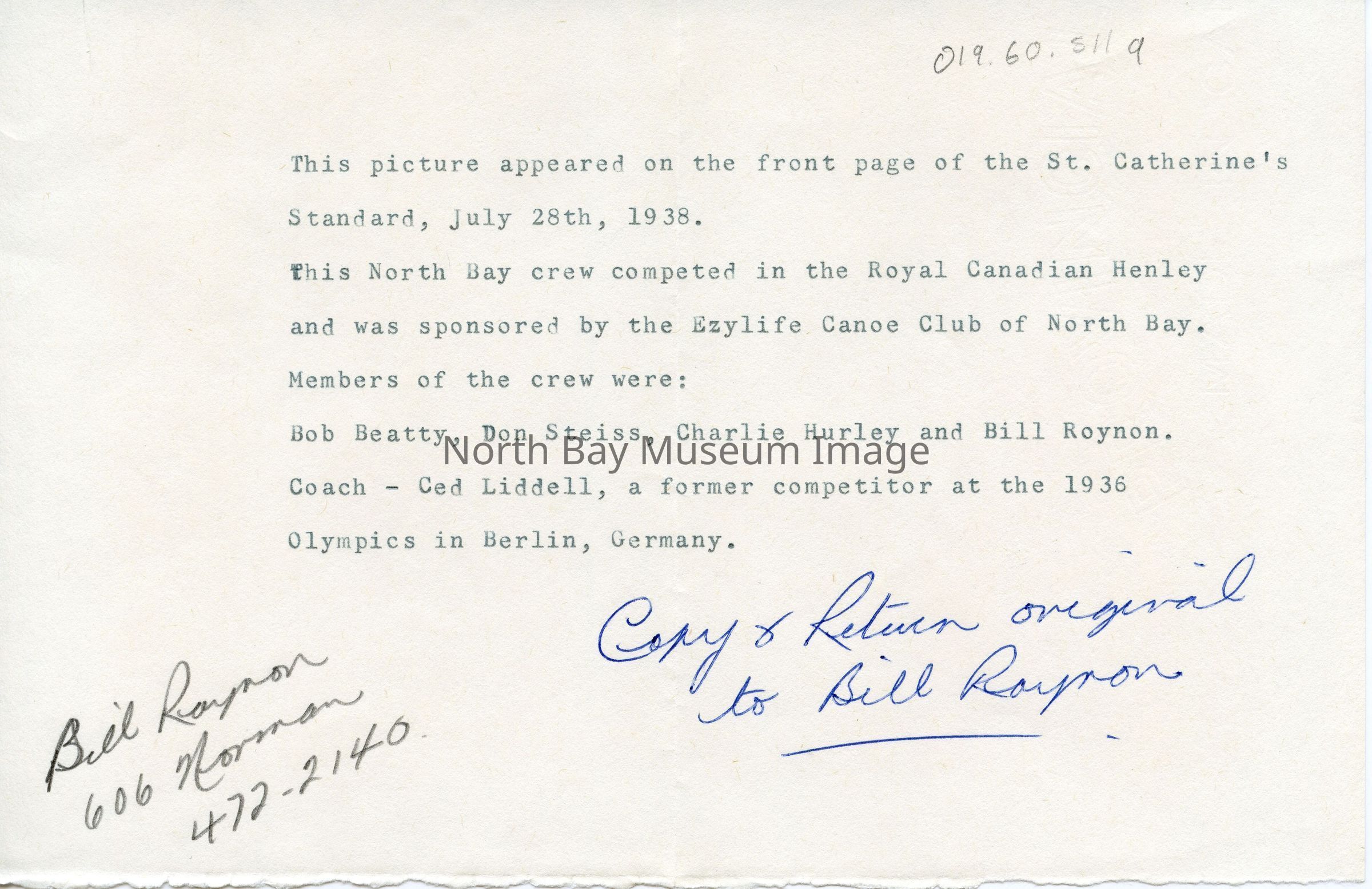 (a) is a Letter with photo information (presumably sent to donor William Forder that reads "This picture appeared on the front page of the St. Catherine's Standard, July 28, 1938. This North Bay crew competed in the Royal Canadian Henley and was sponsored by the Ezylife Canoe Club of North Bay. Members of the crew were: Bob Beatty, Don Steiss, Charlie Hurley, and Bill Roynon. Coac Ced Liddell, a former competitor at the 1935 Olympics in Berlin, Germany." This is a Part of William Forder Collection.Creator