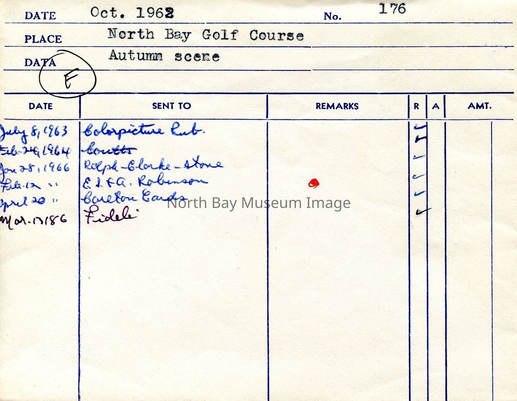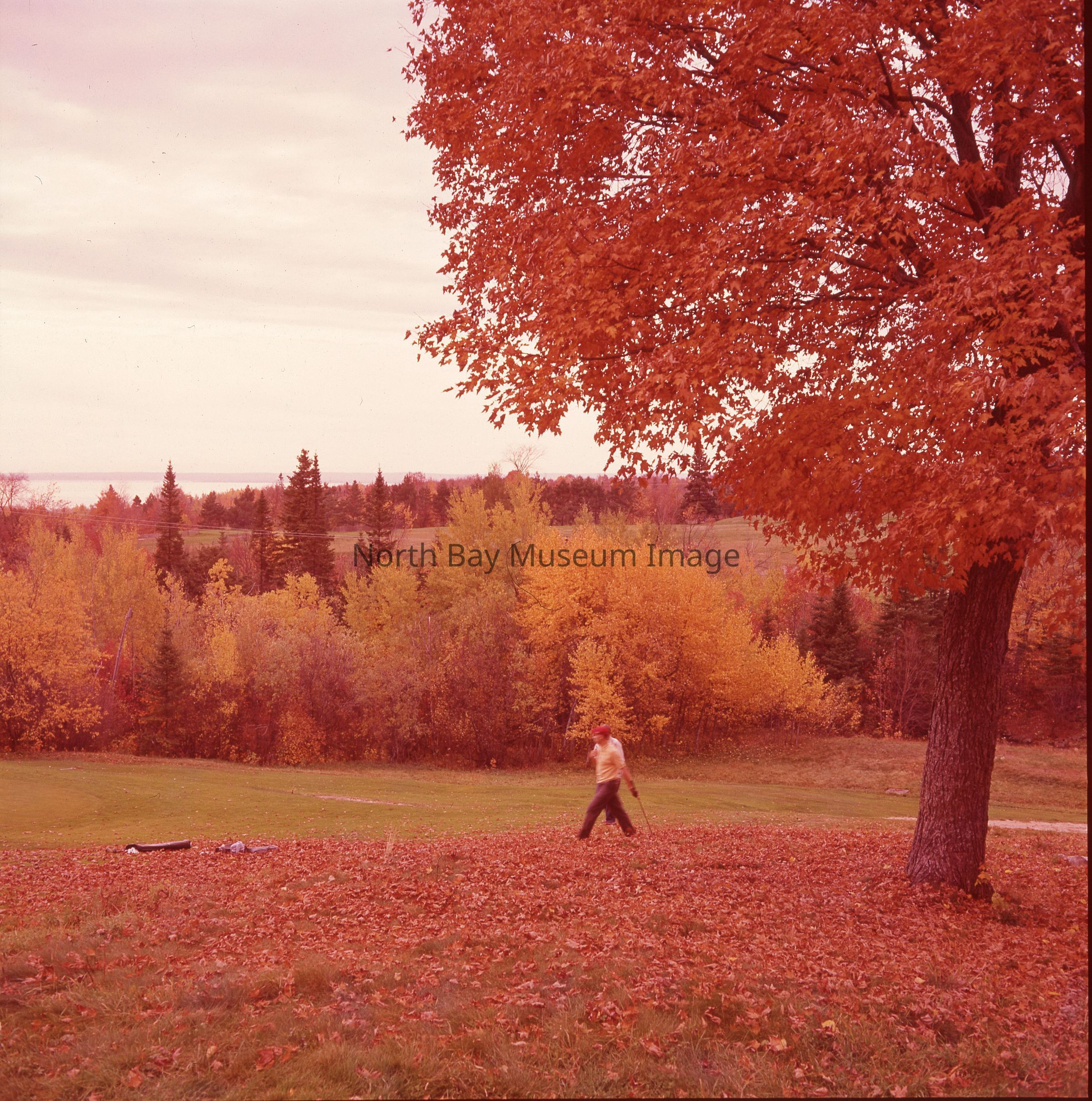 Photographer's envelope (a) contains the negative (b) of the north bay gold course in Autumn. The image is of the north bay golf course, it shows red leaves on the ground. In the distance you can see the the lake. A man golfing is also visible. A part of the Forder Collection. The photographers original accession number is 176. All the publications of the images are written on the envelope.Creator