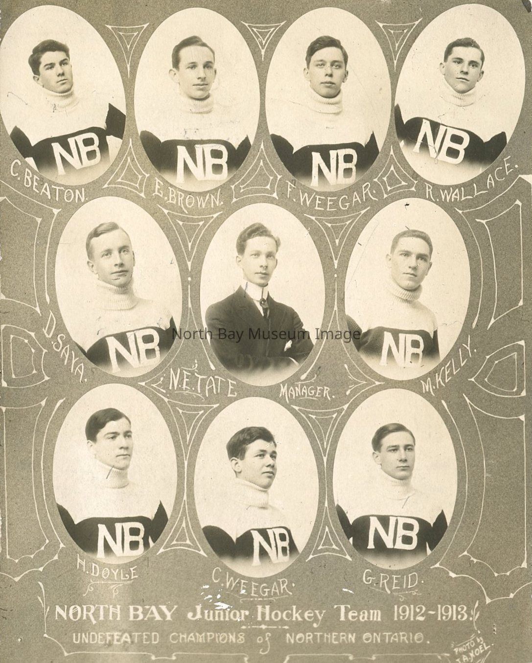 Photographic print - black bristol board with black and white photo of "North Bay Junior Hockey Team 1912-13 Undefeated Champions of Northern Ontario"