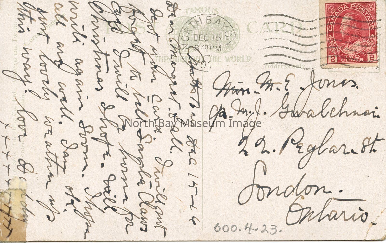 The message on the back is for Margret from Daddy. The red 2cent stamp has been cancelled. The post mark reads, "North Bay, Ont. Dec. 15, 1916 8:30pm"Creator