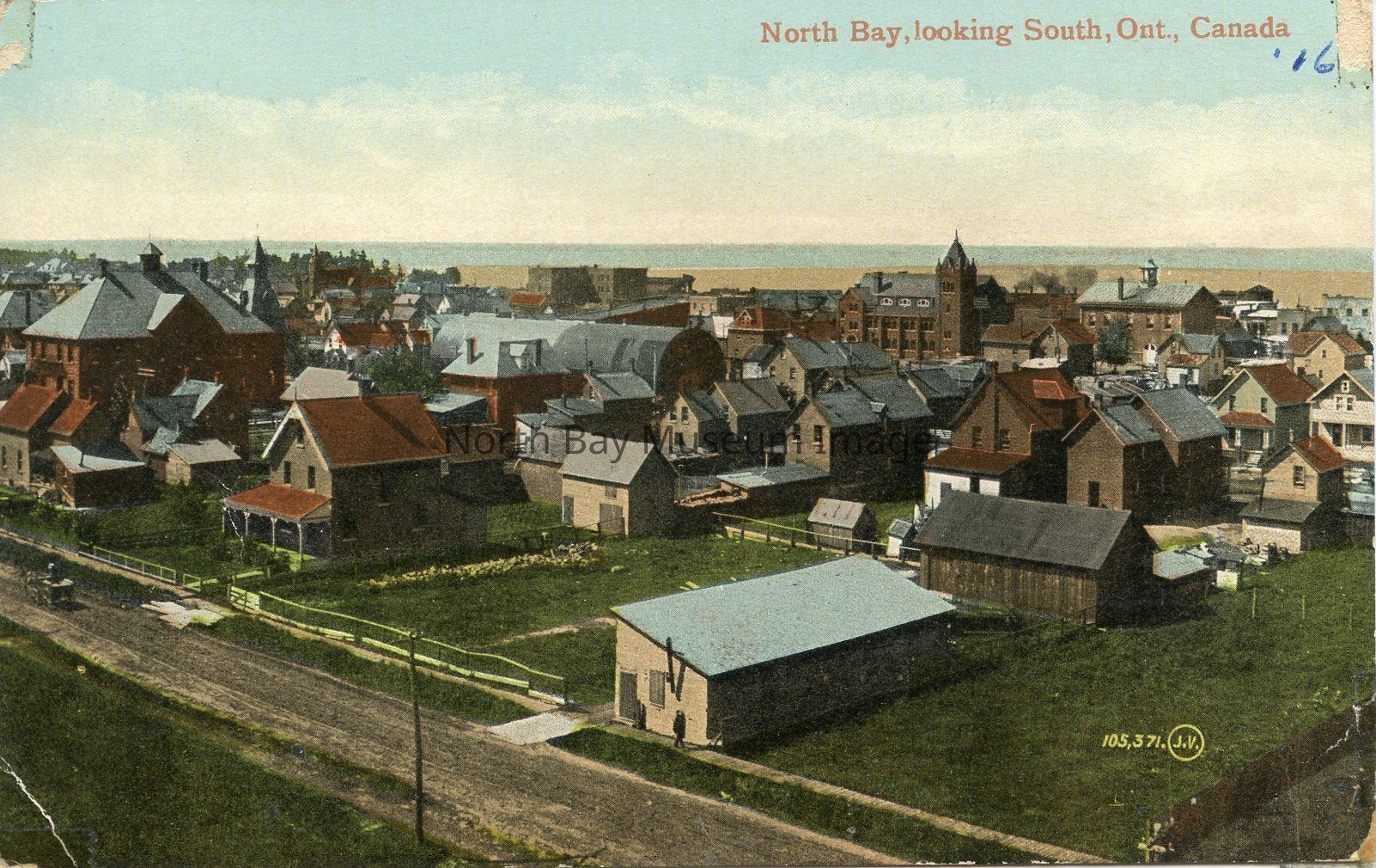 This Postcard has a coloured print of North Bay, looking South, and bounding on Ferguson. In the center of the image there is an image of the old arena , which was mainly used for curling. The Trinity Church also stands out, as does the many two-storey homes. In the foreground is a home, with a barn, and a shelter, possibly for animals. Wooden bridges across a long ditch give access to the dirt road can also be seen. Lake Nipissing can be seen in the background. In the lower right corner of the postcard, are the #'s 105,371, with the initials JV in a small circle.