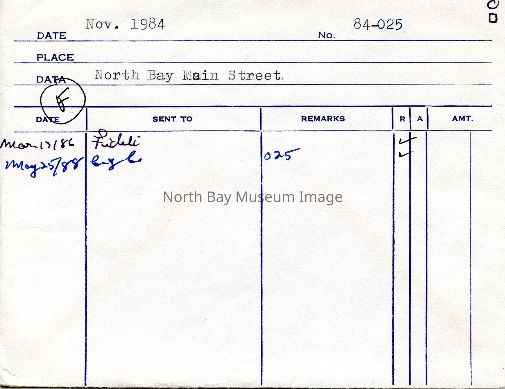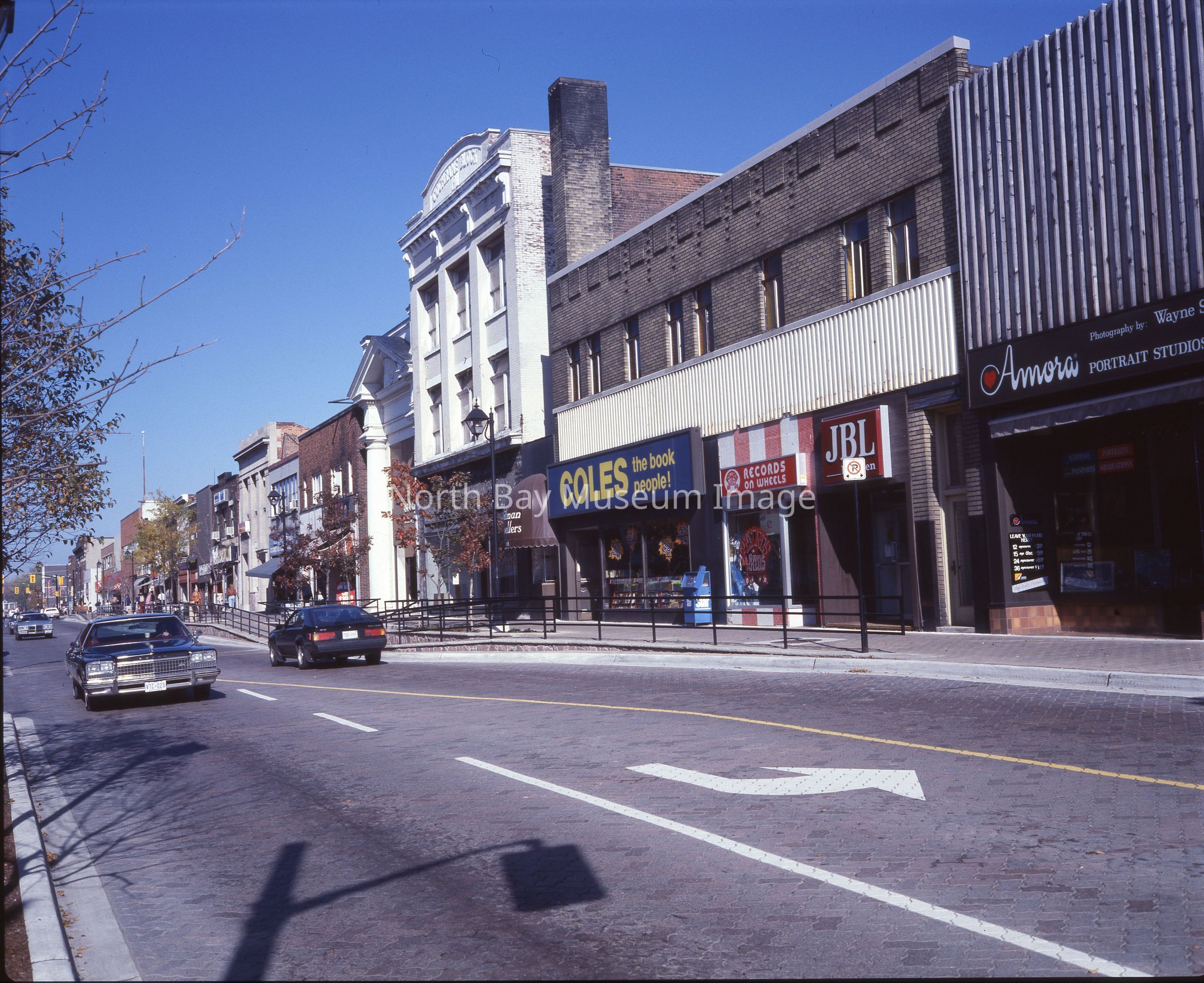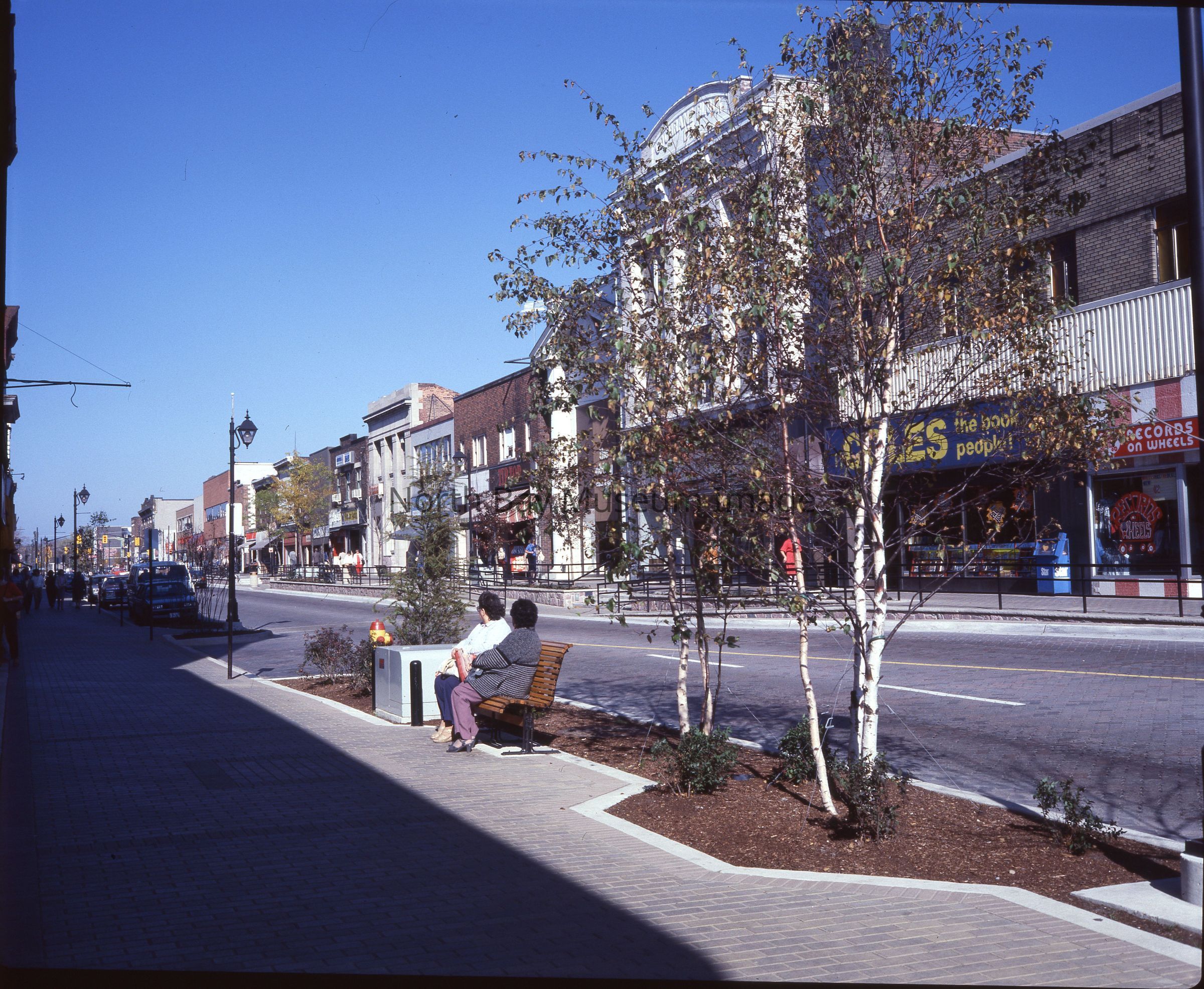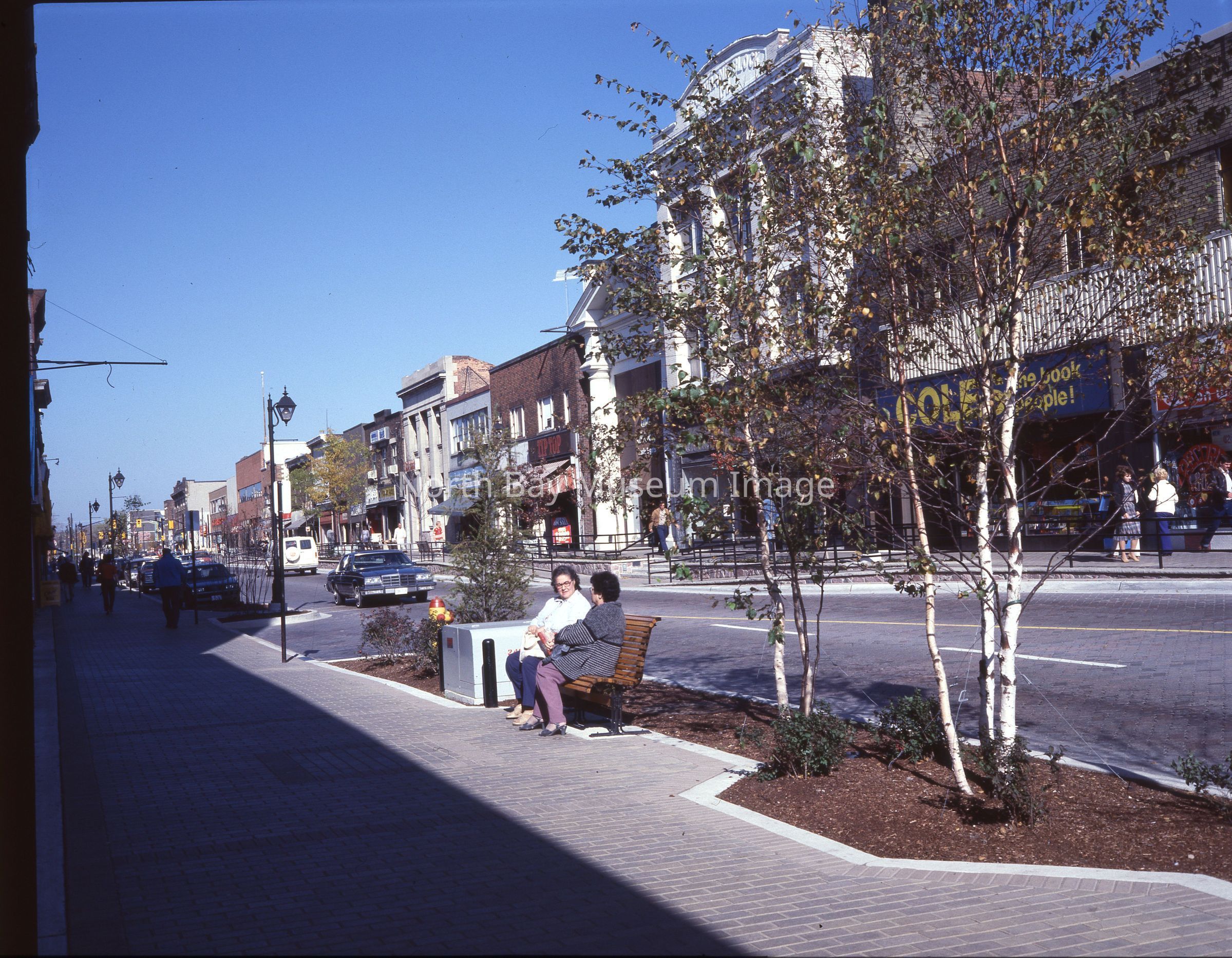 Envelope (a) contains negatives of North Bay Main Street West on the North side. The shops on main street include a Coles book store, Lefebvre's, and the Abby. One images aslo shows two women sitting on a bench chatting on main street. A part of the Forder Collection. The photographers original accession number is 84-025. The dates of publication are also listed on the envelope.Creator