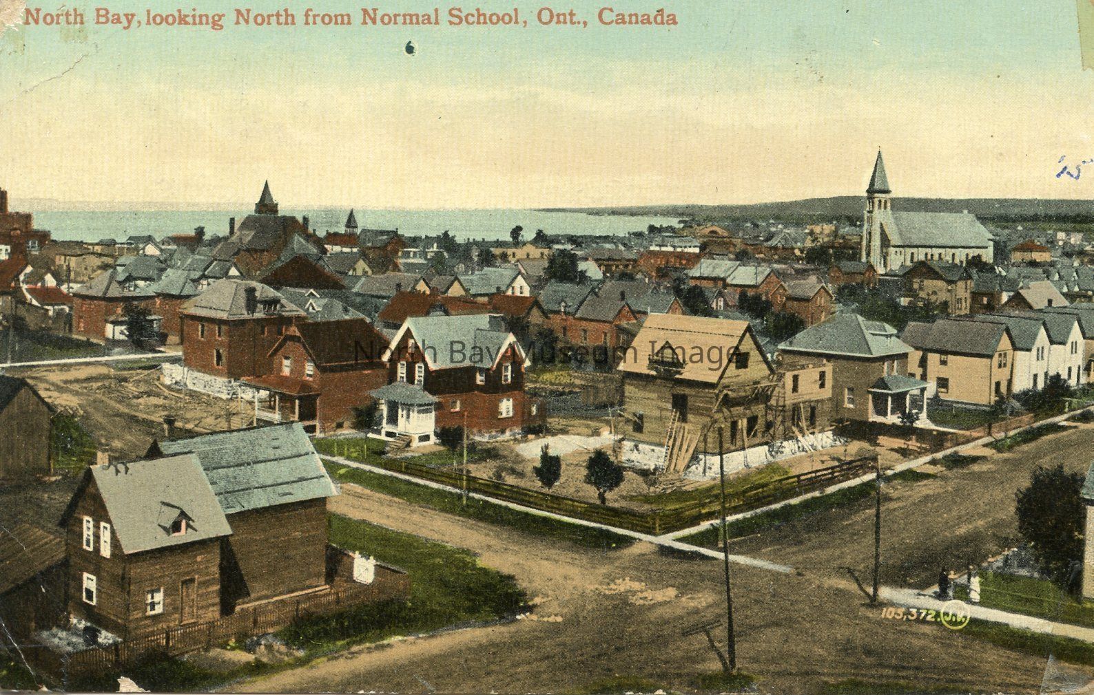This postcard has a coloured print of North Bay. The print is looking north, taken from the top of the normal school. The image also shows the waters of Lake Nipissing, and the many homes & churches in that area. Two homes are being built and can be seen in the foreground, with many two-storey homes of brick & wood. The #'s 105,372, followed by the initials JV in a small circle appear in the lower right corner of the postcard. The dirt roads are quite visible in the foreground.