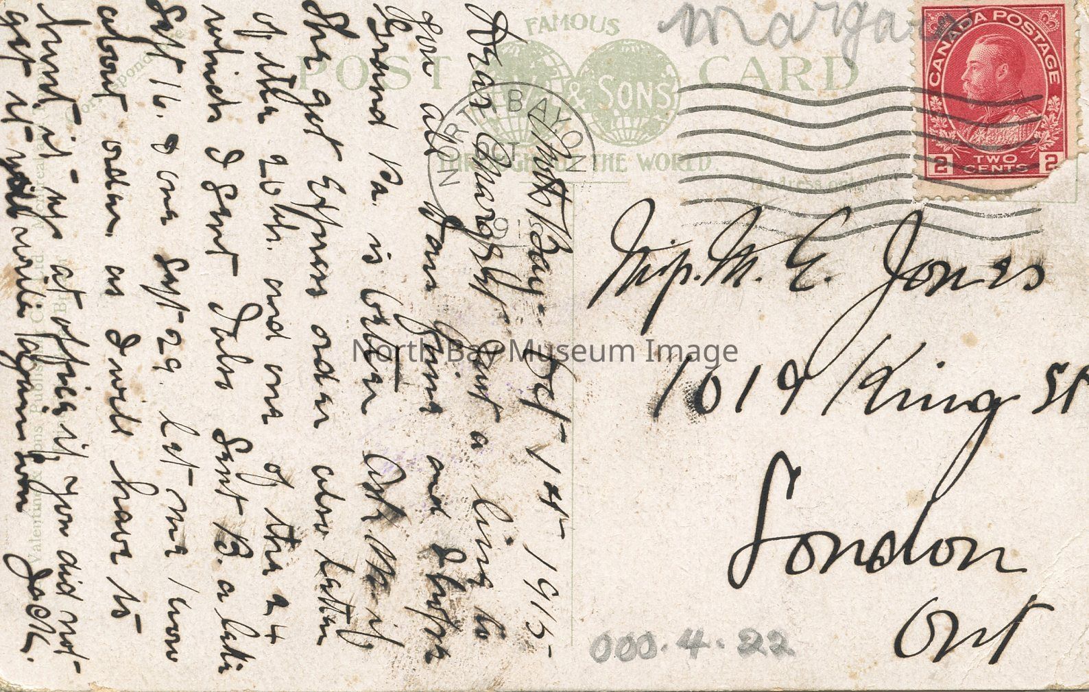 The message on the back of the postcard lists that it is for Margret, from Jack.A red 2cent stamp is seen on the back but has been cancelled, by the post office( by the black wavey lines). The post mark on the back is "North Bay Oct. 14, 1915"Creator