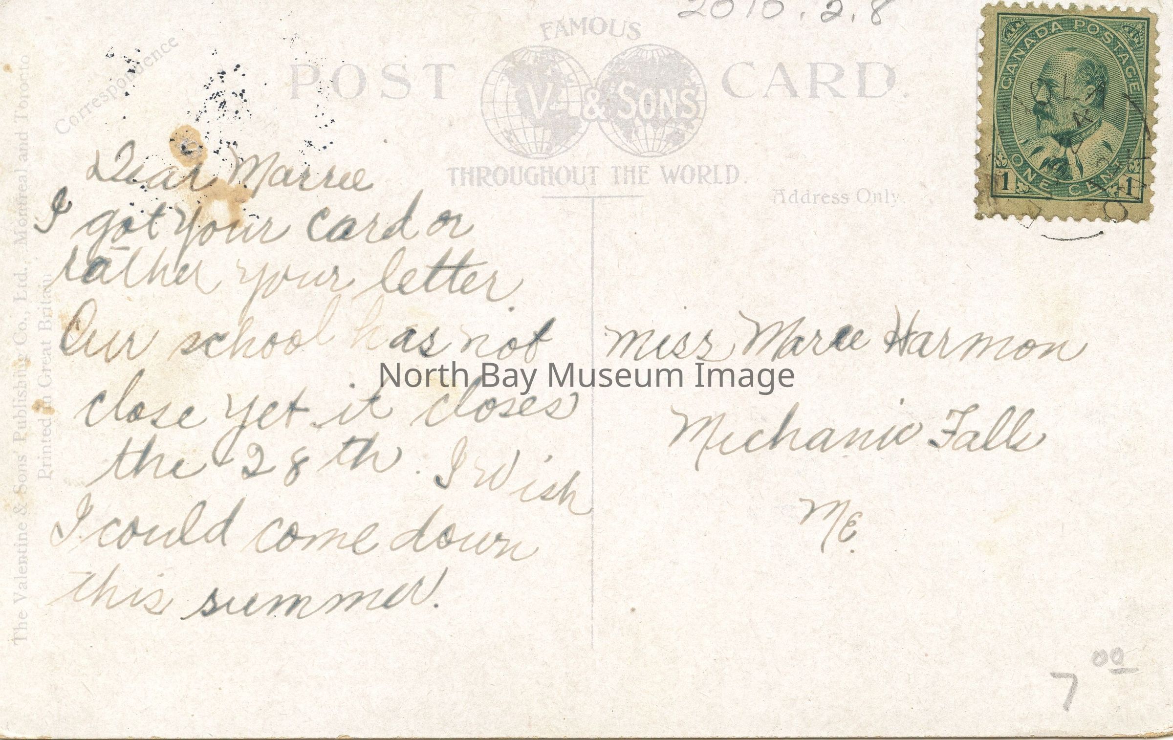 Addressed to: Miss Marie Harmon, Michanic Falls, ME.