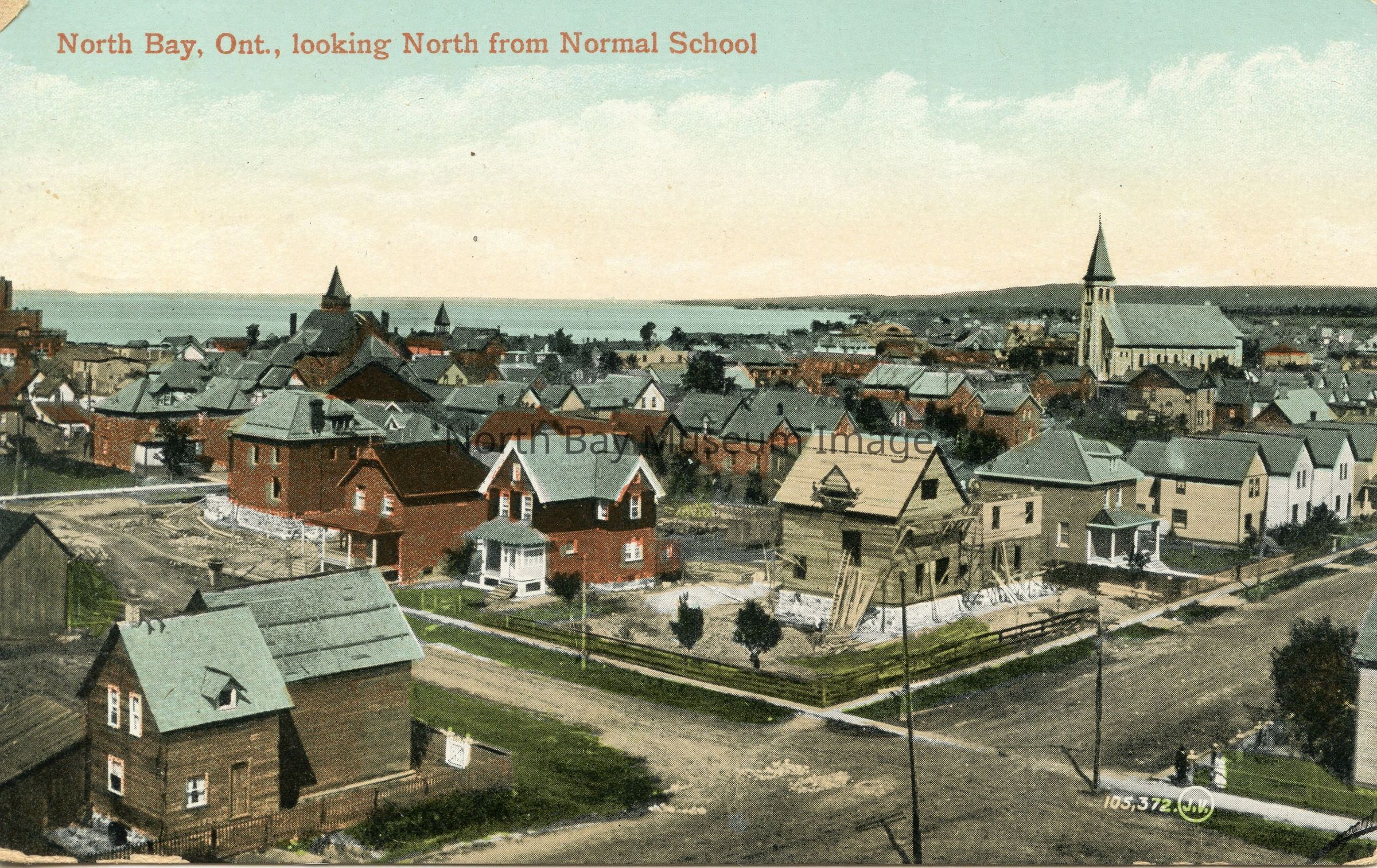 Postcard with coloured photo of North Bay, Ont. Looking North from Normal School, was located in between 1st Ave. To South, 2nd Ave. To North and Ferguson to East and Fraser to West. Large church to the right is Pro Cathedral. Churches to left probably Saint Andrews and far left the first First Baptist Church which was located on Main St. W.
