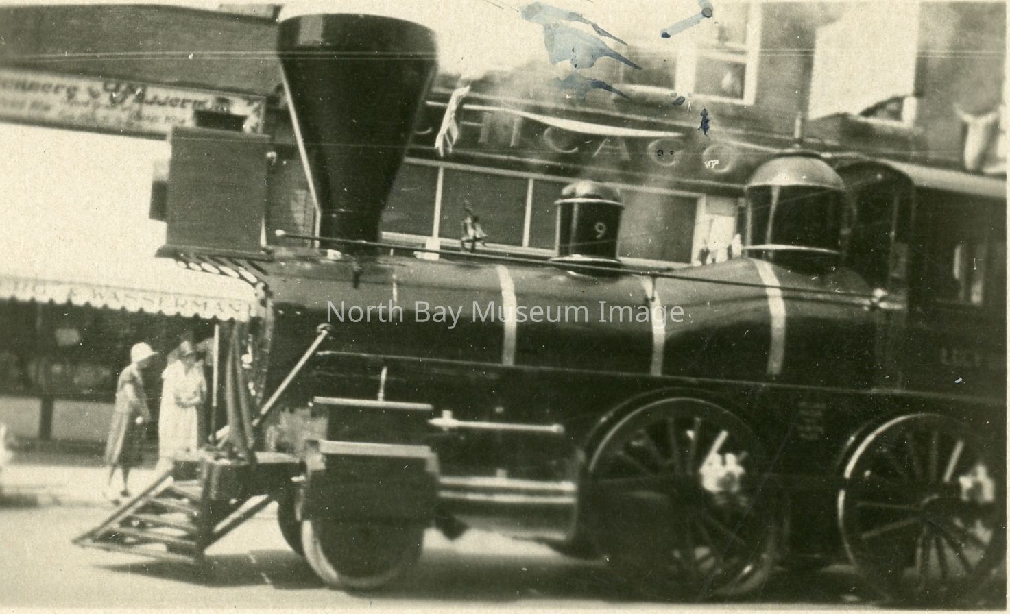 Small print taken by Albert Richanbrock, is of a steam engine on downtown street. This was a model of the Lucy Dalton, the first steam engine to come to North Bay, created by the Canadian Pacific Railway as part of the Old Home Week parade.