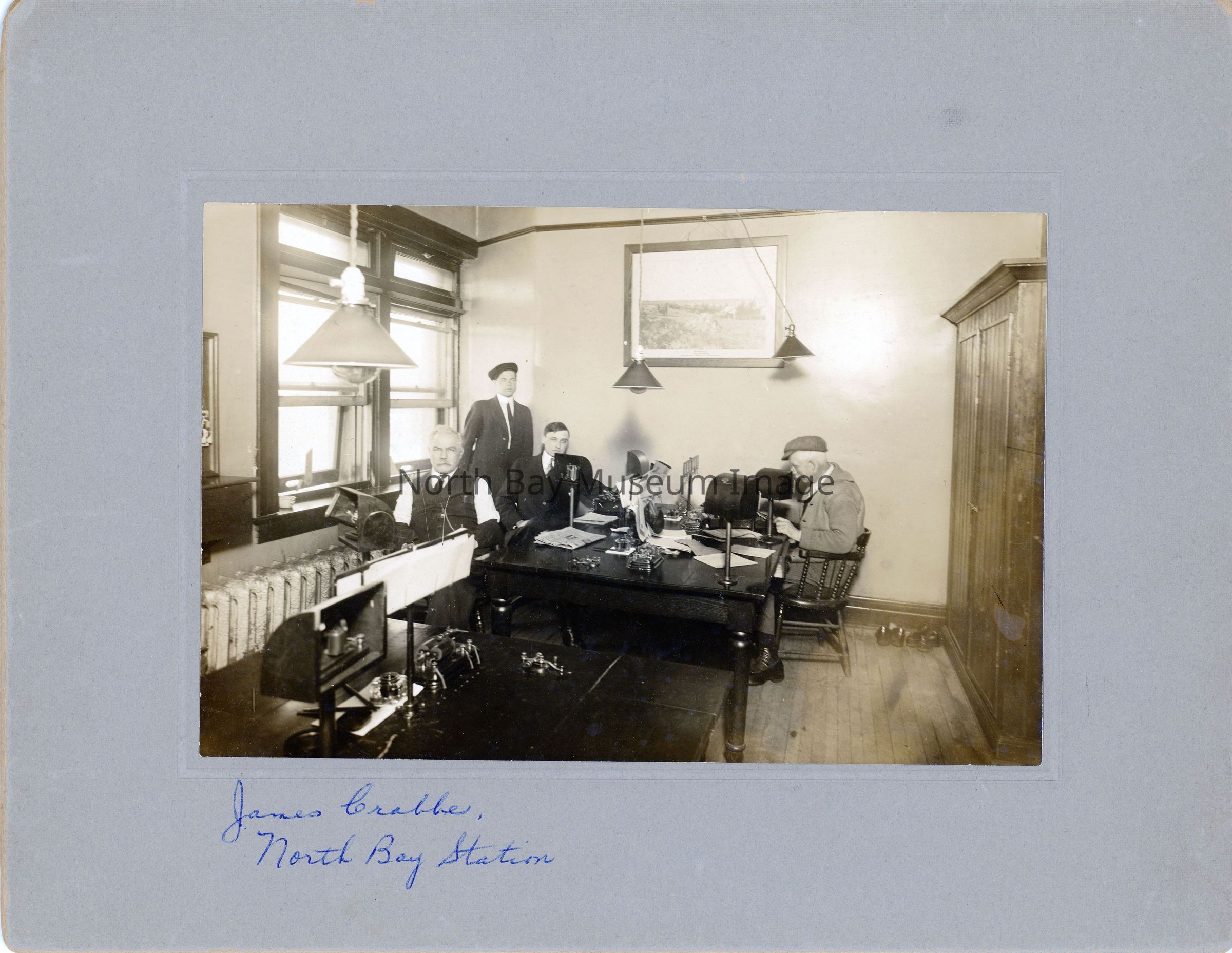 Photograph with caption James Crabbe, North Bay Station written below the photo. Depicts four men in CPR station offices seated by individual lights. Writing on back of the photo is unclear but appears to date the photo to 1935.