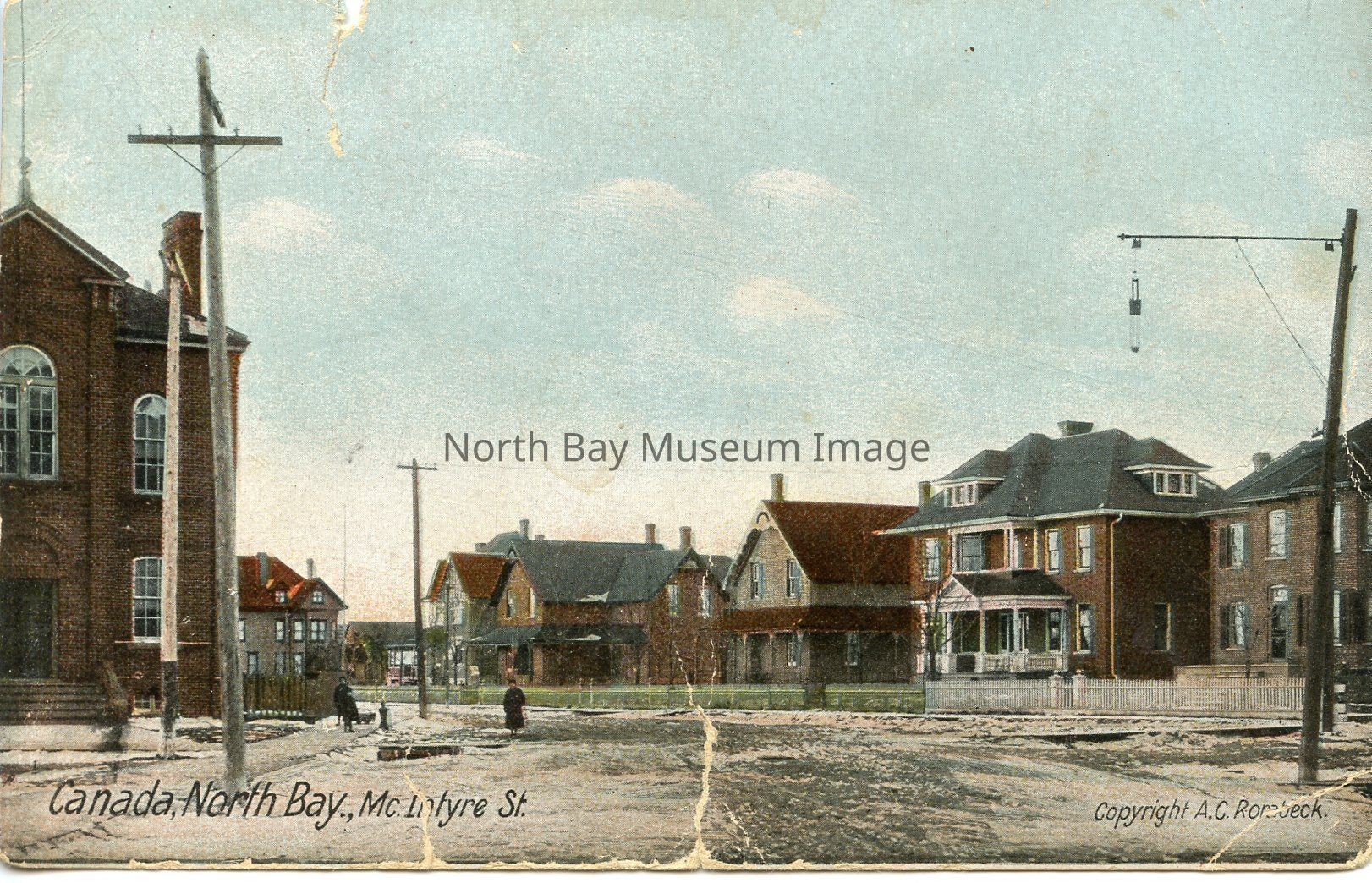 Written on the bottom left corner are the words "Canada, North Bay, McIntyre St." In the right corner at the bottom is "Copyright, A.C Rombeck" written. The picture taken at corner of Plouffe and McIntyre Sts.Creator