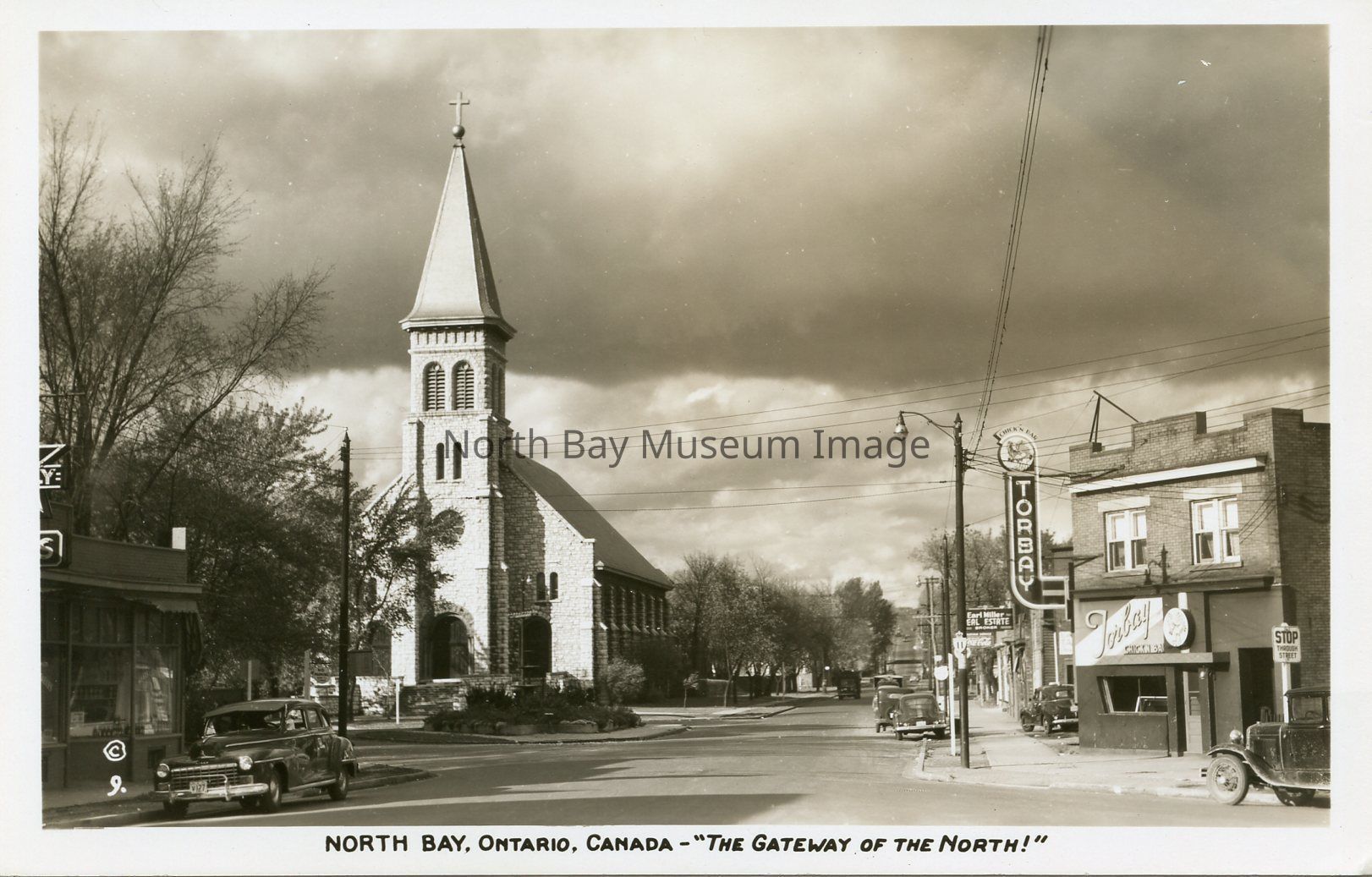 This is a black and white Postcard. The photo on the front of the postcard is of Algonquin Ave., North Bay. You can see the church on the corner of the road in the background. This is the site of the pro-cathedral of the assumption today. There are shops and restaurants on both sides of the street. There is a black car that is parked on the left side of the street.