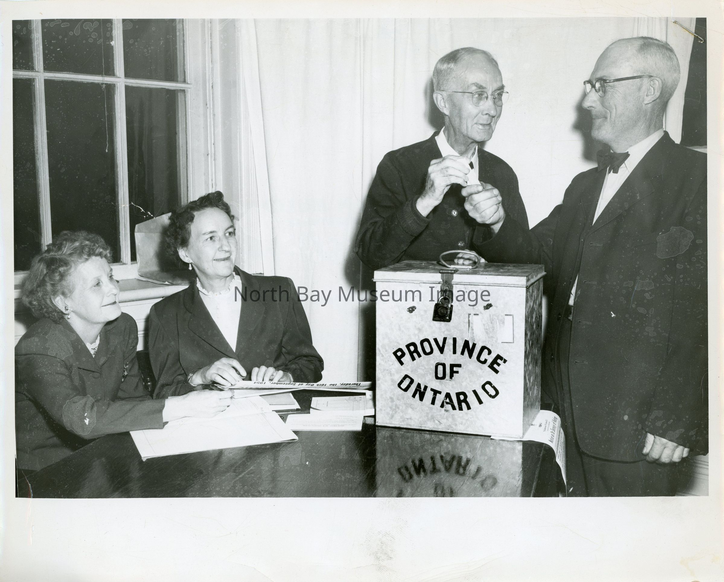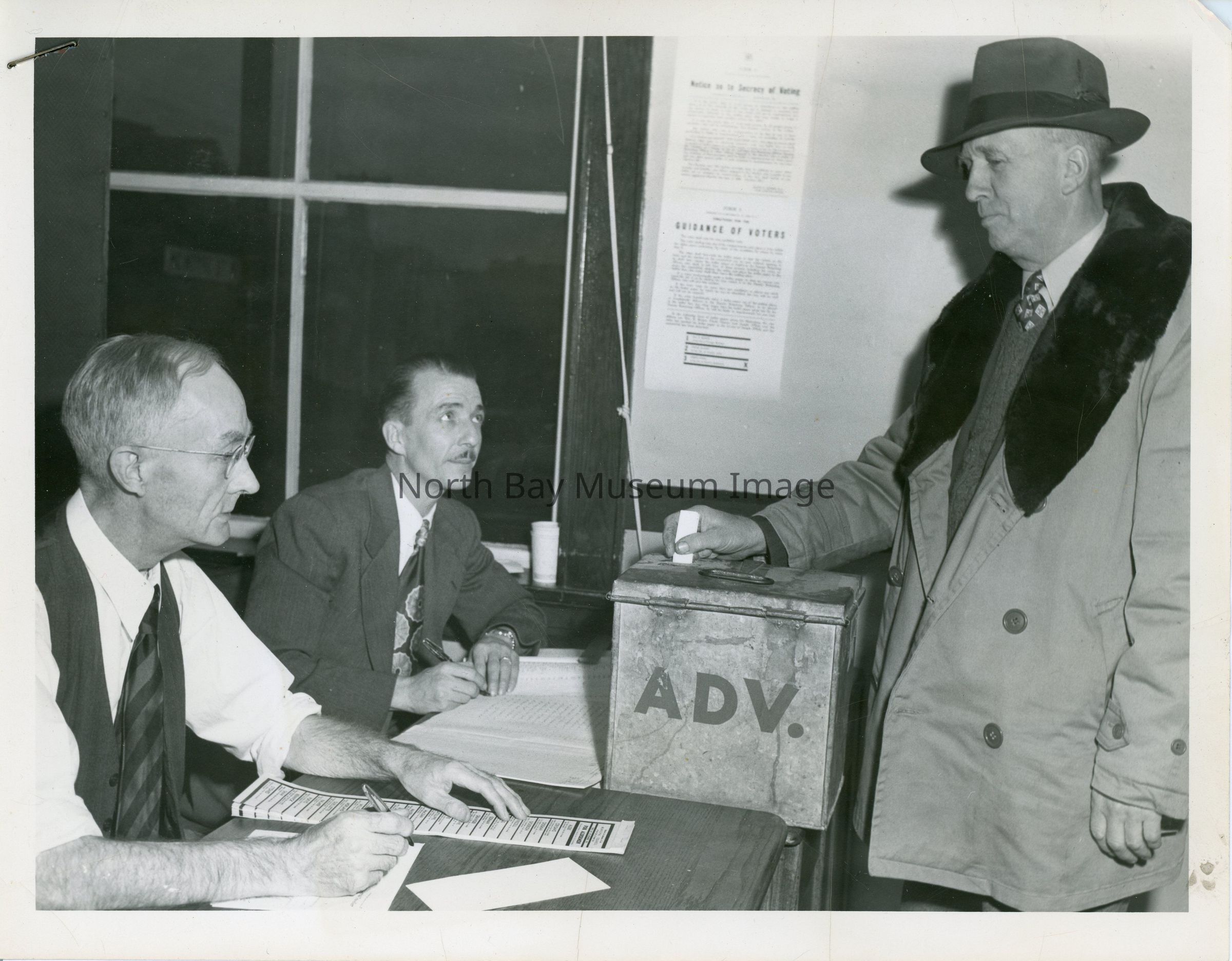 Photographs of provincial voting booths in North Bay. Identifed by descriptions written on the back of each photo. A- Frank Elston, Ab Lauder, Rw Banks written on back.B - Mrs. Elmer Sharette (Poll Clerk) Mrs Fred C. Foster (scrutineer) Frank Elston (deputy returning officer) J.J. Moor (ONR trainman) is pictured casting his vote.Date(s) of Creation