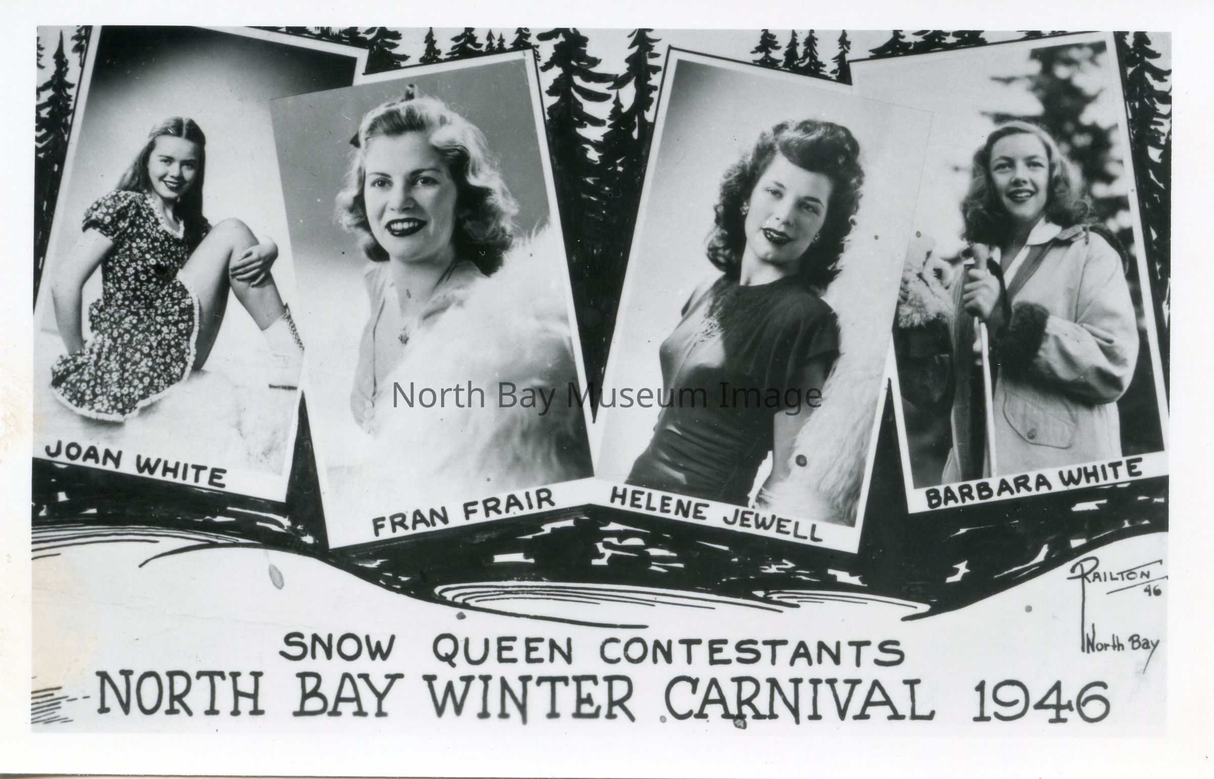 Postcard showing Snow Queen Contestants at North Bay Winter Carnival 1946 (Snow Frolic): photos of four contestants - Names: Joan White, Fran Frair, Helen Jewell, Barbara White. Back of card is blank