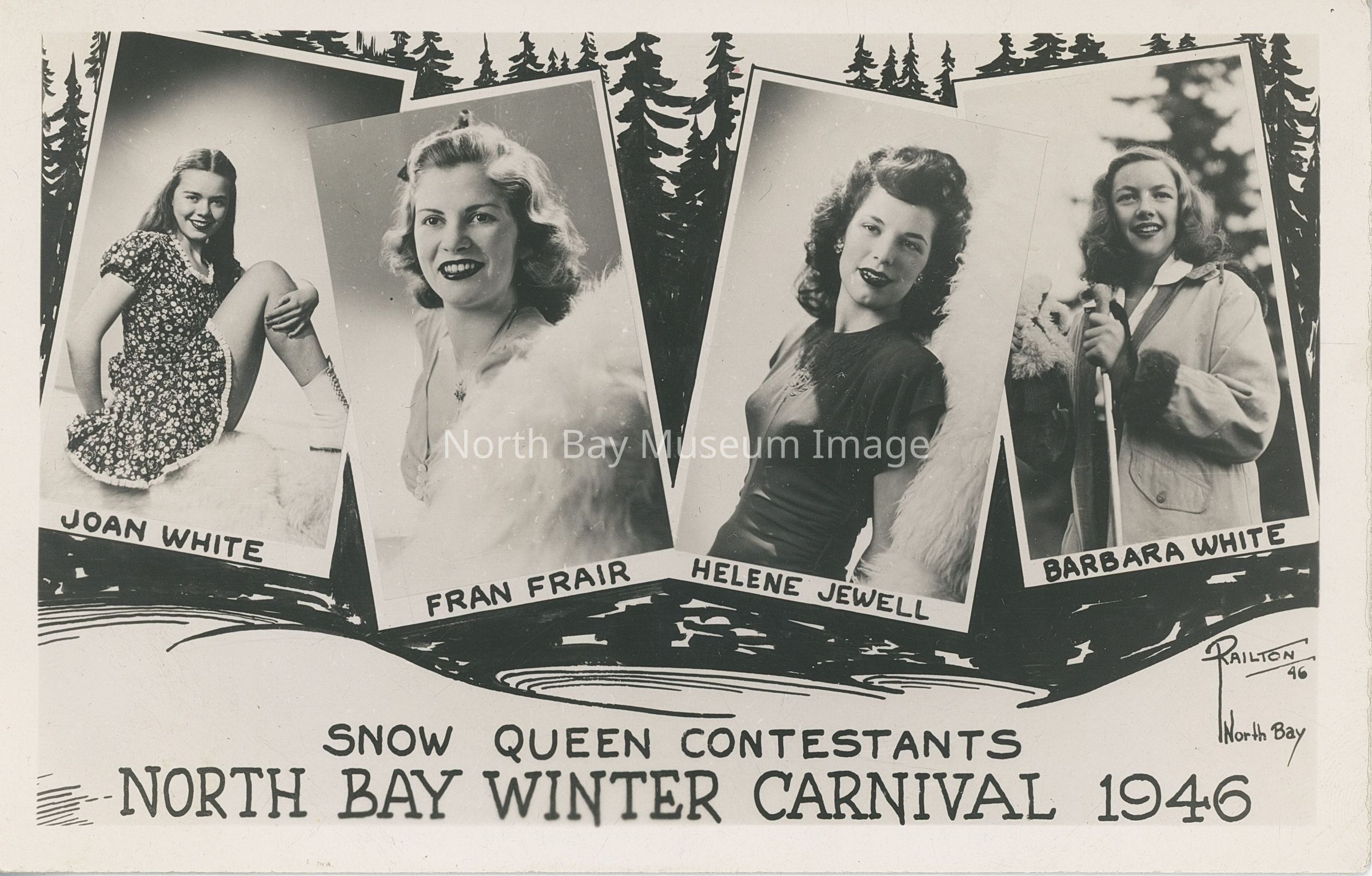 Postcard with text "Snow Queen Contestants North Bay Winter Carnival 1946" on front with images of contestants including Joan White, Fran Frair, Helene Jewell, and Barbara White. Railton photographer stamp in bottom right corner. The 1946 carnival was known as the "Snow Frolic".