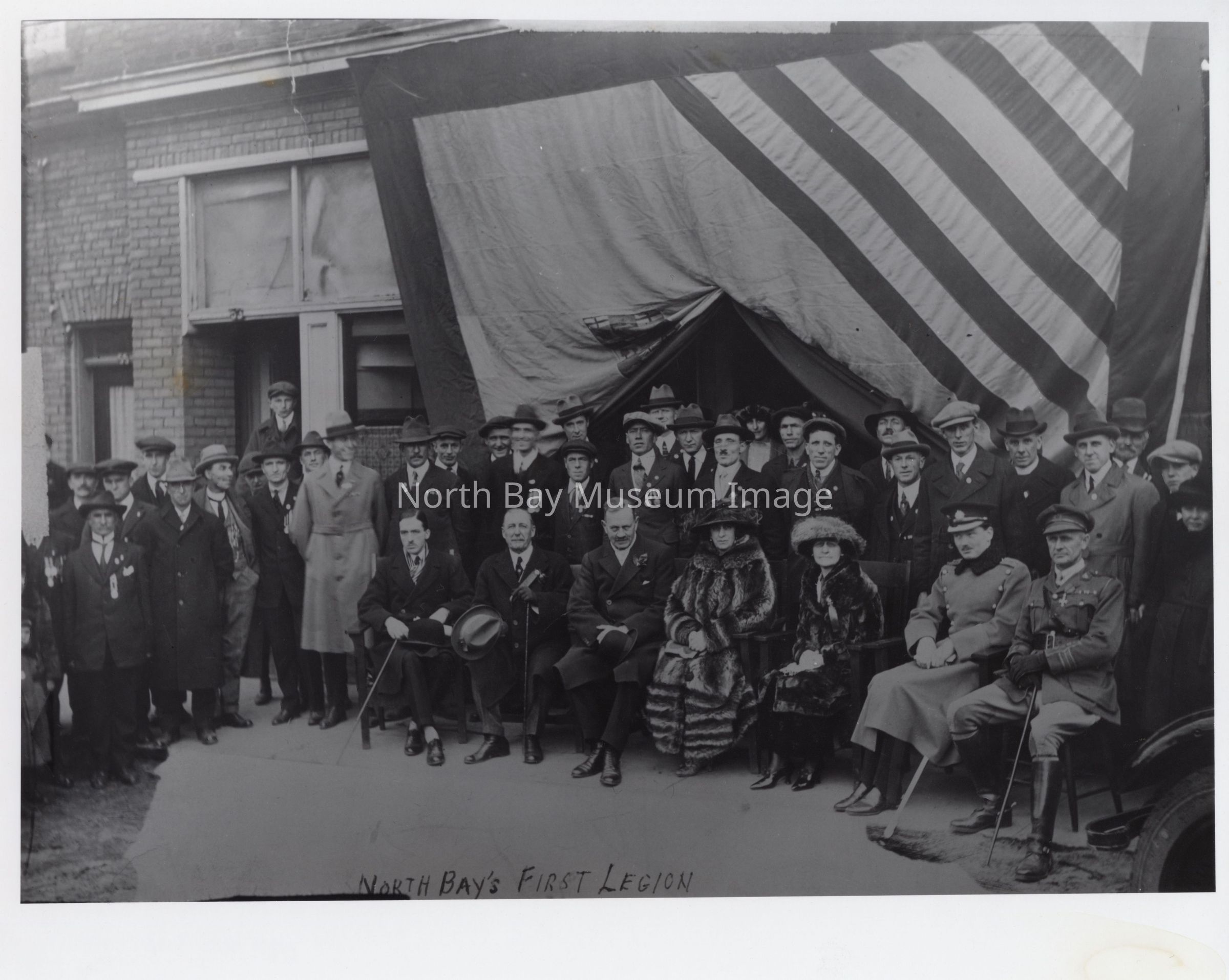 Print of photogrgraph of North Bay's First Legion (opening?). North Bay's First Legion is written across the bottom with a group shot.