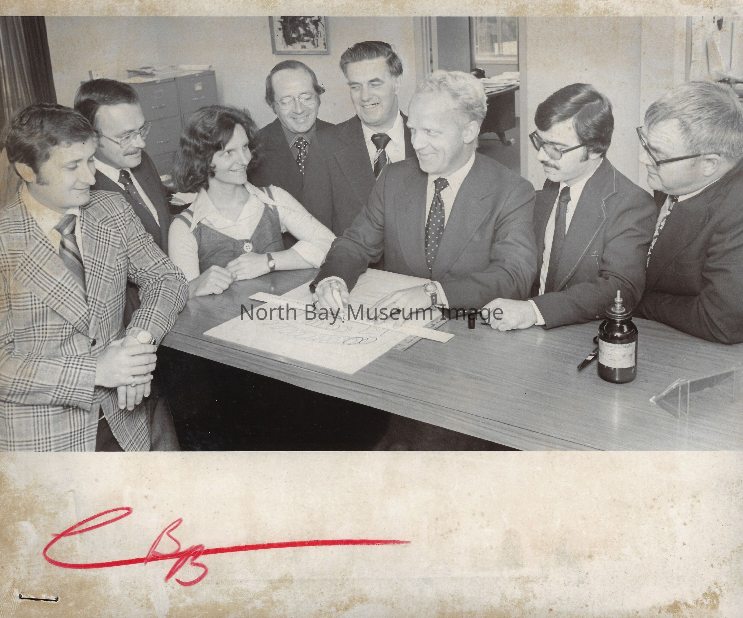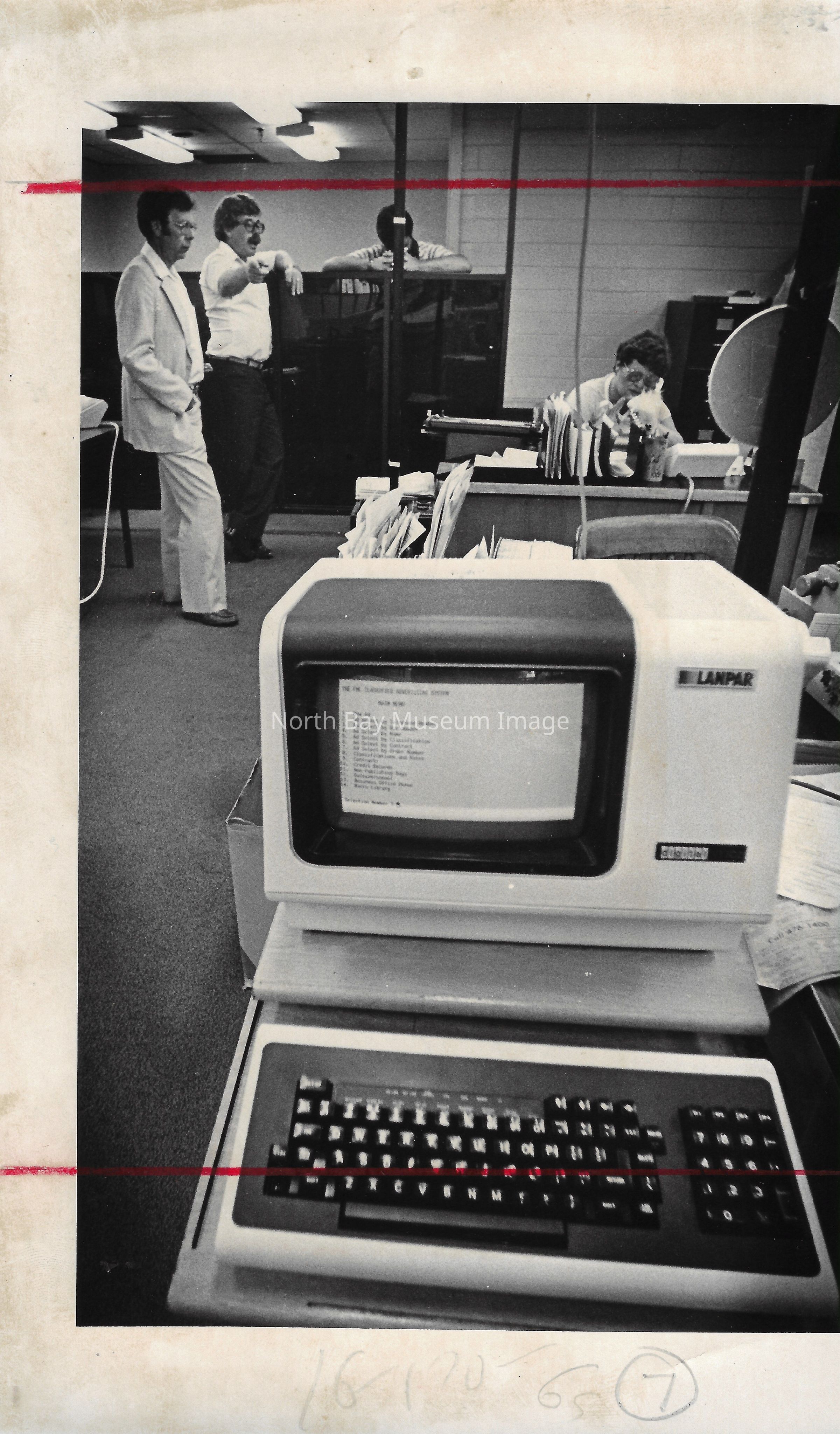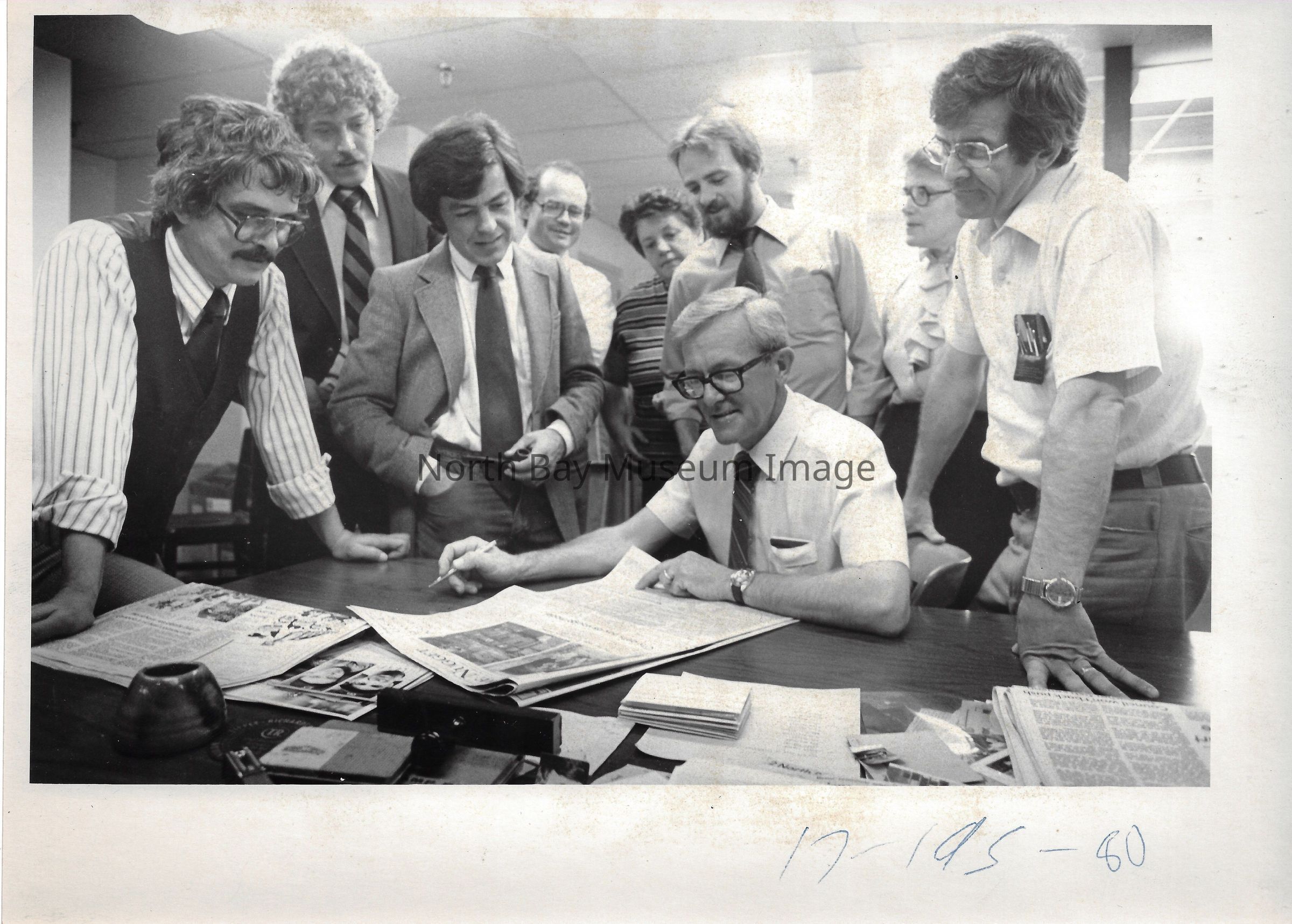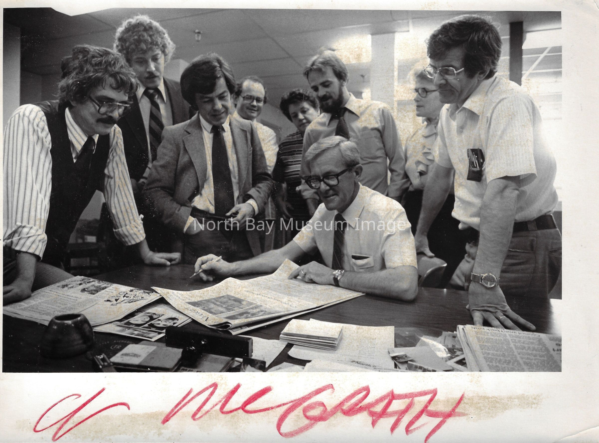 022.01.70r: Editorial department. Brett, Don Buckley, Colin, & Mort. Betty Alcorn in the news department on far left. Middle desk was called “the rim”.