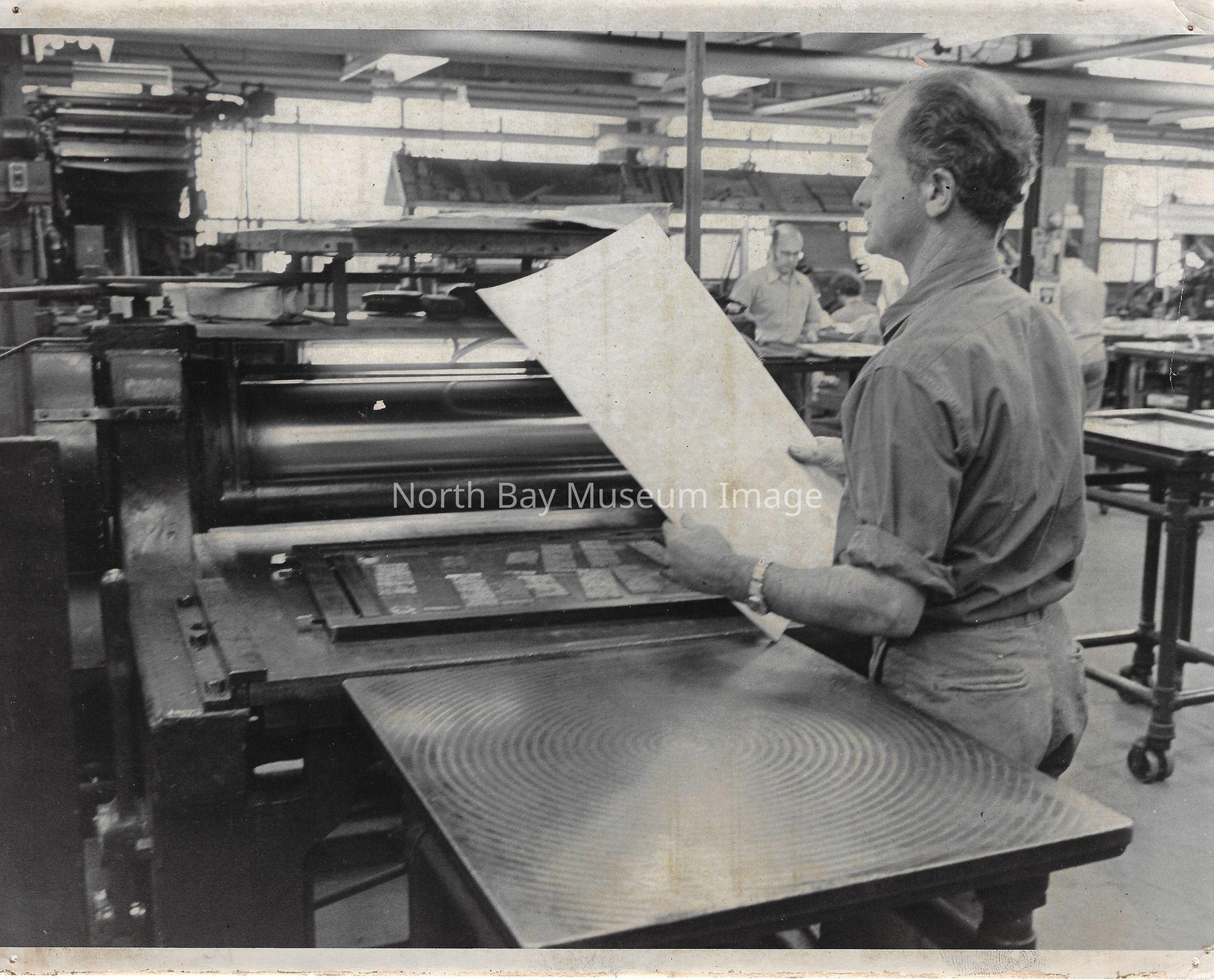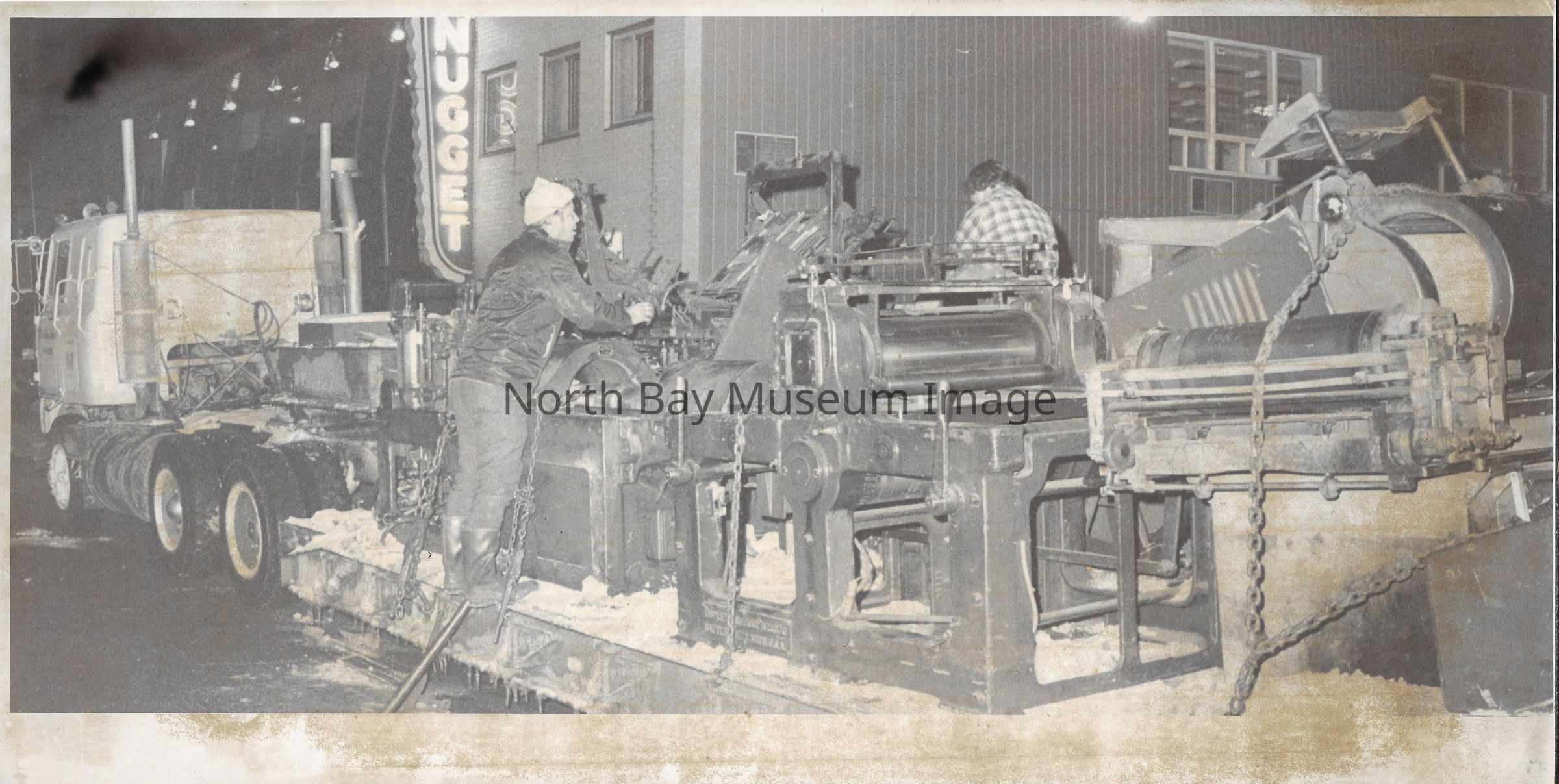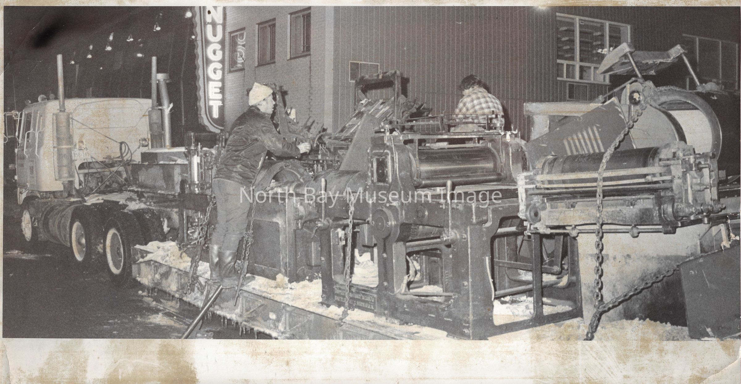 022.01.70aq: The old press. Press was brought to the Nugget building in 1956. Taken from the St. Regis Hotel. The rolls of paper were supplied by Abbott-tibey? Mills up North.