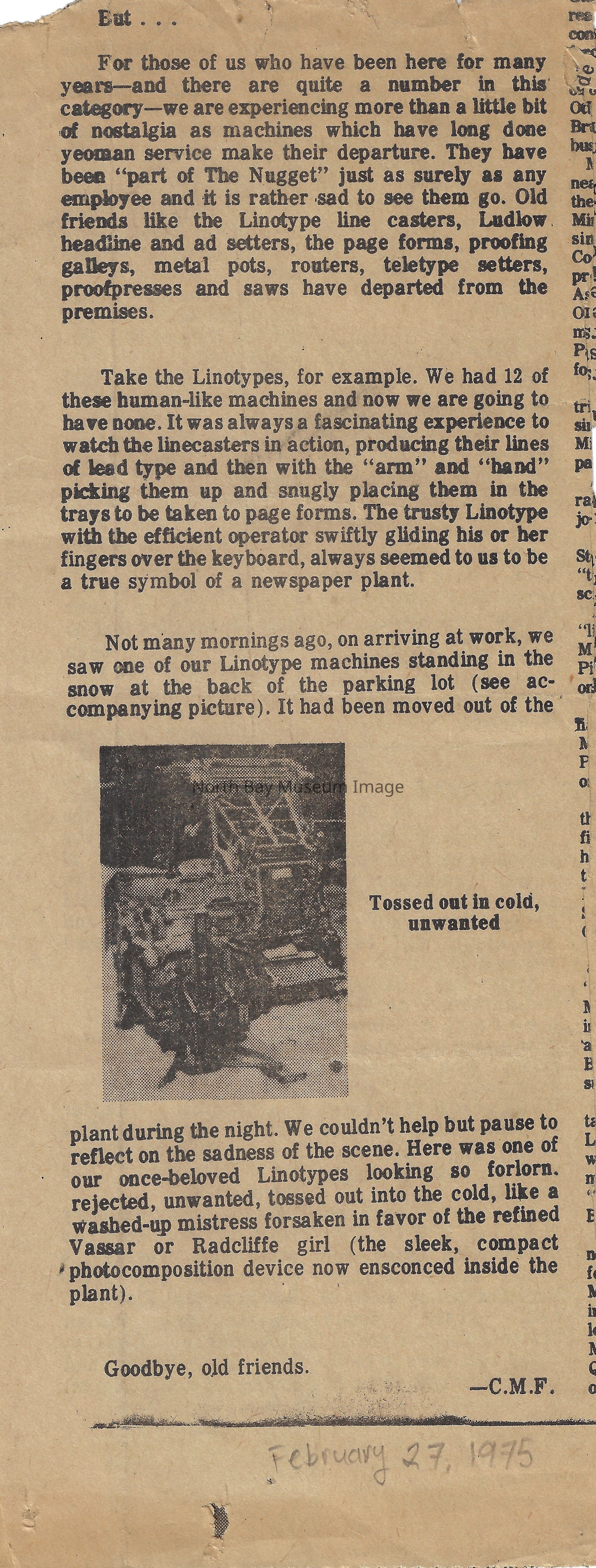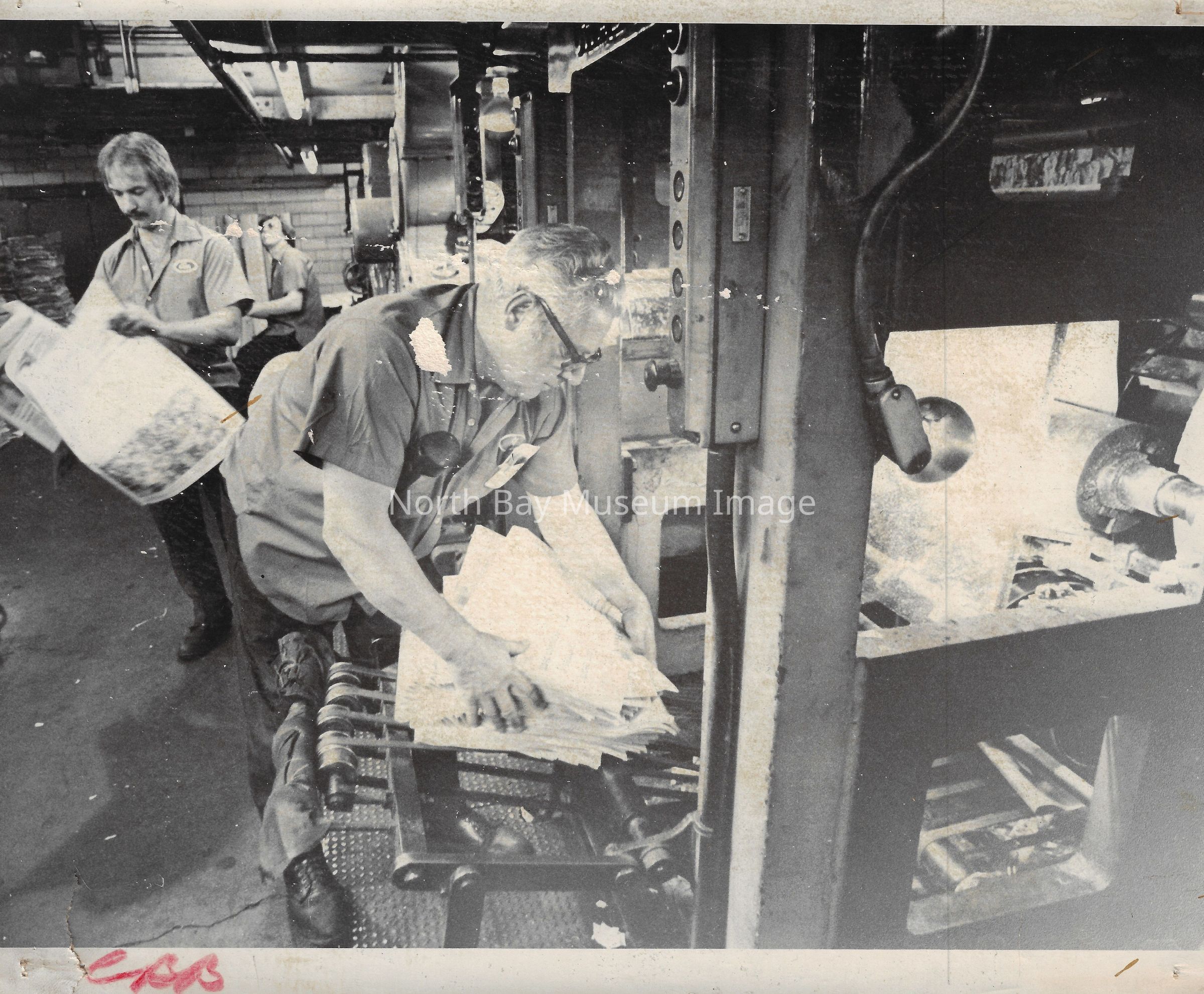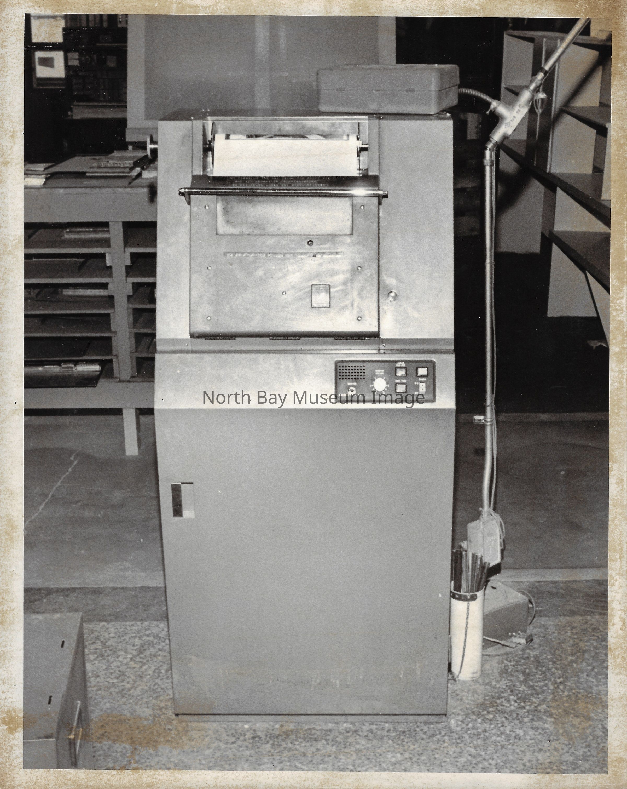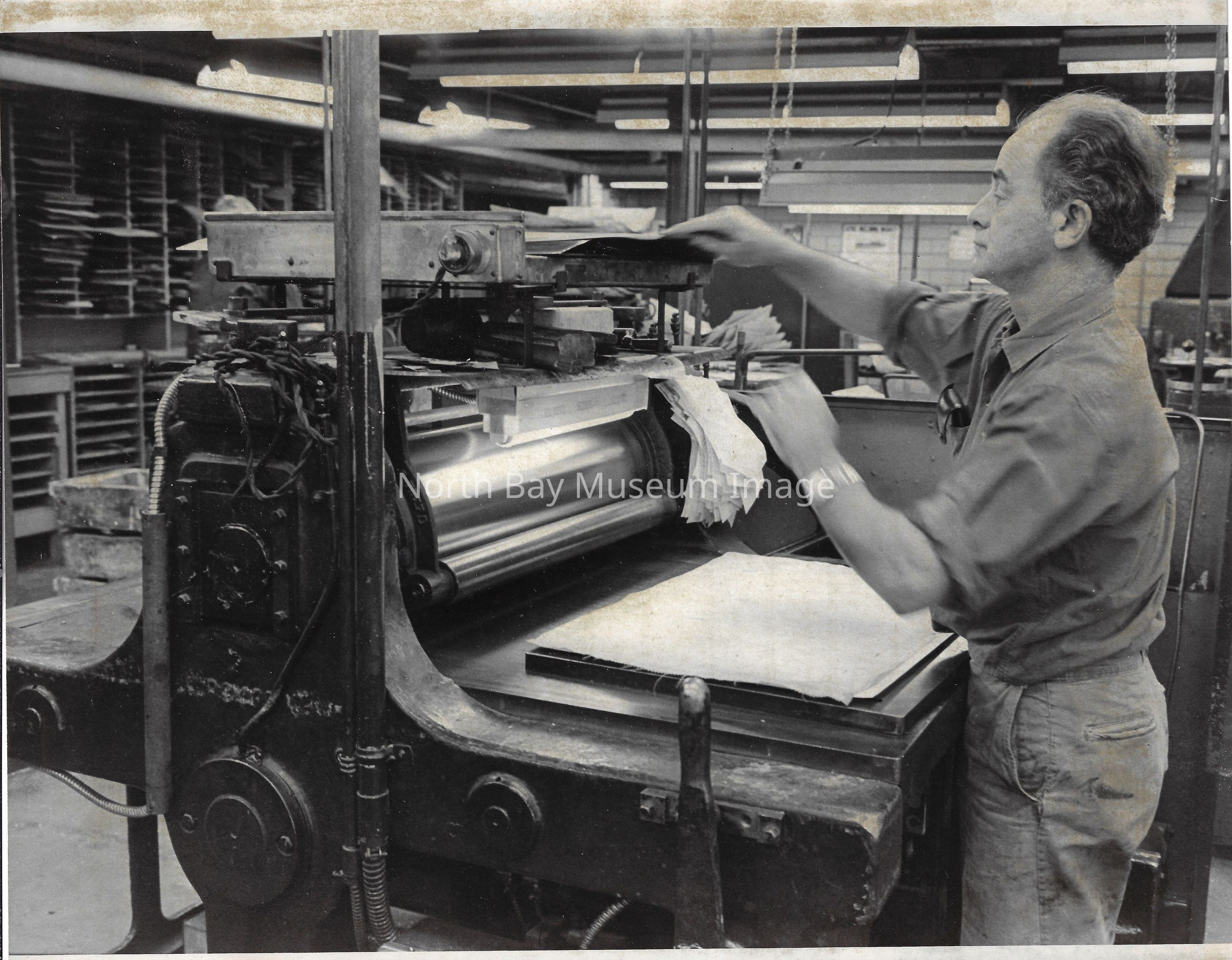 022.01.70aq: The old press. Press was brought to the Nugget building in 1956. Taken from the St. Regis Hotel. The rolls of paper were supplied by Abbott-tibey? Mills up North.