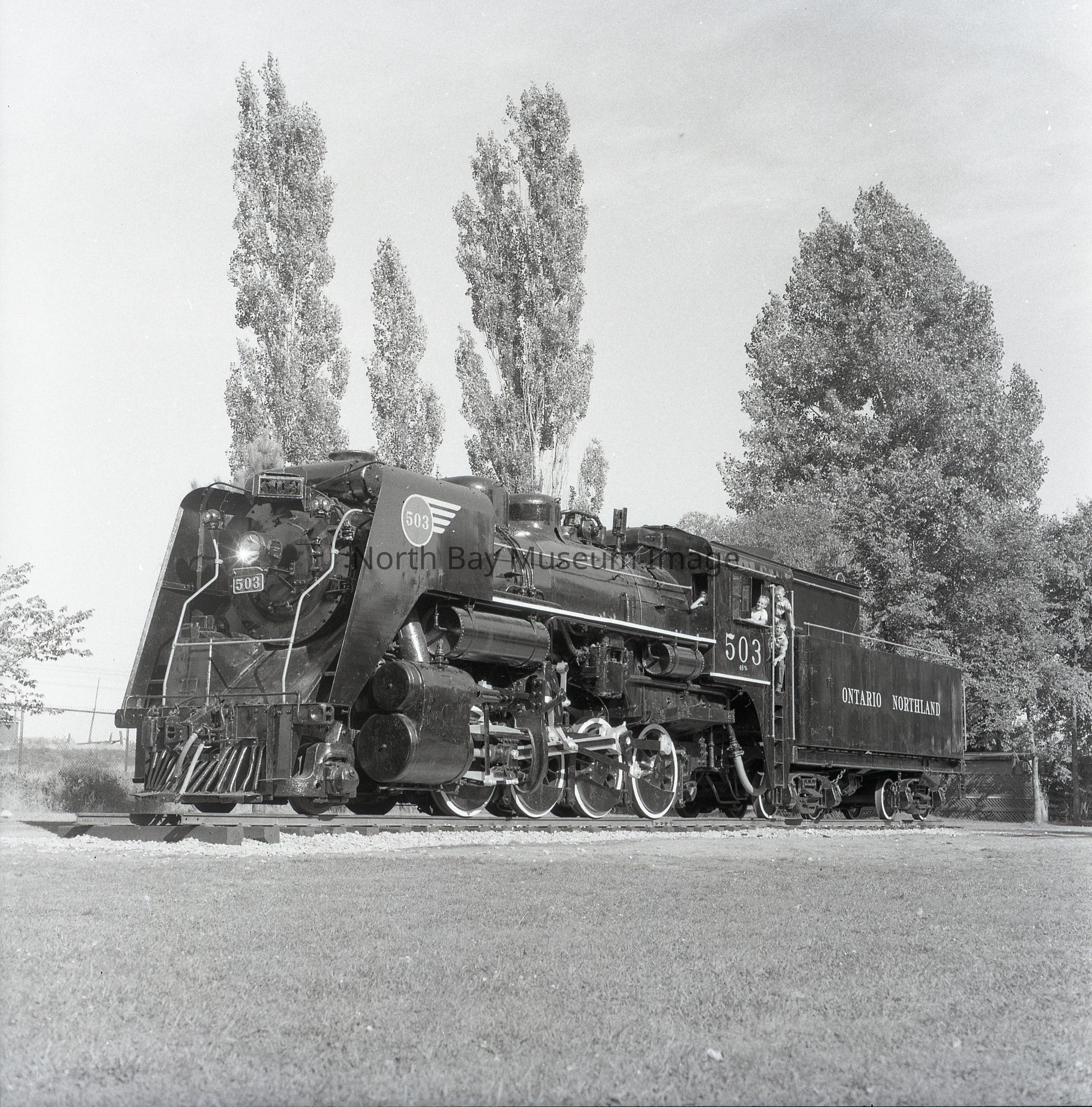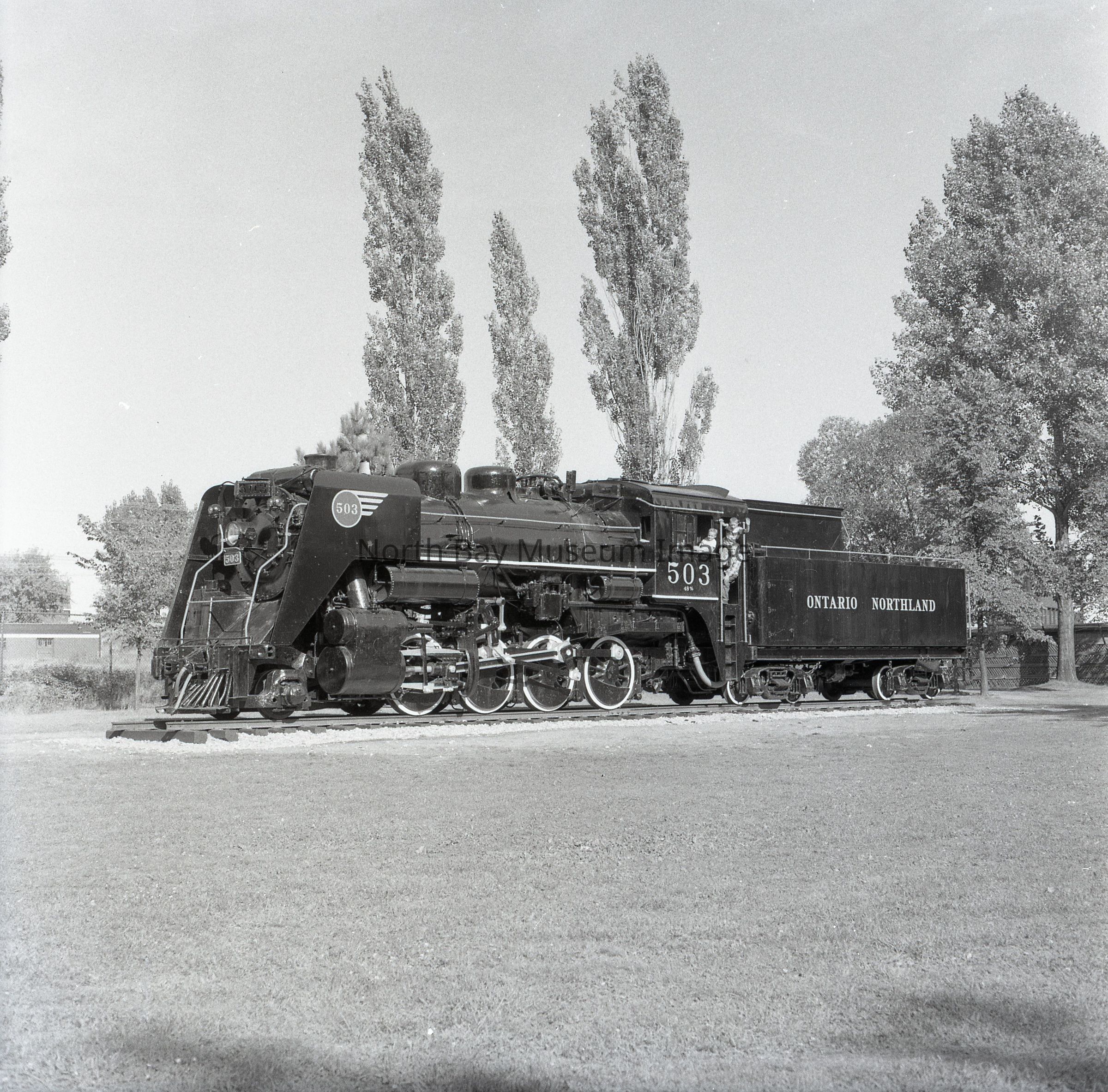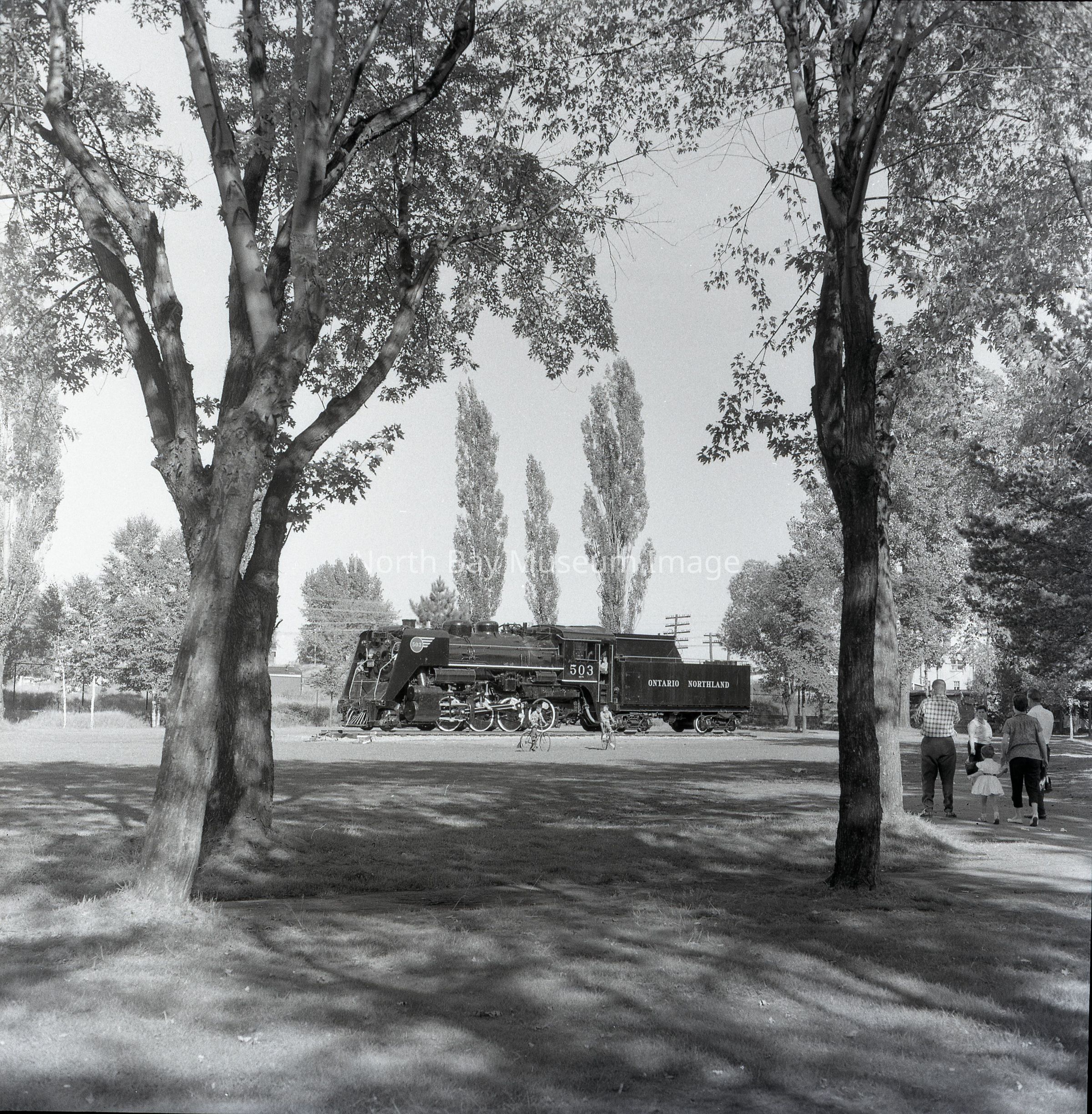 019.60.415b-e - ONR Engine 503 displayed Lee Park, North Bay, photo + negative. 3 different negatives - distance + 1 black and white.Creator