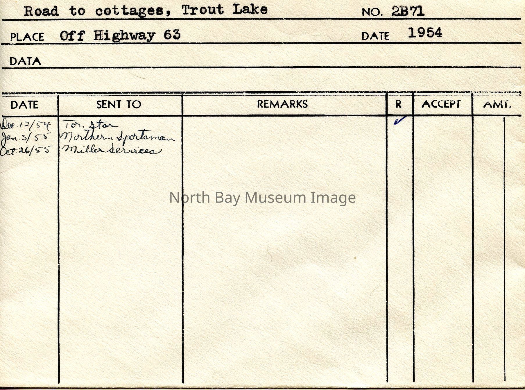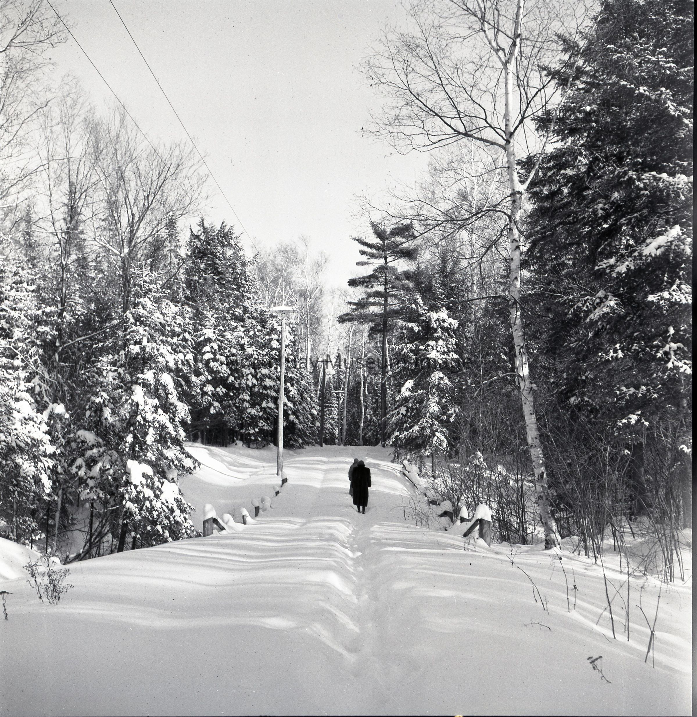 Photographer's Envelope (a) containing photograph and negative (b-e) of a road to the cottage on trout lake. The image shows a person walking down the road, it is snow covered, and they are surrounded by trees. A part of the Forder Collection. The photographers original number is 2B71. All of the photographs publications are listed on the the envelope.Creator