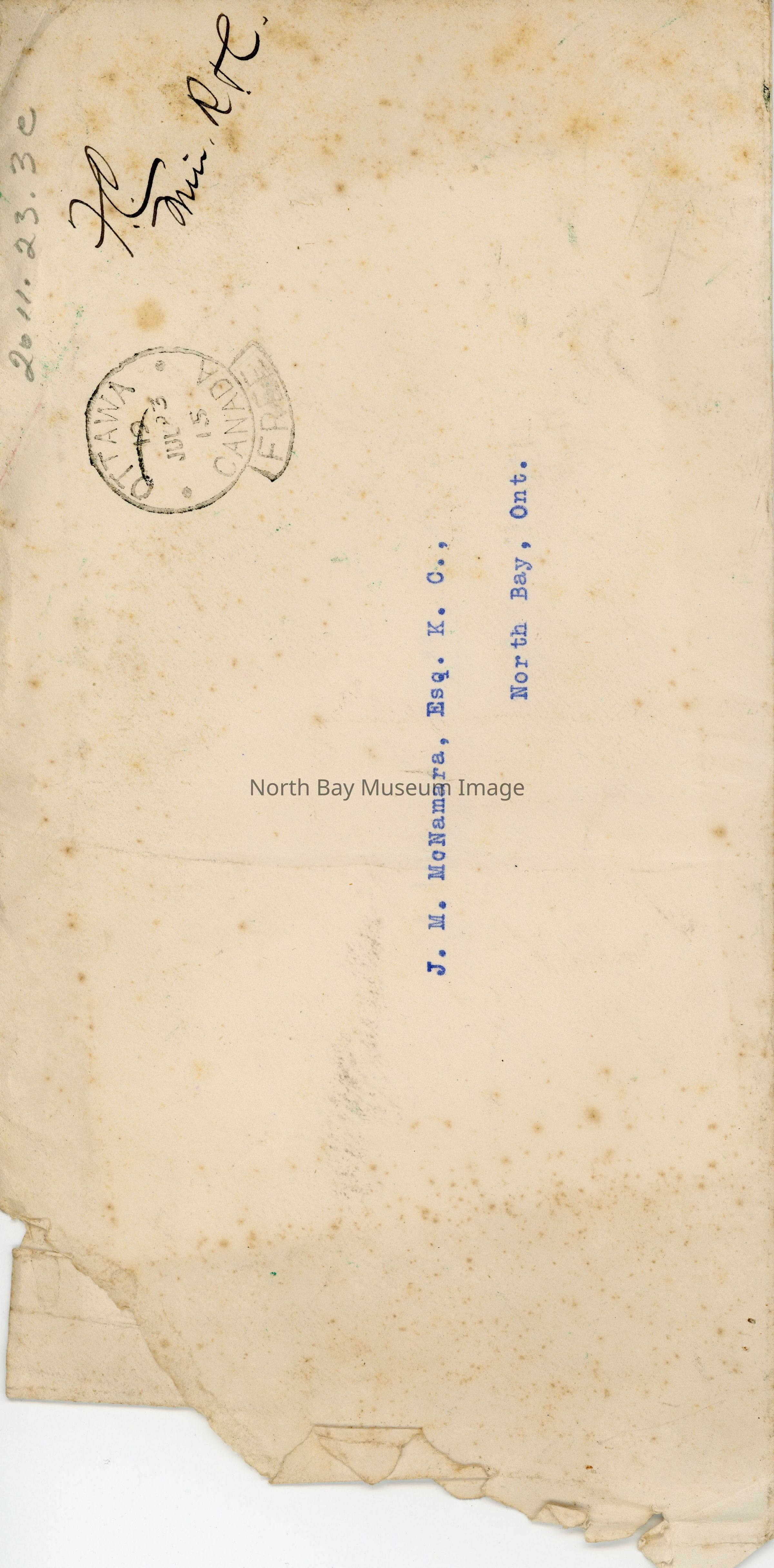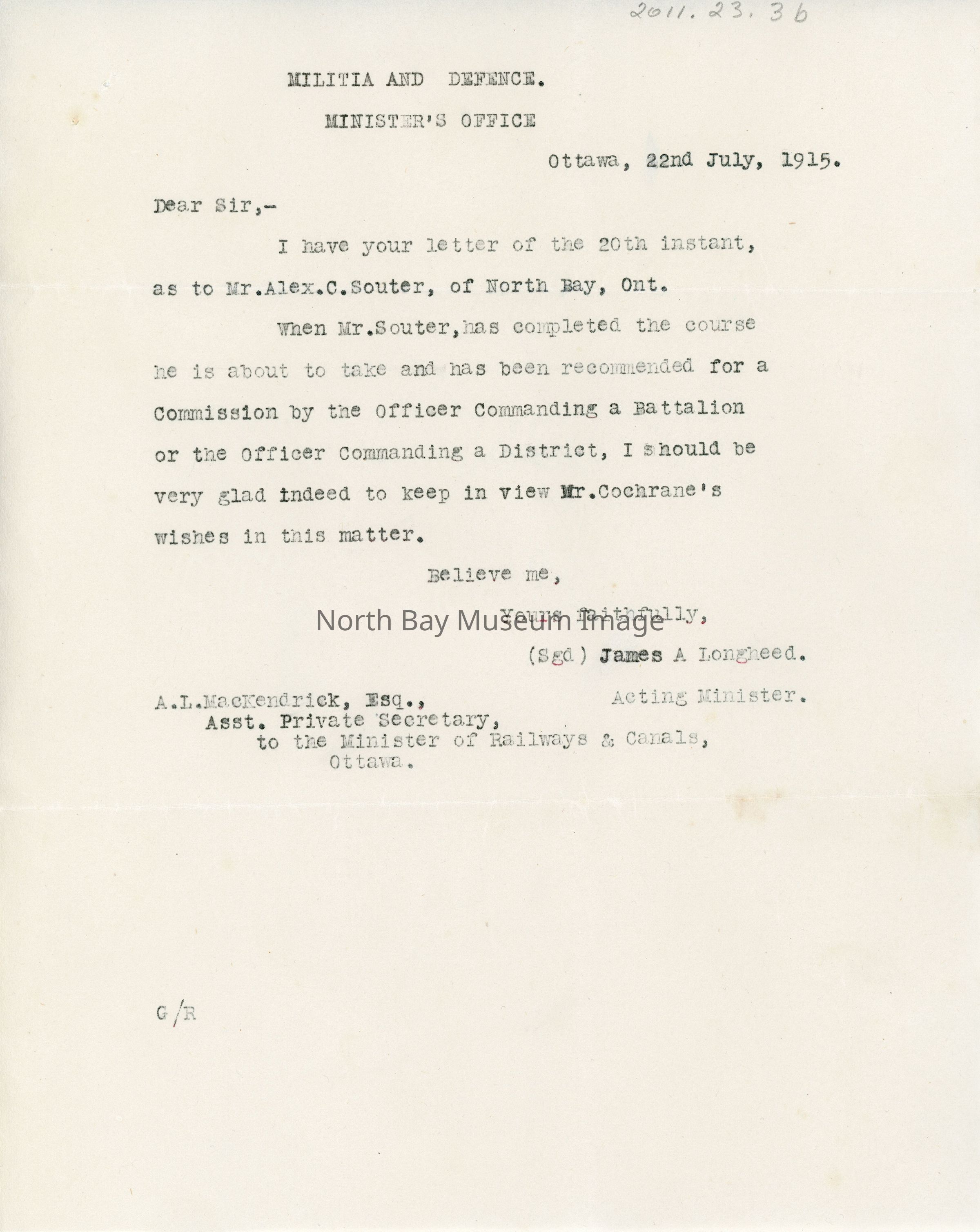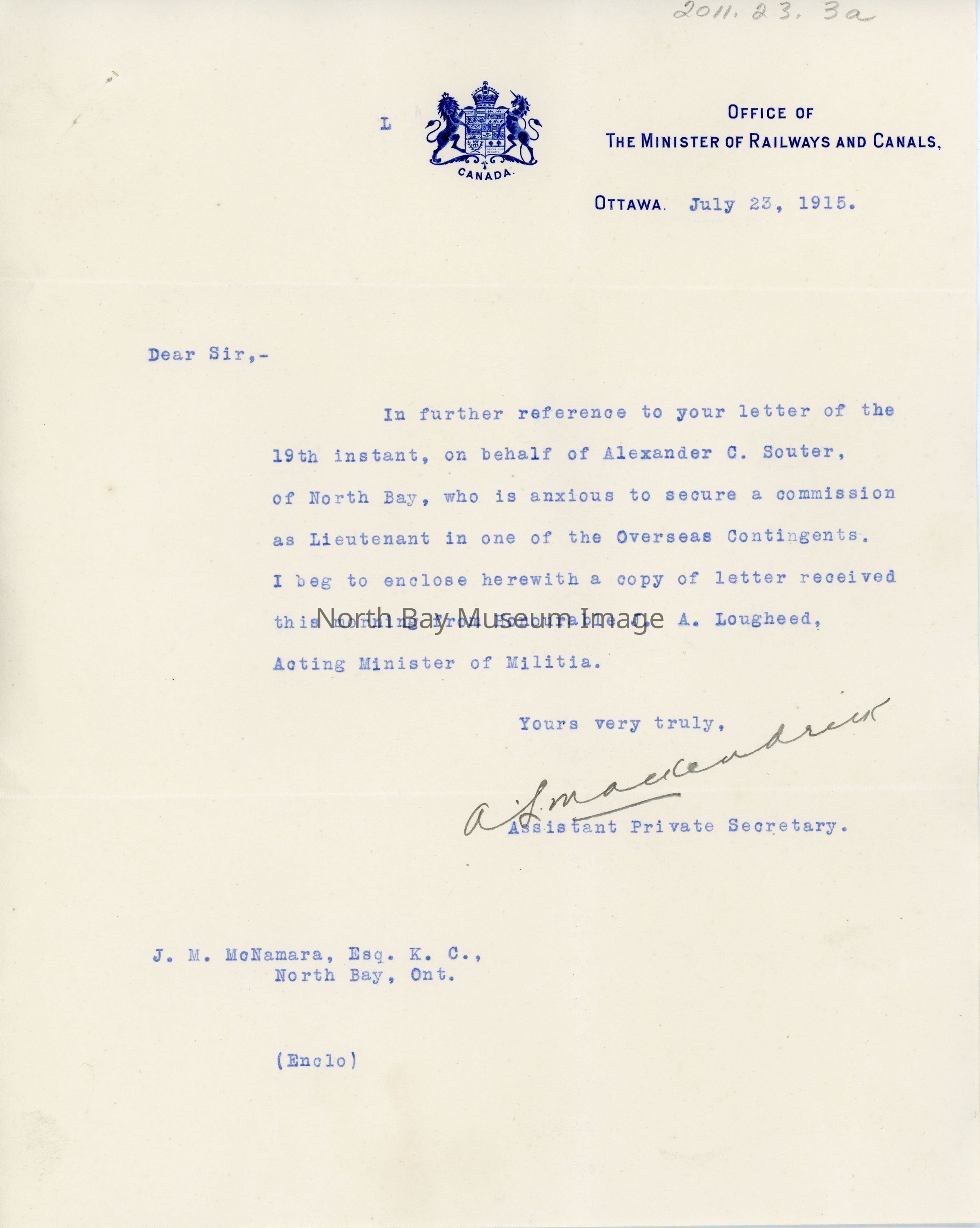 A- Letter from the Office of Railways & Canals sent with B- Letter from Militia & Defence Minister's Office in an envelope (C) which contained both letters. Letters were sent regarding Captain Alex C. Souter's Commision