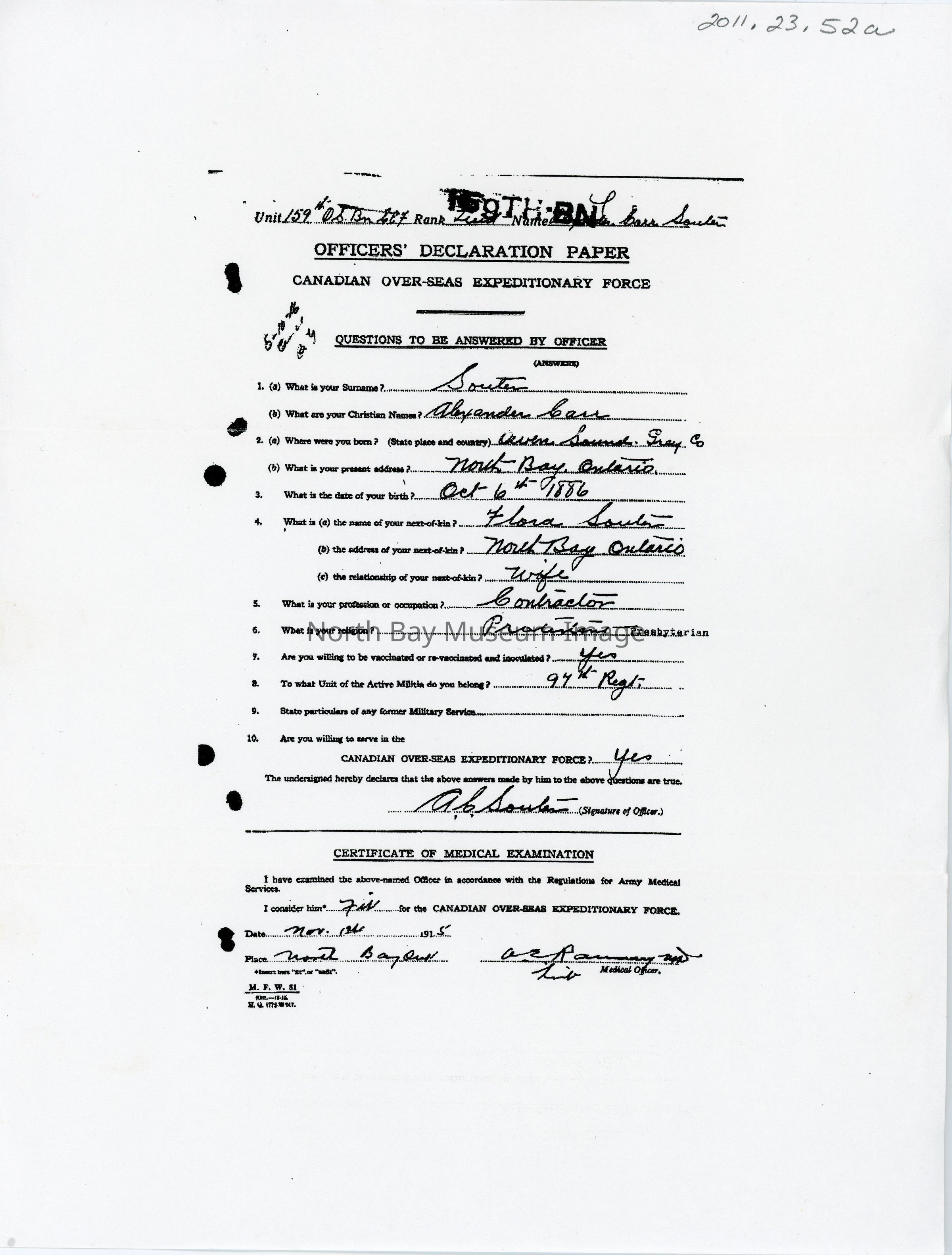 a- Copy of Officer's declaration for Alexander Carr Souter & Canadian Overseas Expeditionary Force dated November 1, 1915