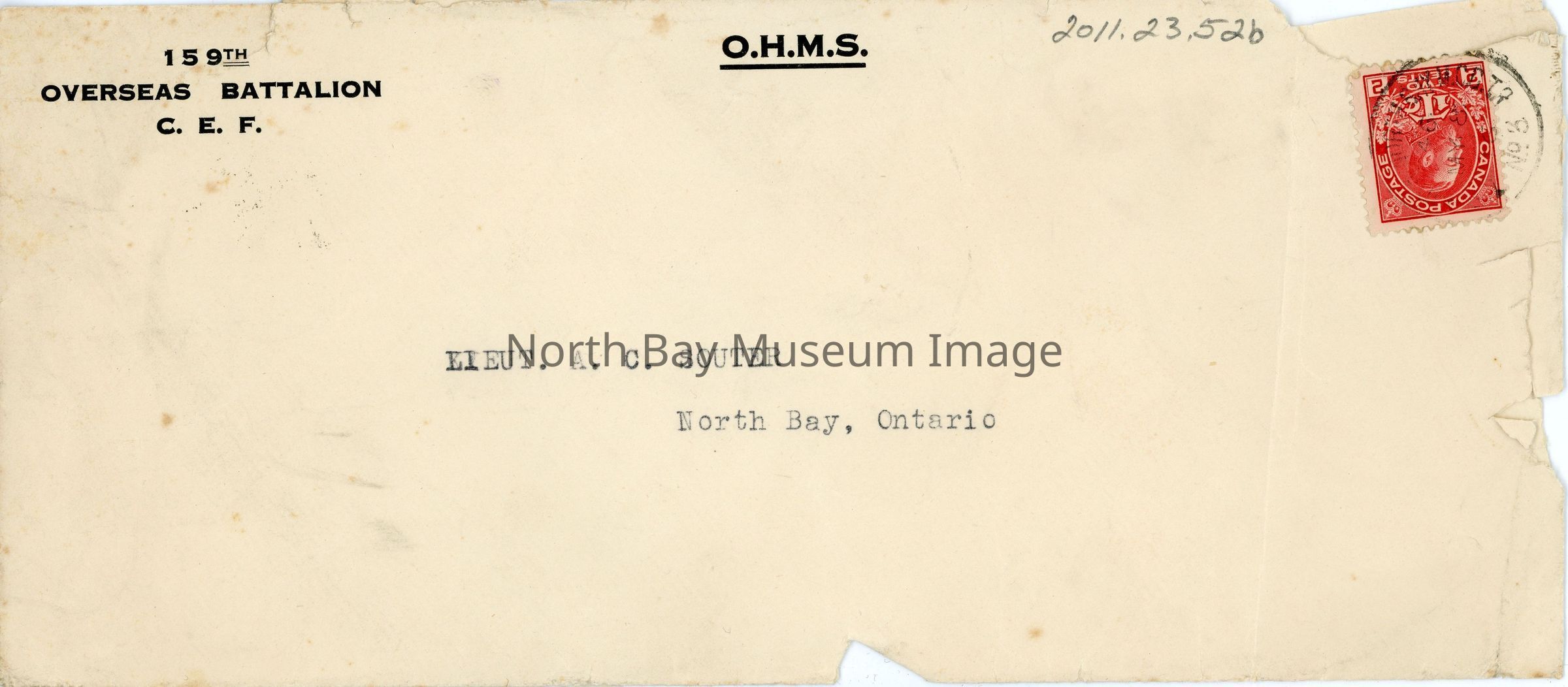 b- Business sized envelope containing the above letter from the 159th Battalion C.E.F. addressed to Liet A.C. Souter, North Bay, ON. Red stamp of George V upside down.