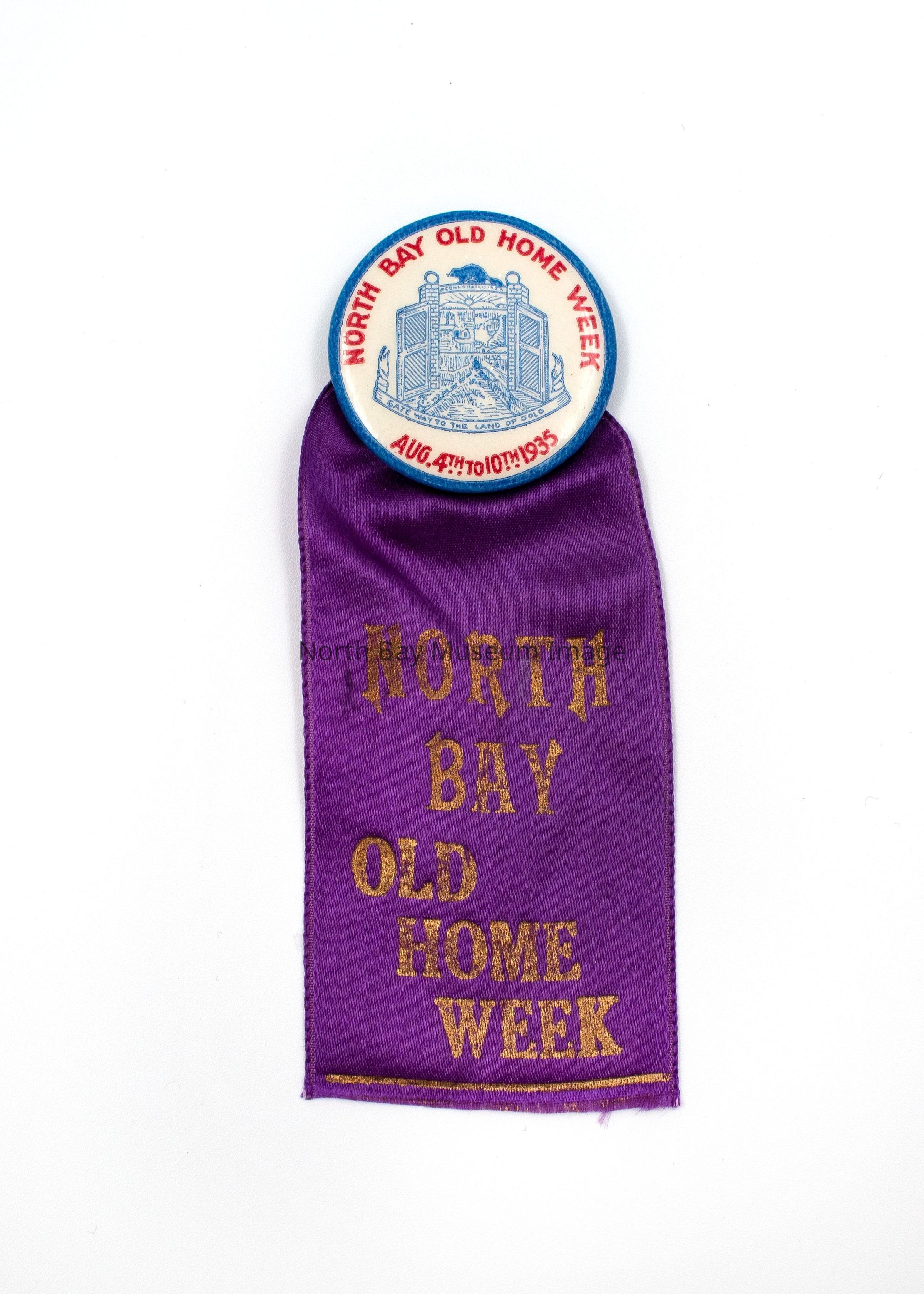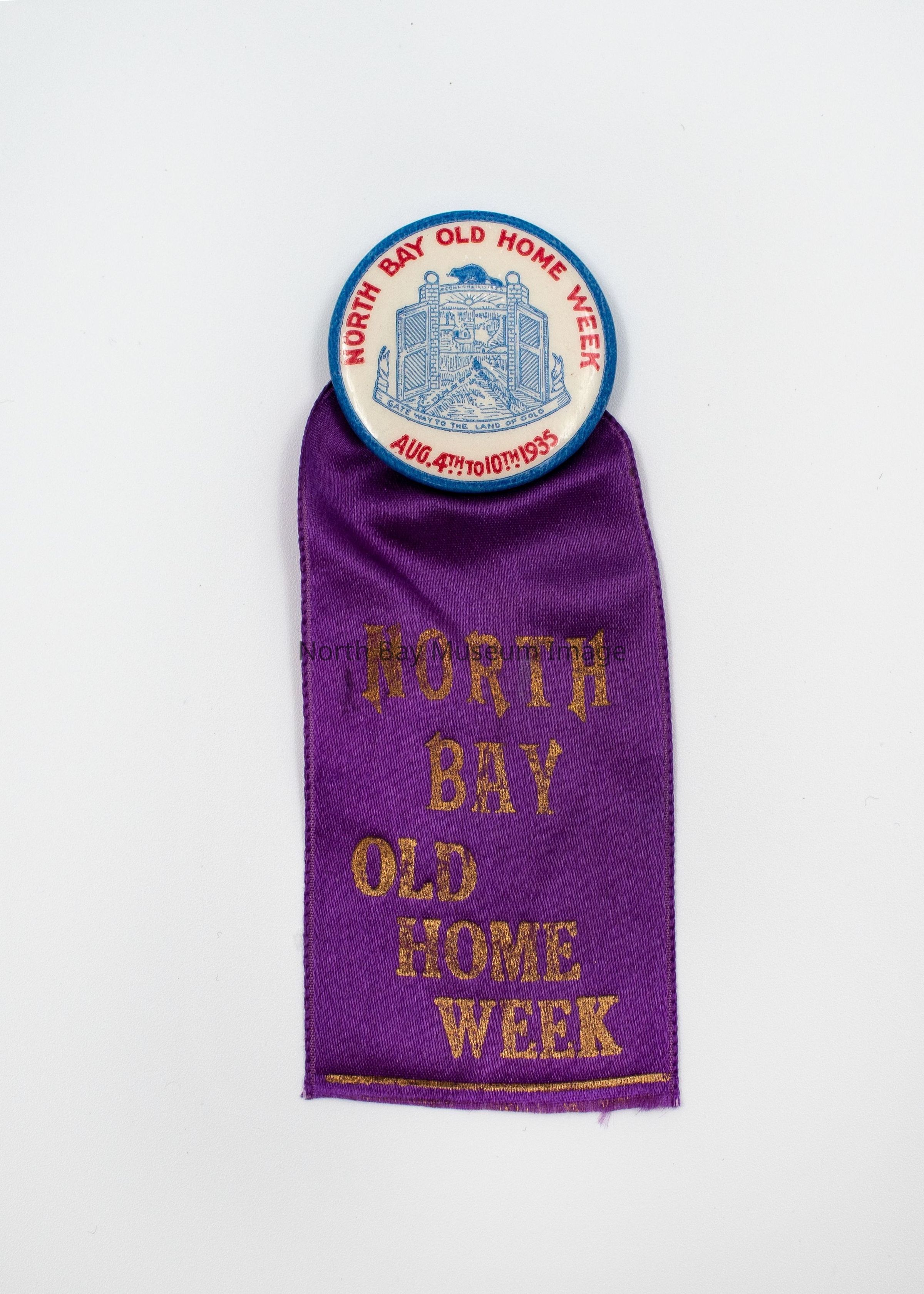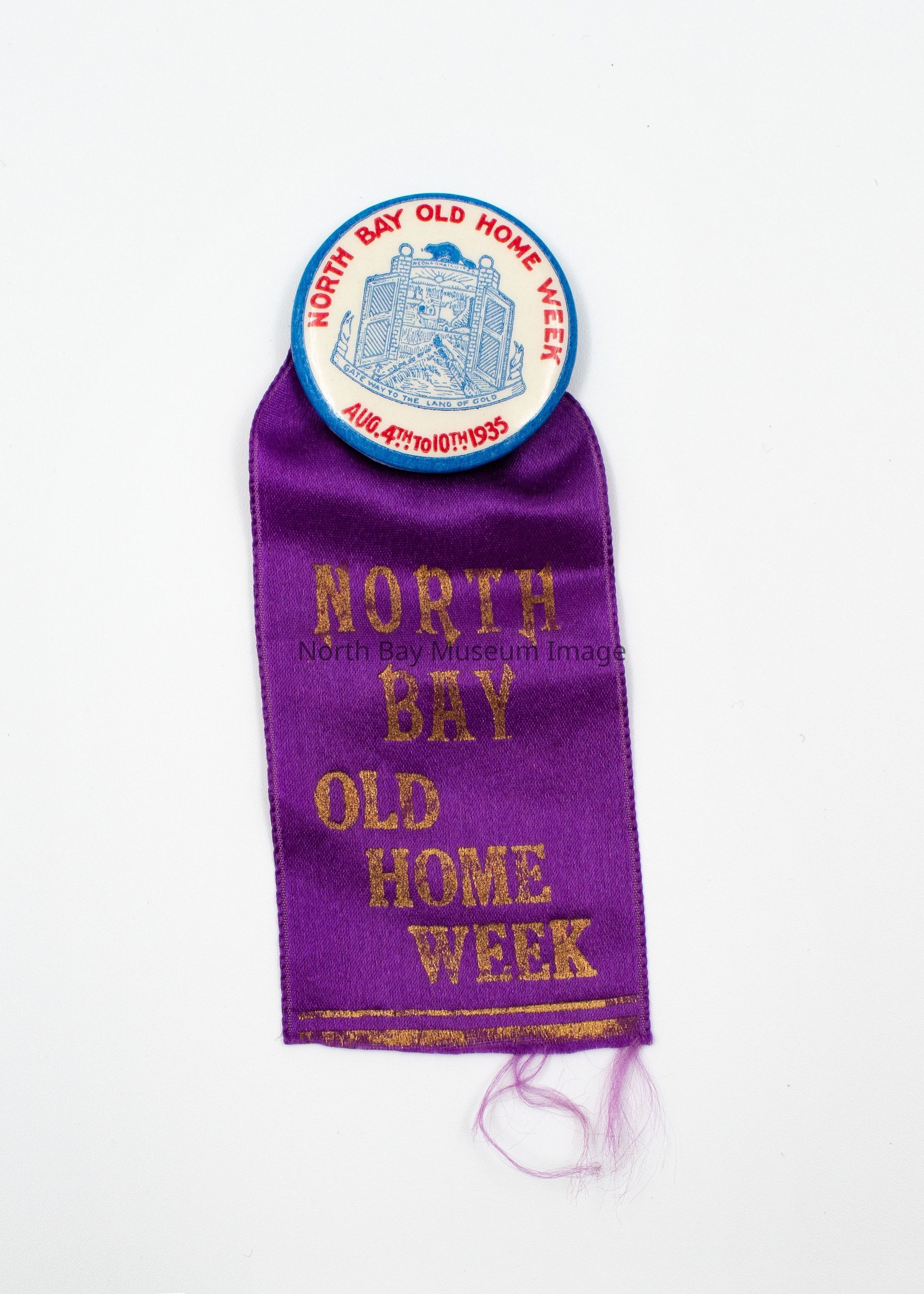 A--button, pins with ribbon white with blue outline and red lettering, North Bay Old Home Week Aug. 4th to 10th 1935, with crest, purple ribbon with gold lettering, North Bay Old Home Week, ribbon frayed on bottom B--same as A