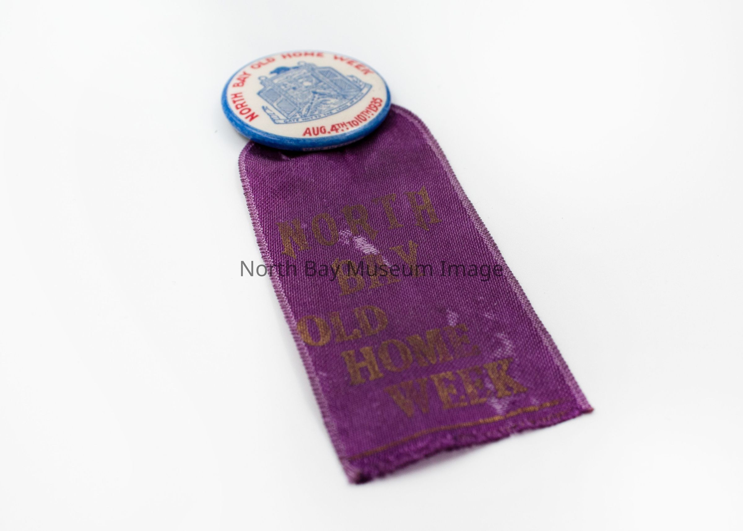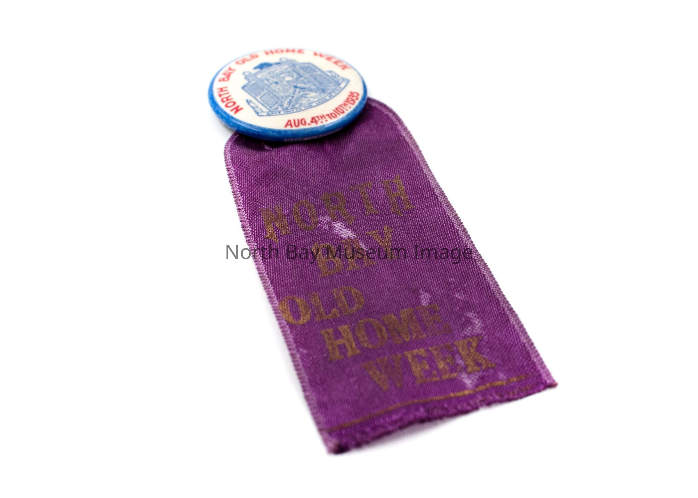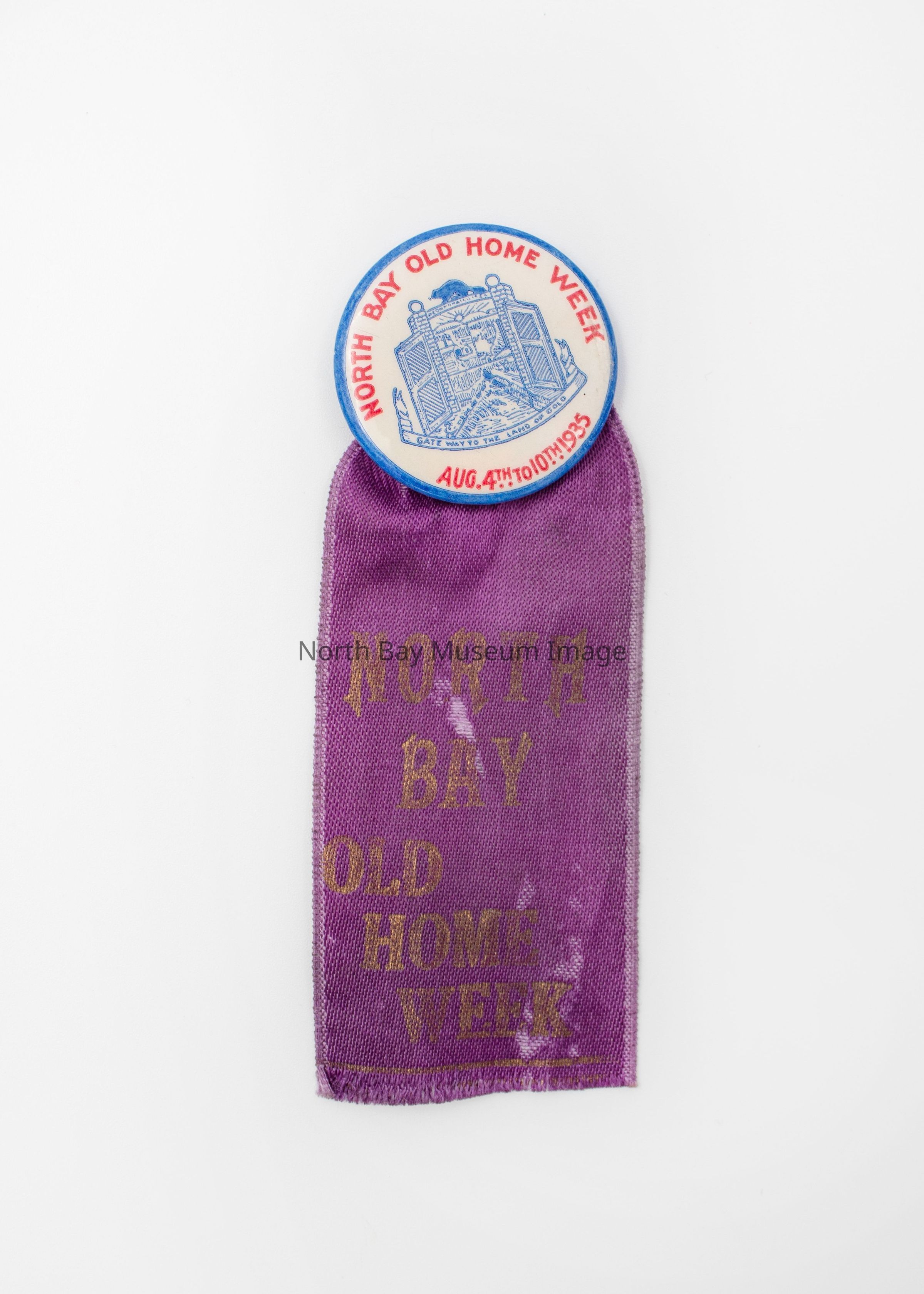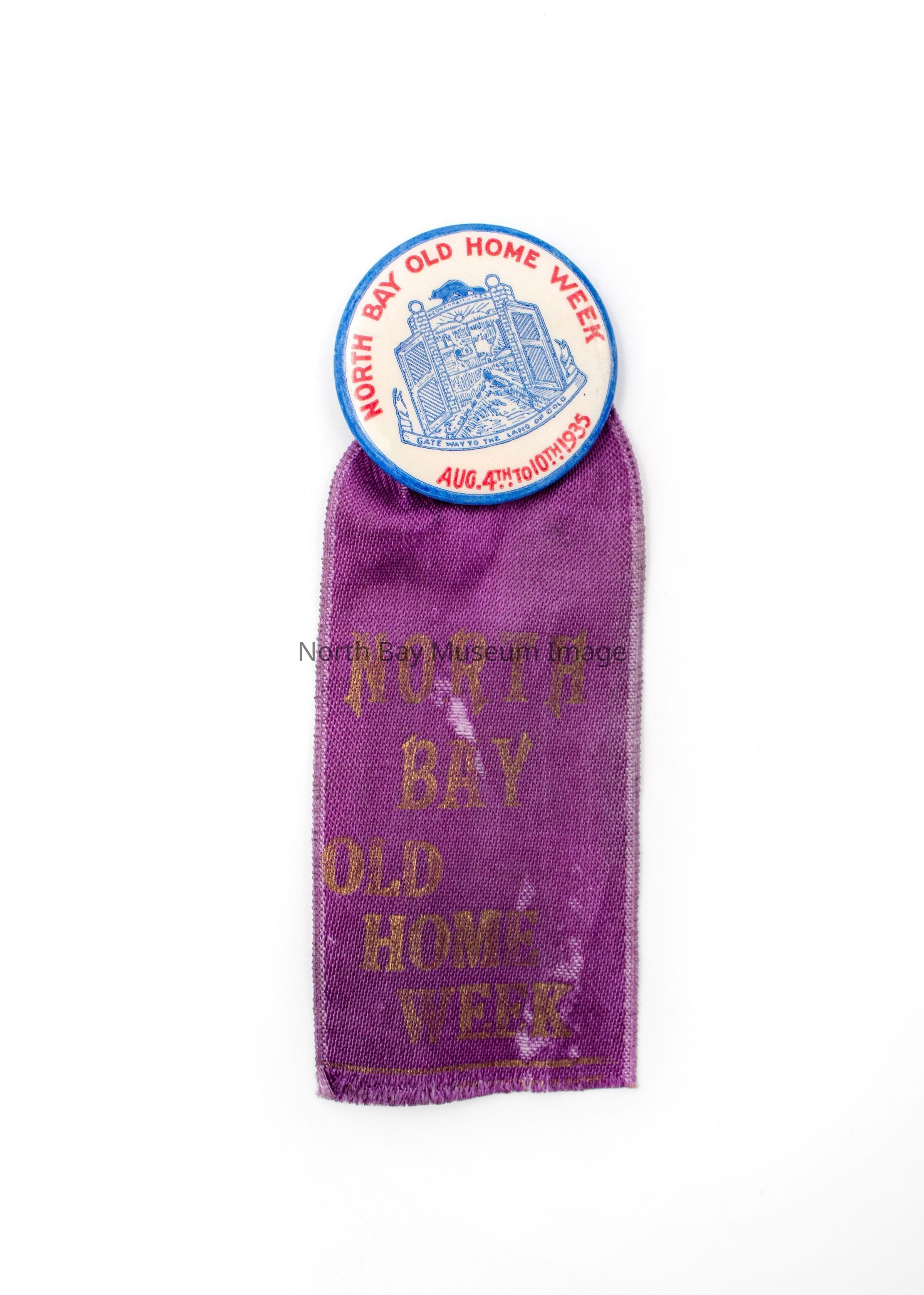 North Bay Old Home Week August 4-10 1935 written around the edge of the button with picture of arch and illustration with Gateway to the Land of Gold across the bottom of the image. Ribbon is attached to button which says North Bay Old Home Week.