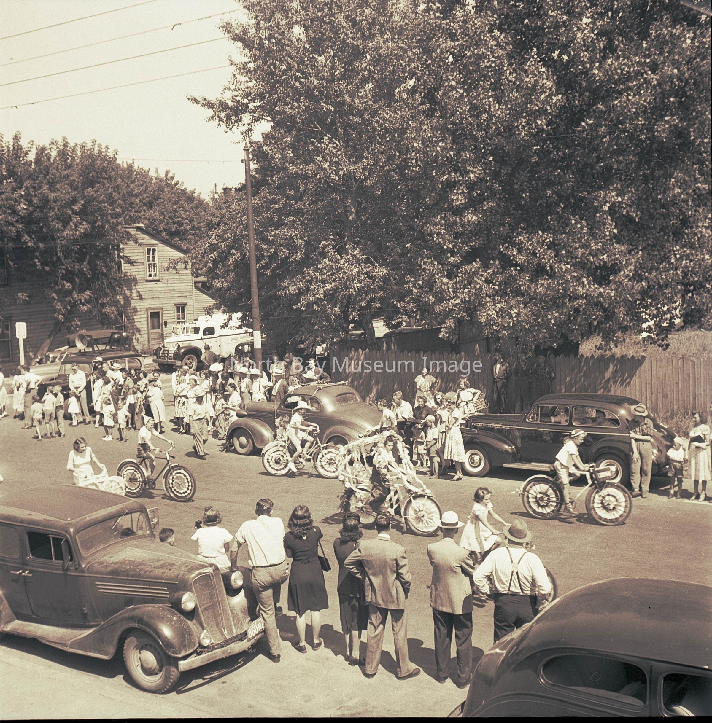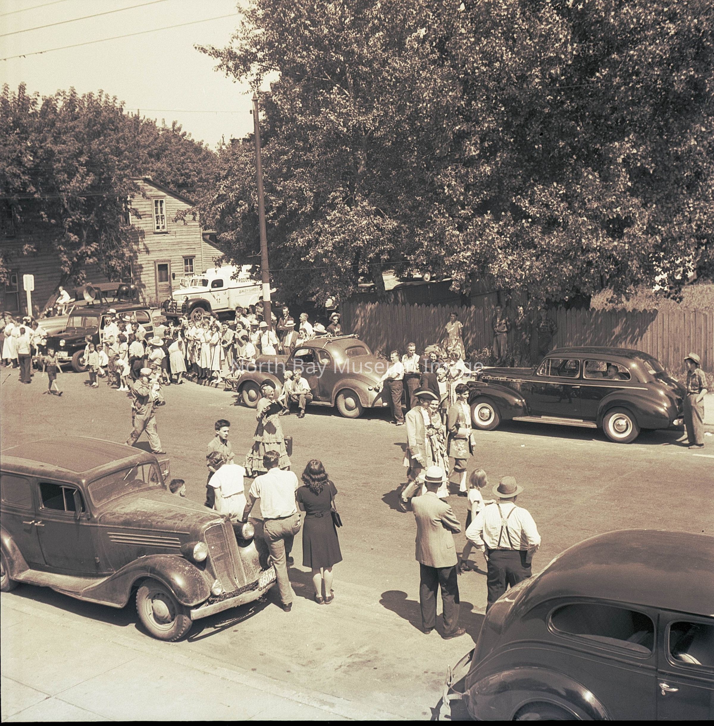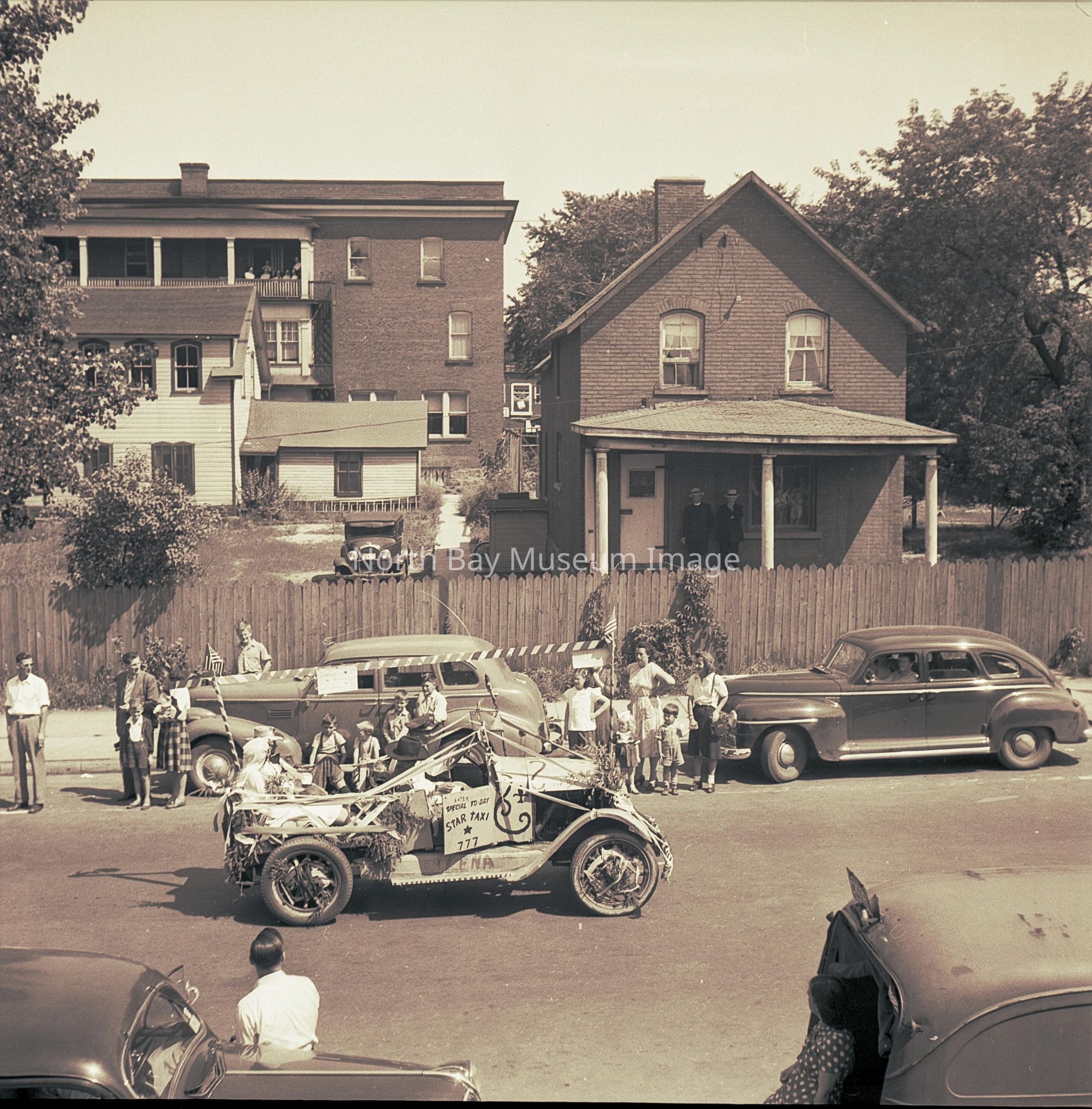 Photographer's Envelope (a) holds prints and negatives (b-x) of the Old Home Week Parade in 1948. In most photo's, we see pedestrians lined up on the side of the road watching the parade.