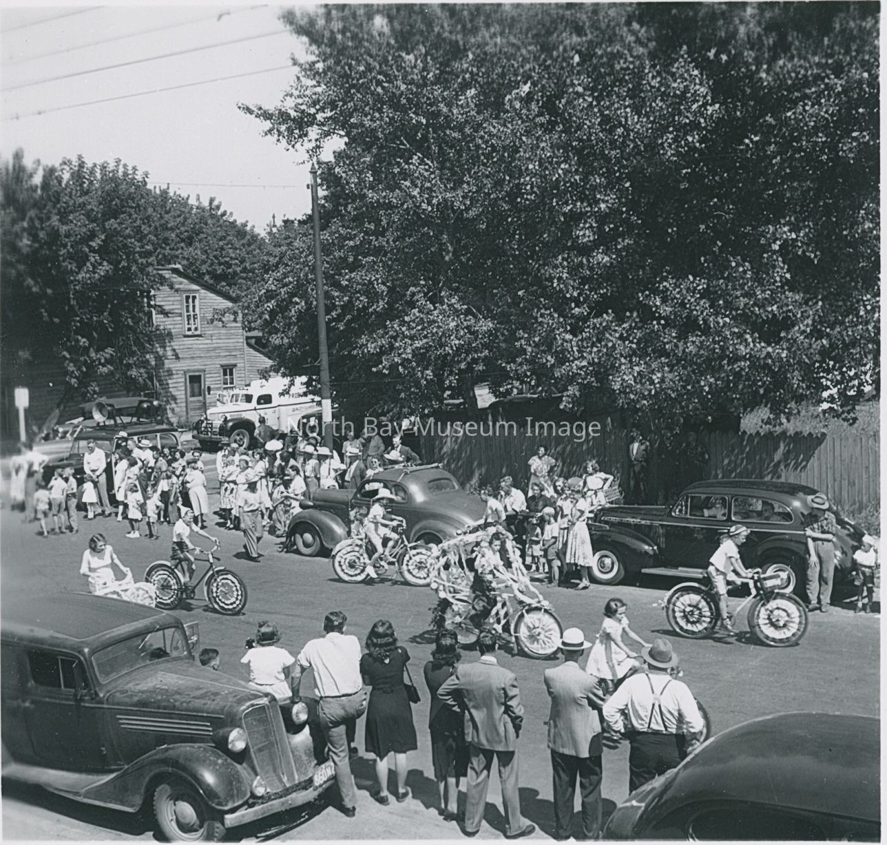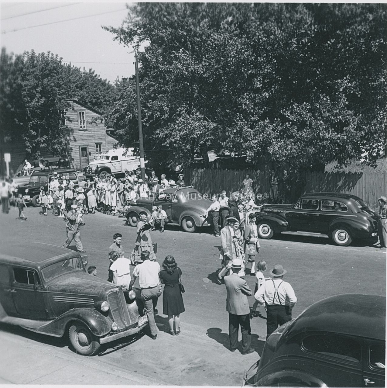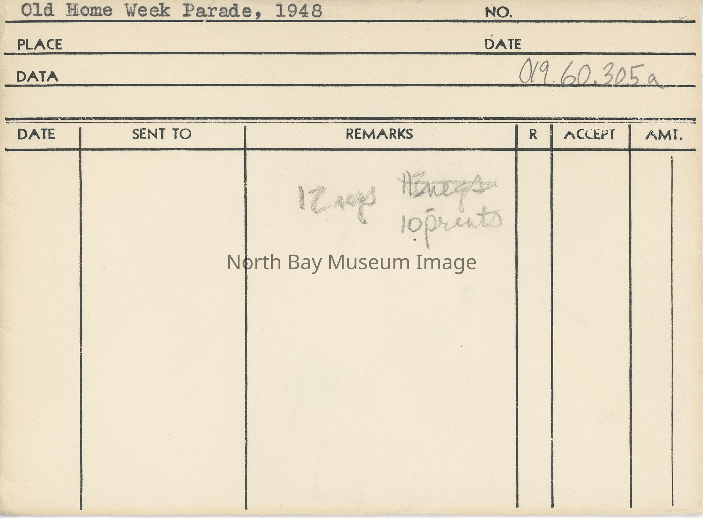 Photographer's Envelope (a) holds prints and negatives (b-x) of the Old Home Week Parade in 1948. In most photo's, we see pedestrians lined up on the side of the road watching the parade.
