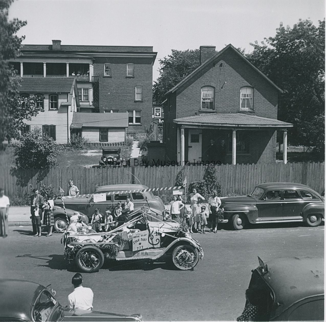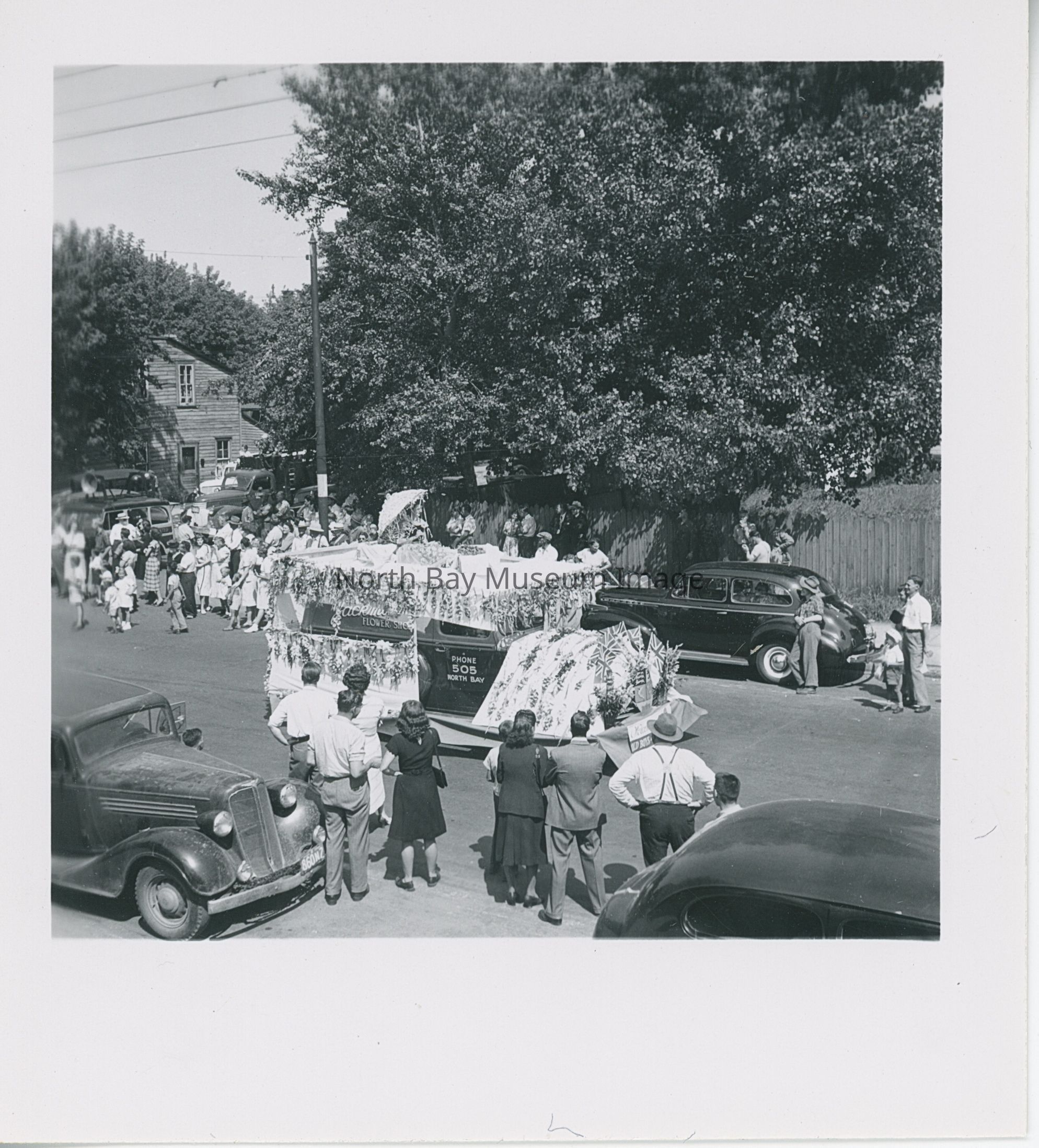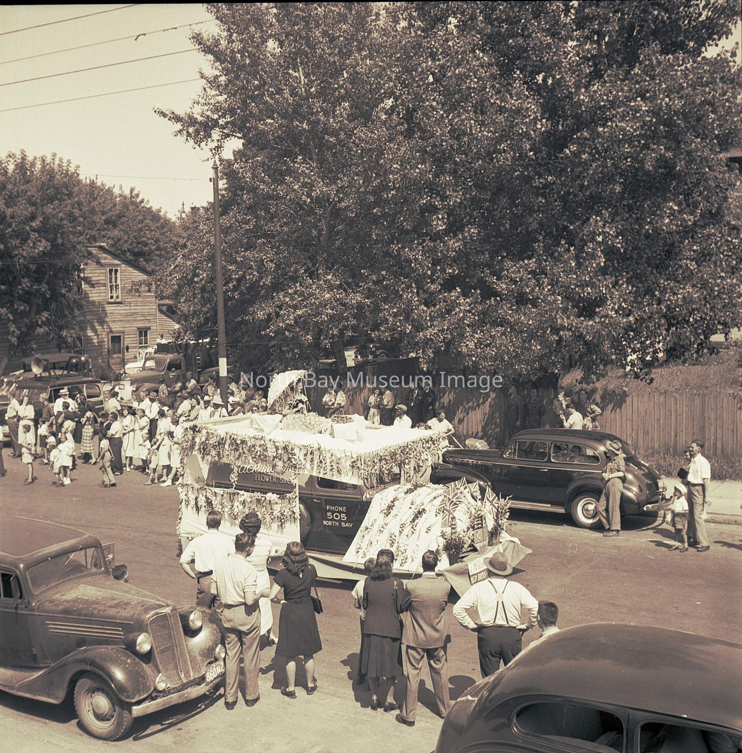 - Print (g) belongs with negative (r). Shows decorated flower car, reads on door: "Phone 505 North Bay".