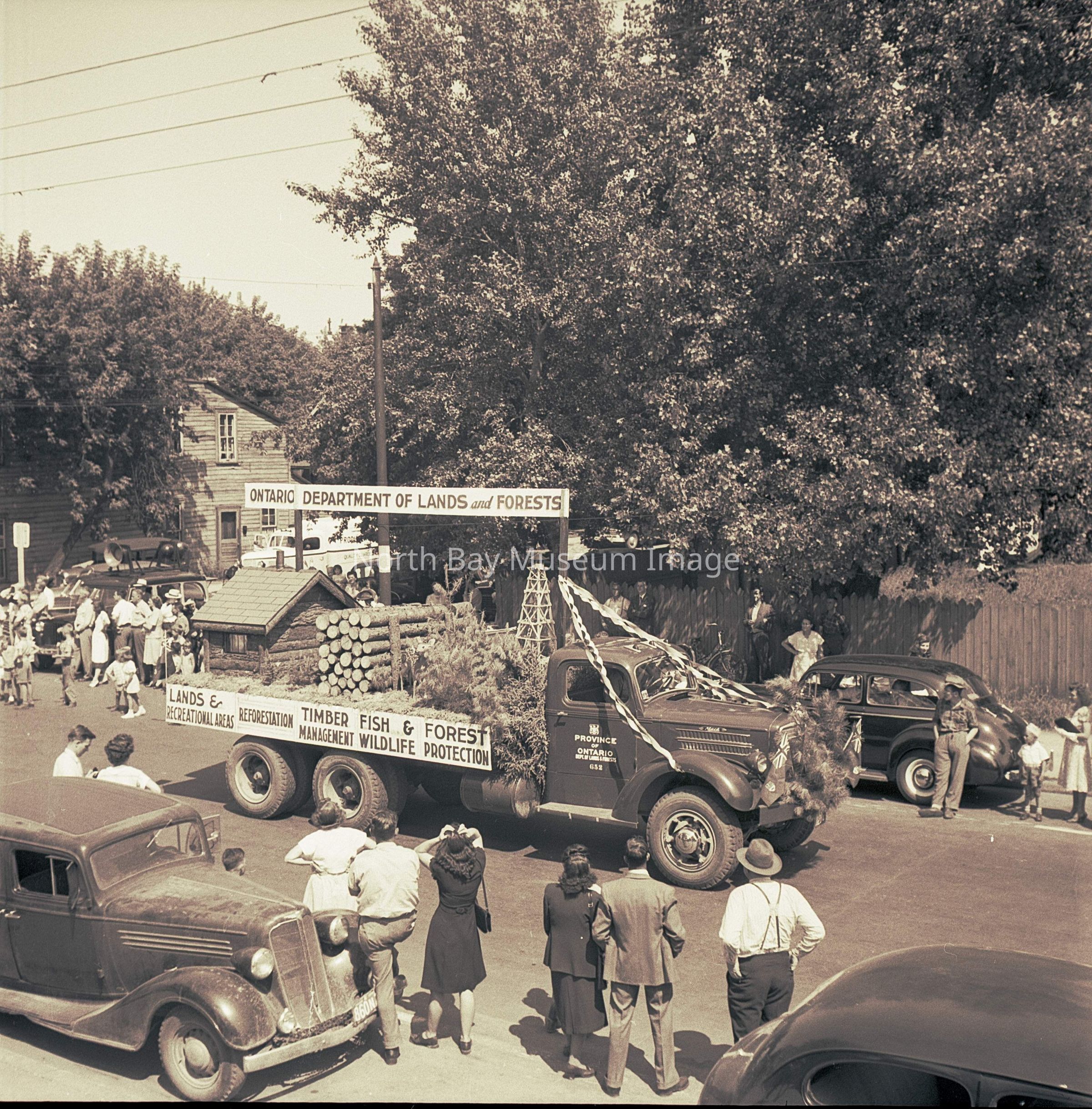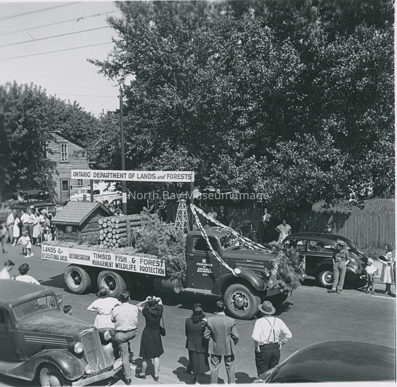 - Print (f) belongs with negative (q). Shows large truck with decorated flat bed, reads: "Ontario Department of Lands & Forests" & "Lands & Recreational Areas \ Reforestation \ Timber, Fish & Forest Management Wildlife Protection".