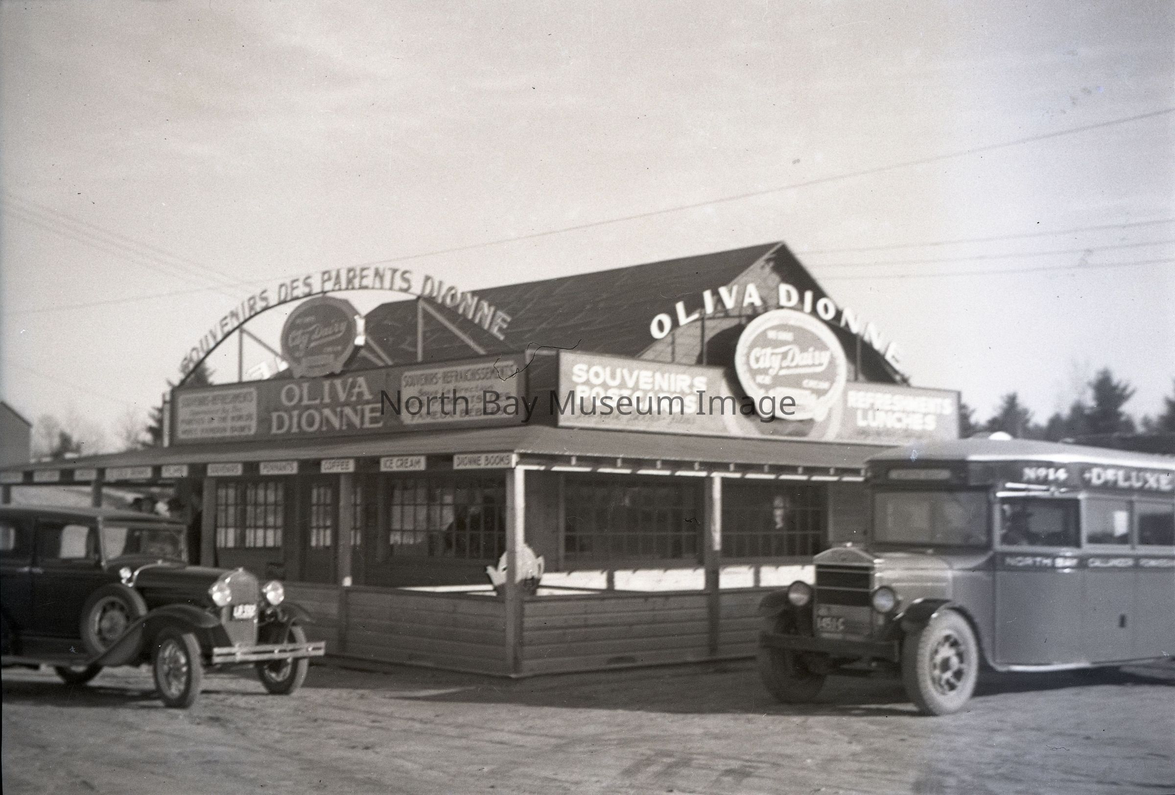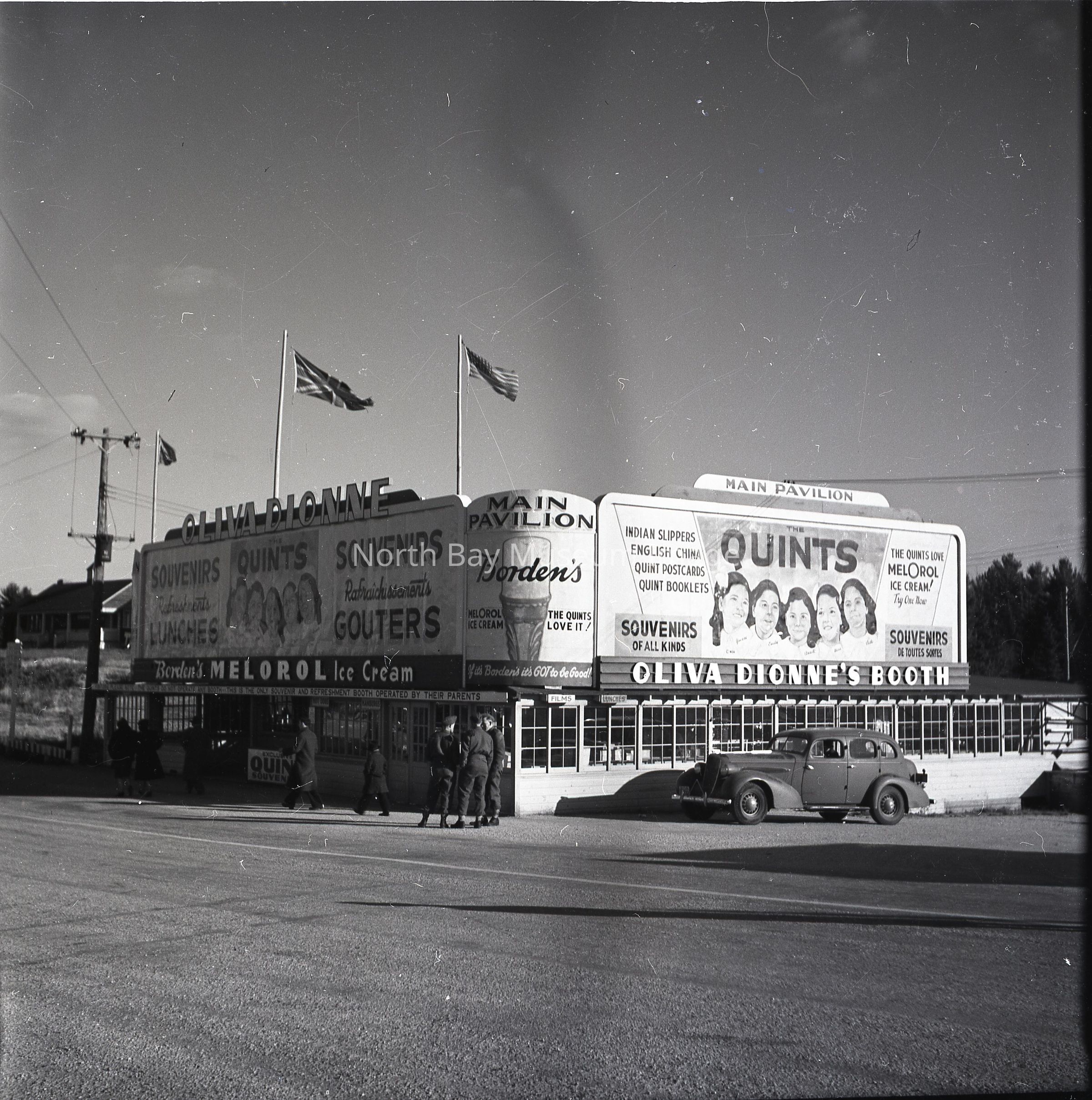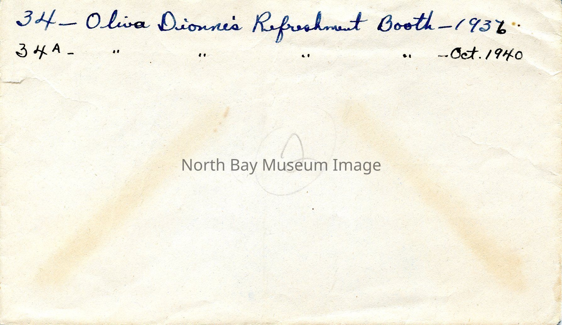 Photographer's Envelope (a) contains the photograph and negatives (b-d) of Oliva Dionne's Refreshment Booth. The image shows a carnival like booth as well as crowds outside waiting. This image shows the extent of the attraction built around seeing the Dionne Quintuplets. A part of the Forder Collection.Creator