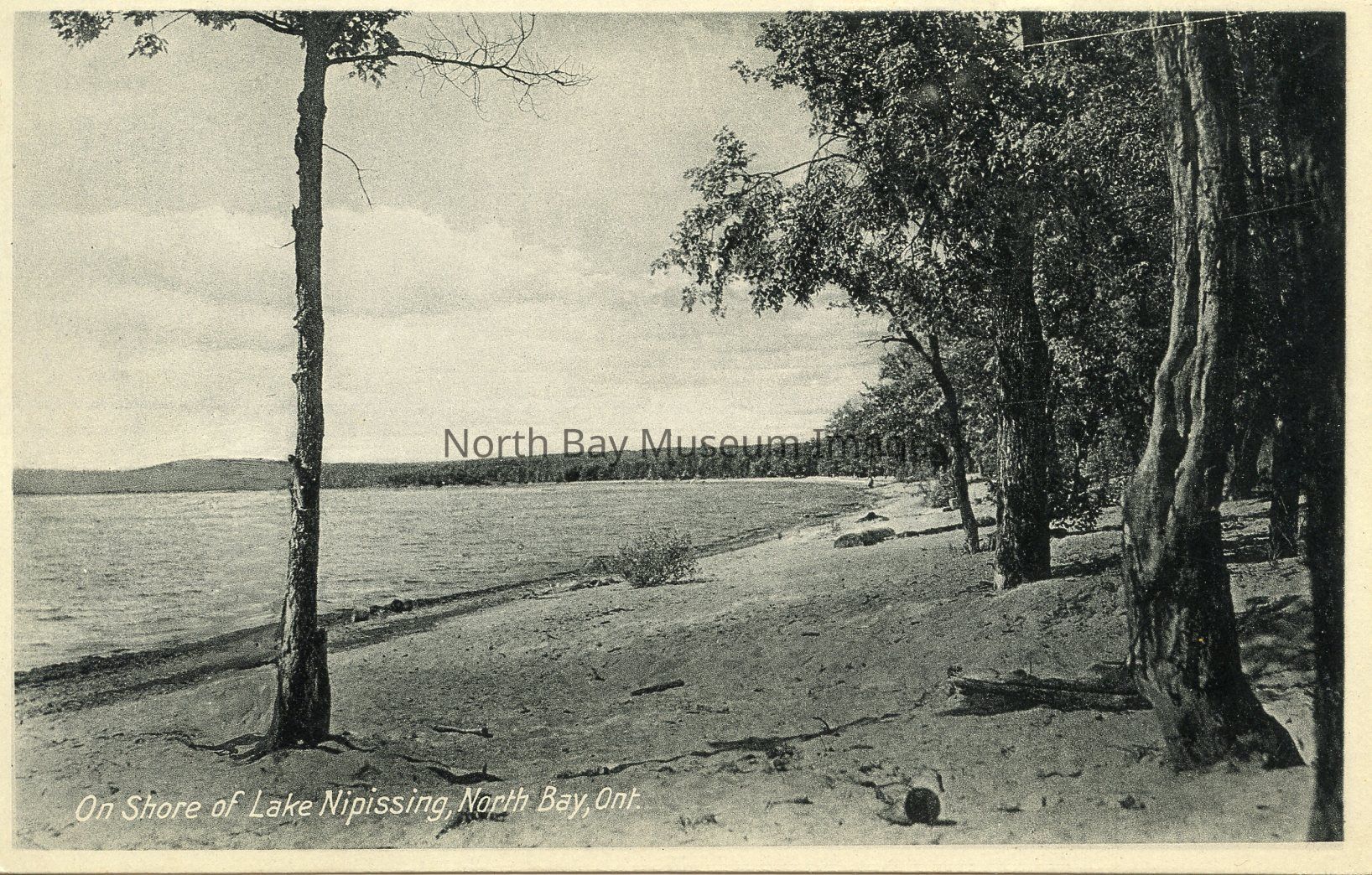 This is a Black & white postcard picture of Lake Nipissing. There are trees in foreground. You are able to see the curving shoreline. The water appears to be calm.