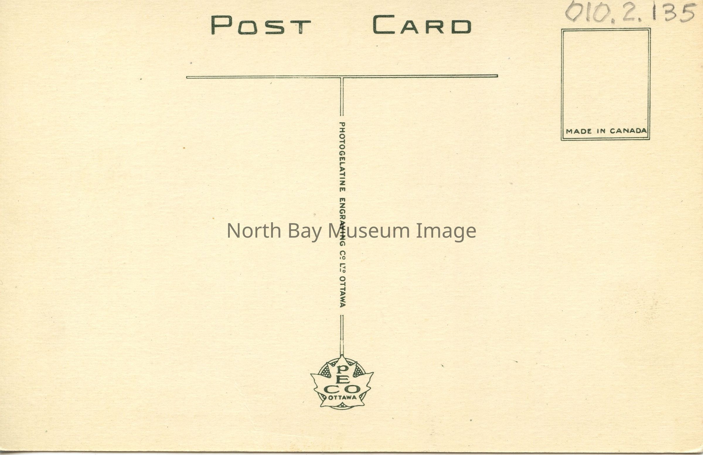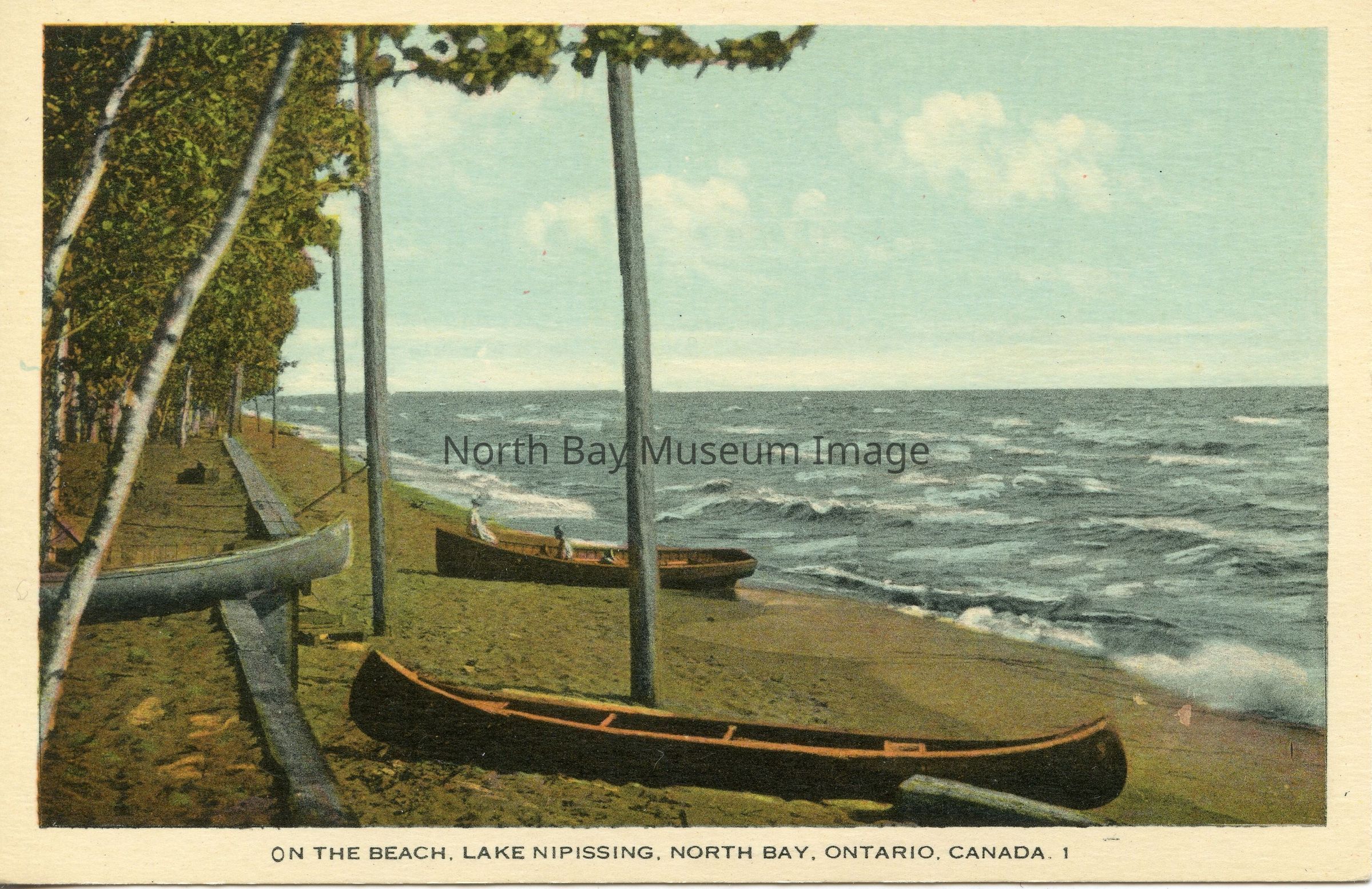 Postcard with color photo of beach scene looking south along shoreline. Large rowboat on shore with two children sitting in it. Also a canoe on the beach. Shore is lined with birch trees on left side of photo.