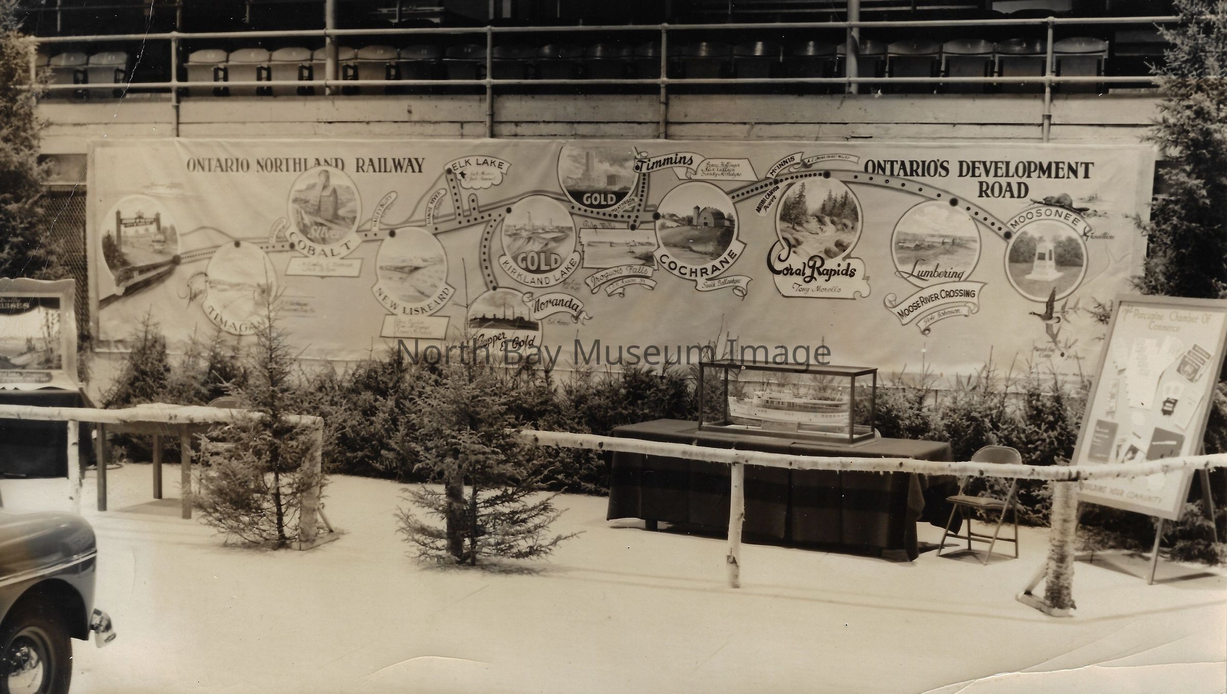 022.27.01bw: Ontario’s development road, the Ontario Northland Railway, exhibit at the Northern Ontario Exhibition, held in the McIntyre Community Building, Schumacher, September 1951.