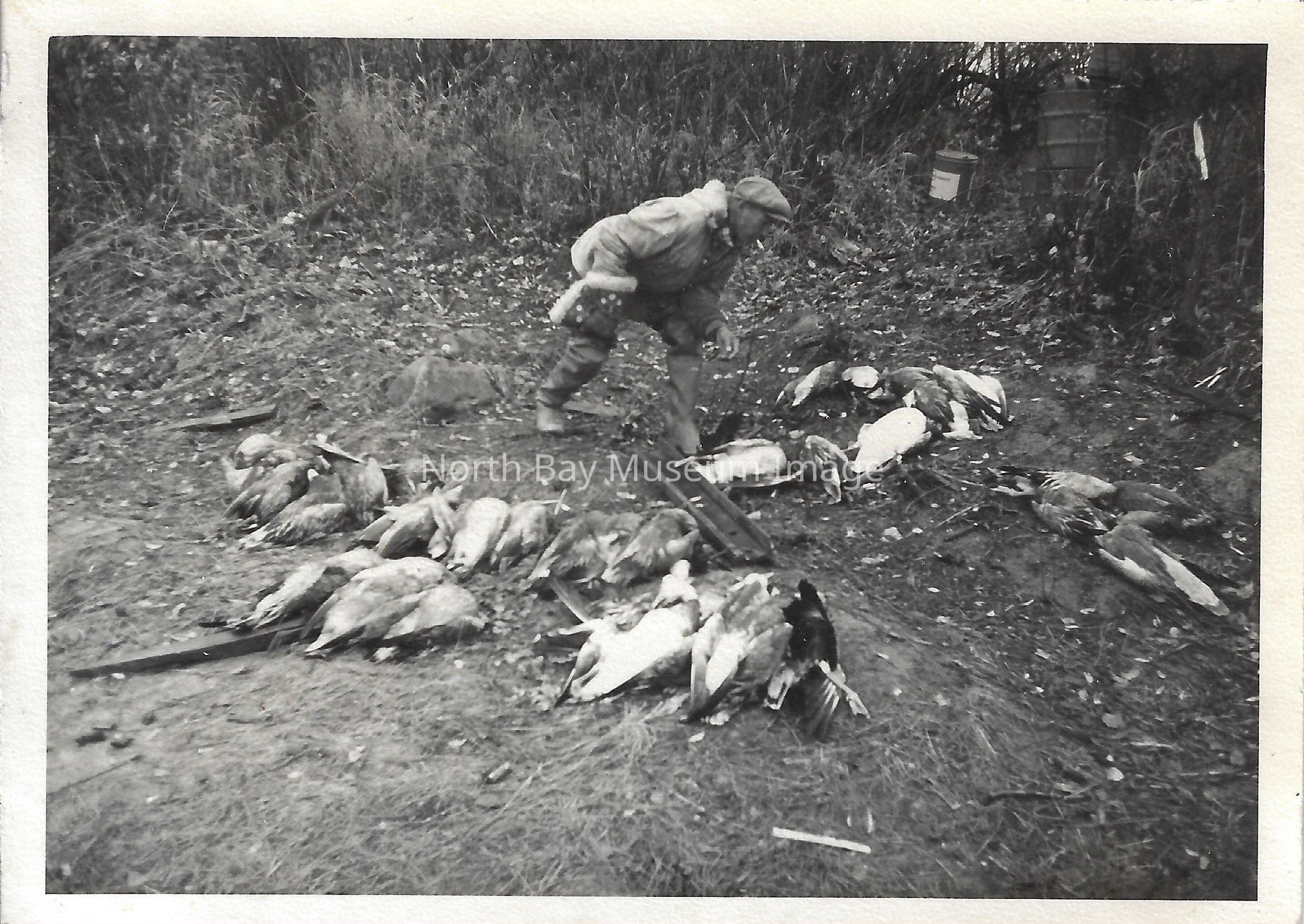 022.27.01ag: Man smoking next to hunted bird carcasses.