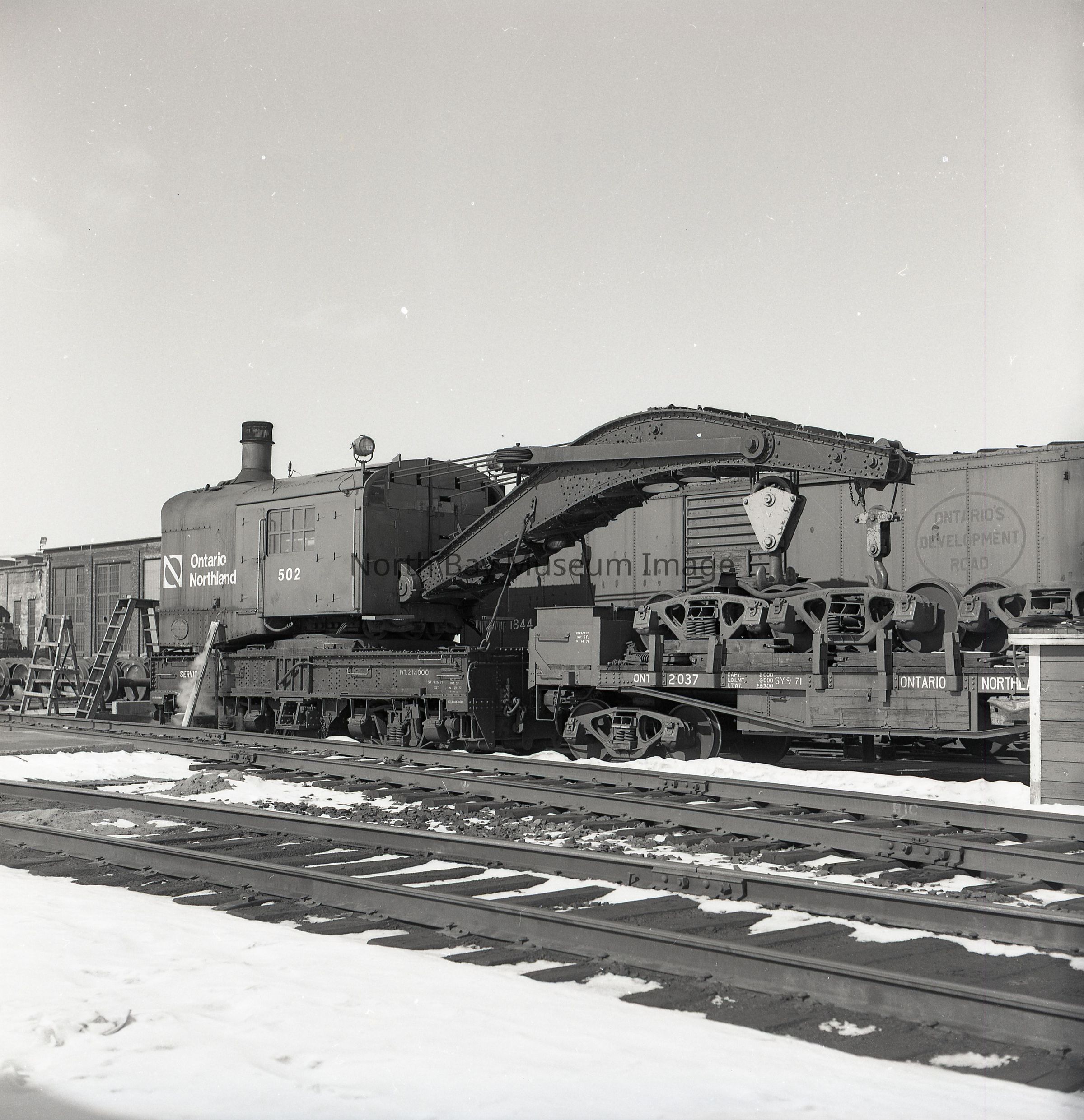 019.60.427d-g - Photos of crane 502 with flat car, one photo also shows trucks sets
