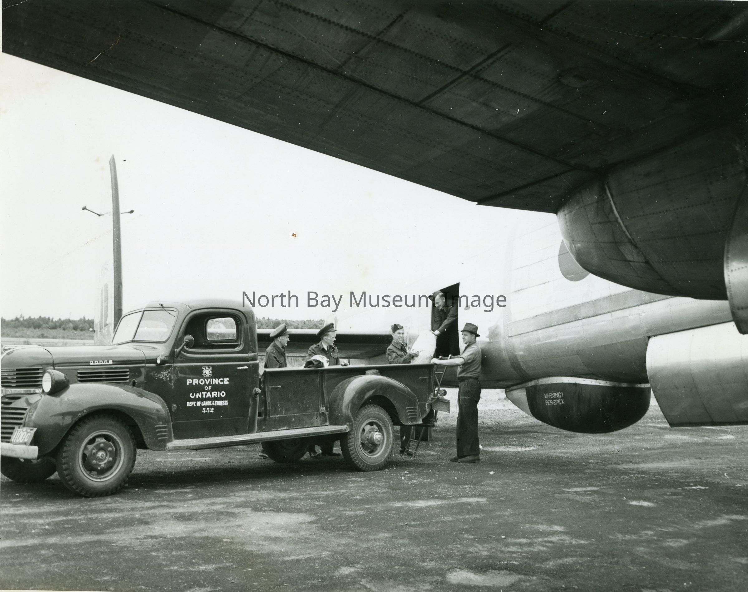 a-Photo of Province of Ontario loading barrels onto plane at North Bay airport