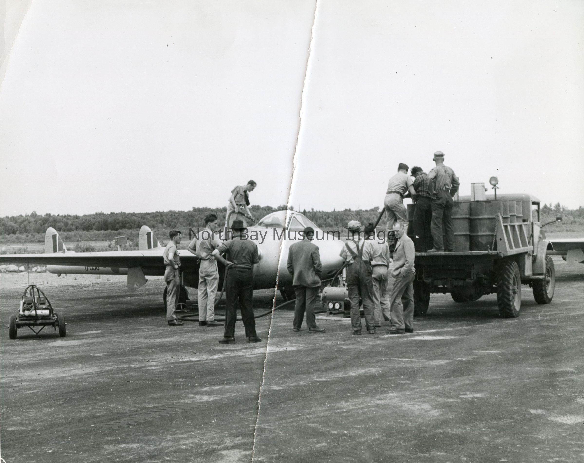 b- Photo of barrels of fuel being used to fill small plane at North Bay airport.