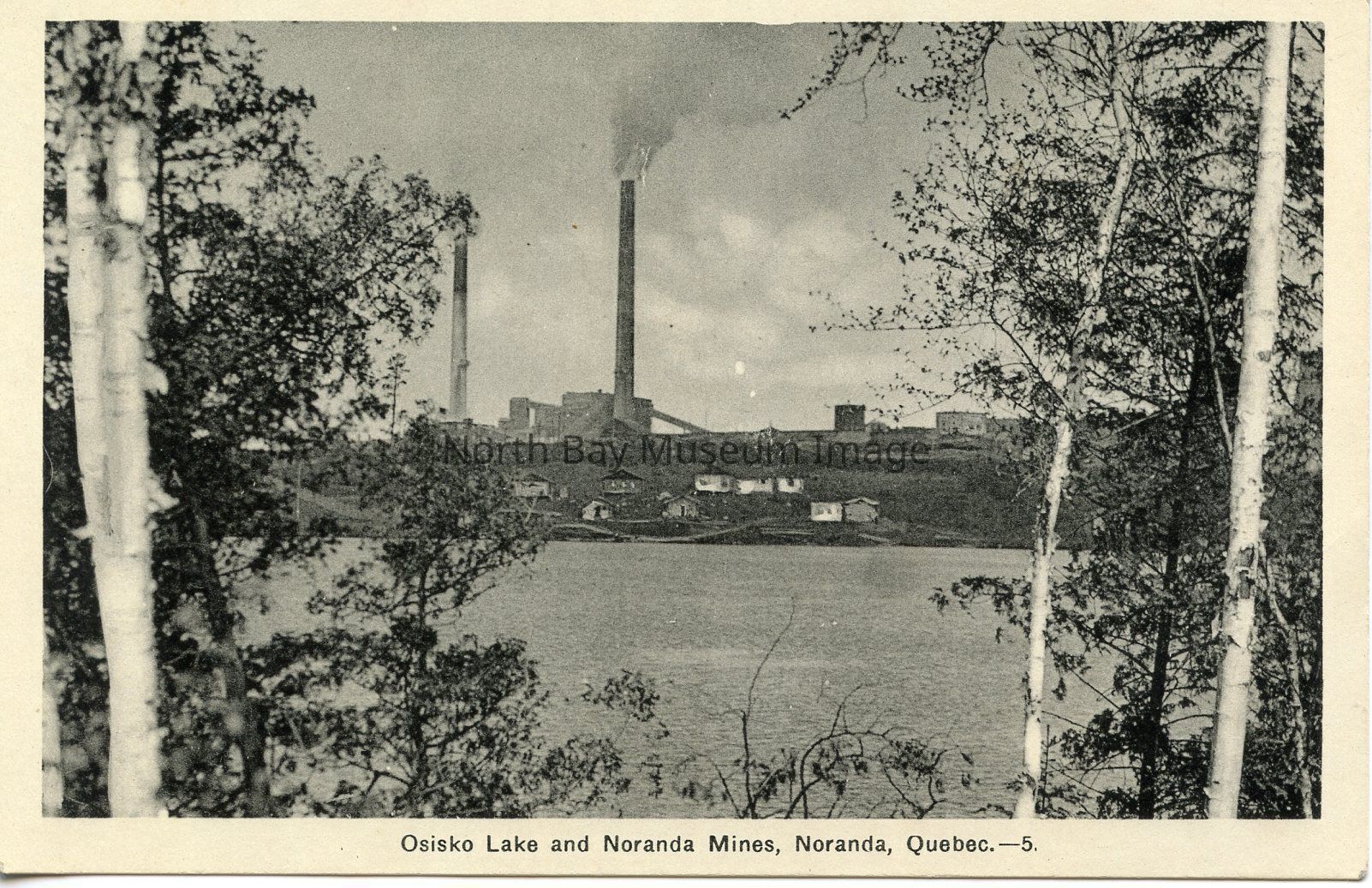 This is a black and white Post card of Osisko Lake and Noranda Mines, Noranda, Quebec. The image is taken from across Osisko Lake looking through the trees at the Noranda Mines. There is a black cloud of smoke in the air. Various small buildings can be seen along the river bank in front of the mines.