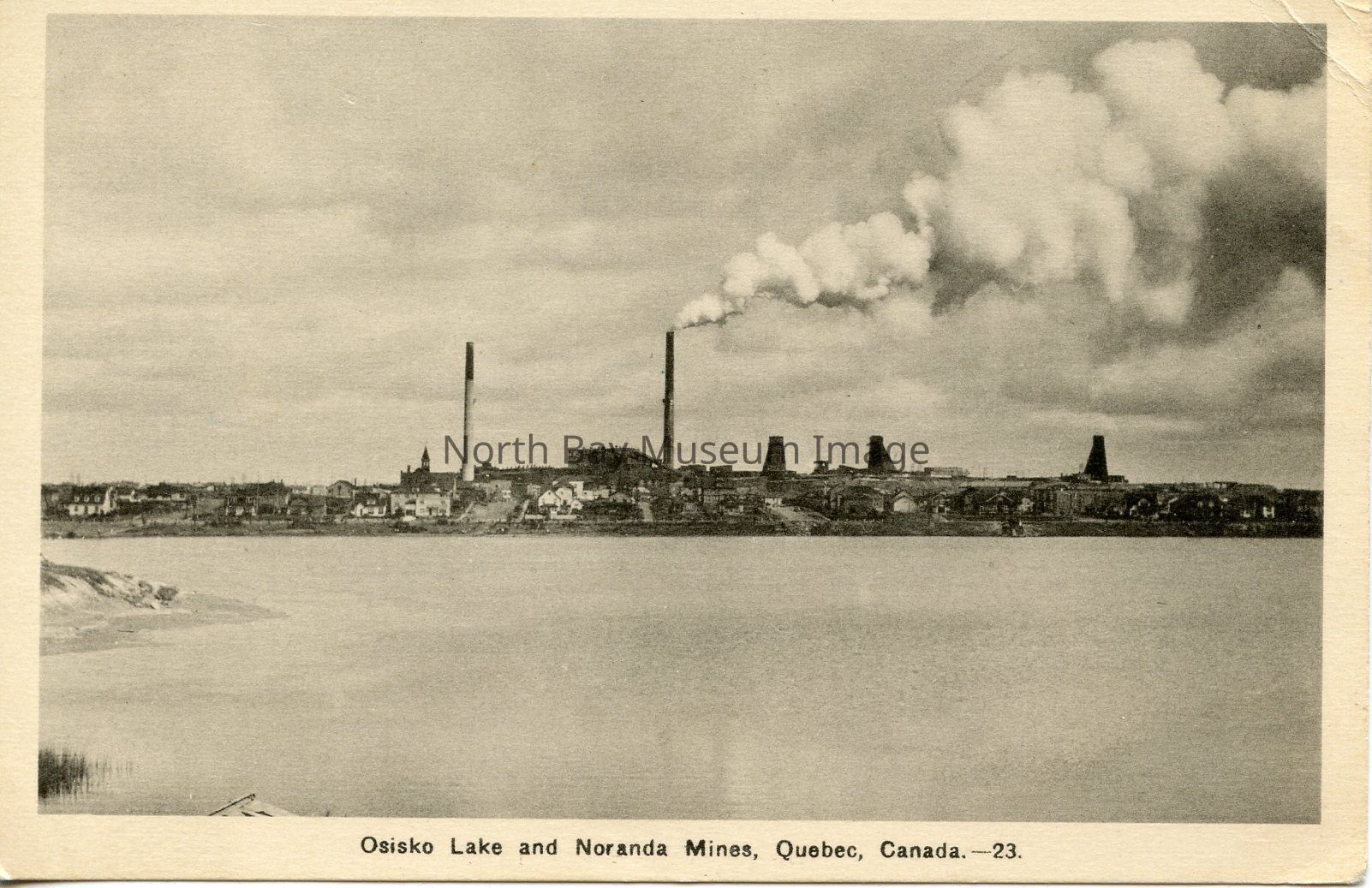 This is a black and white postcard of Osisko Lake and Noranda Mines, in Quebec, Canada. This is a clear image of the Nroanda Mines. The image is taken from accross the lake looking at the Mines, and the small town next to the mines. There are large plumes of smoke coming out of the Mines.